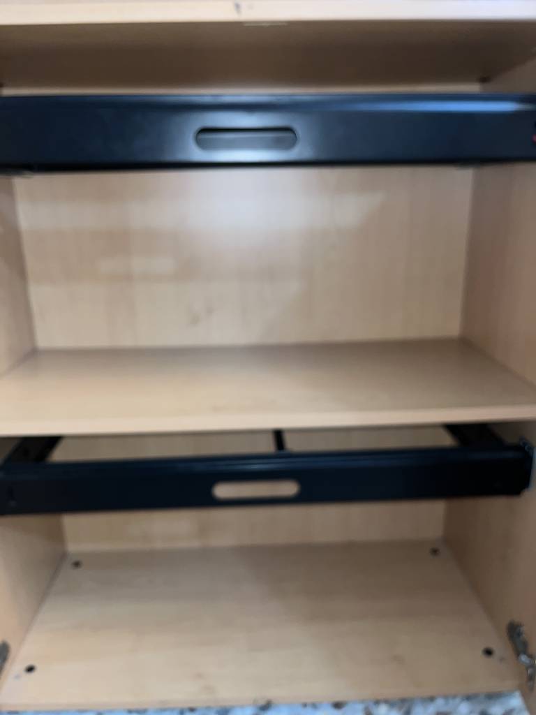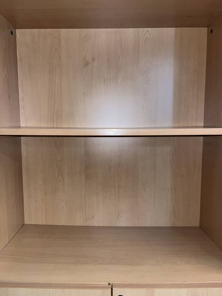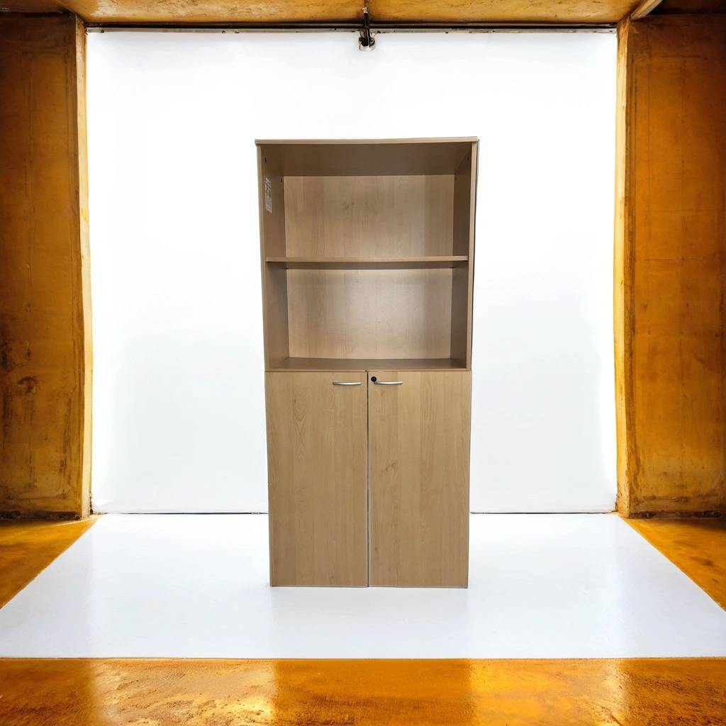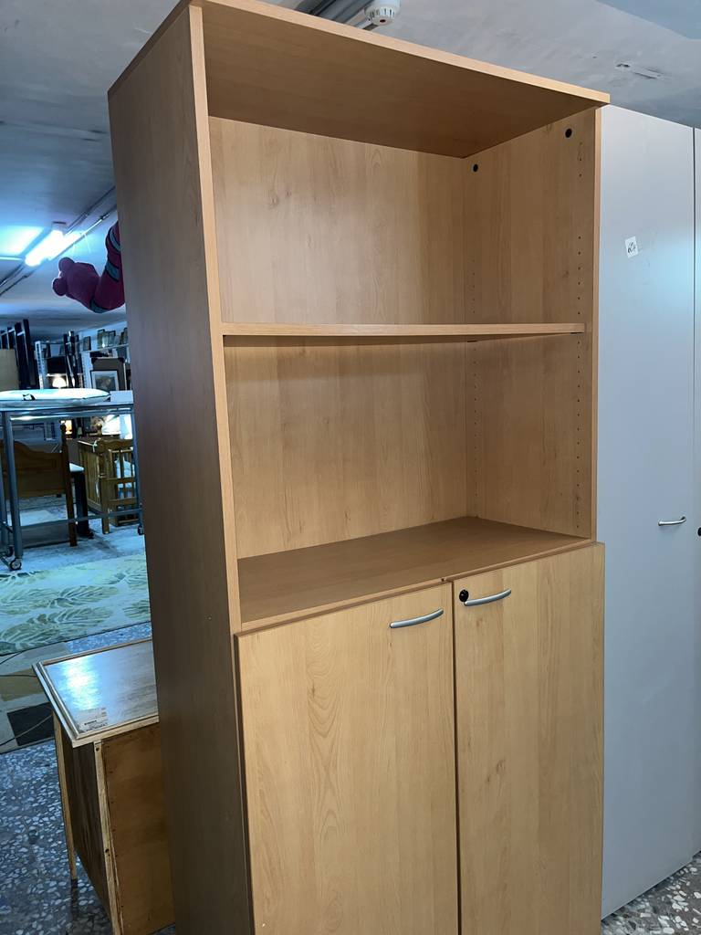 Armario de oficina fabricado en madera de buena calidad de color marrón claro. Se trata de un armario de oficina que cuenta con una balda y dos habitáculos en la parte superior y tiene dos pequeñas puertas en la parte inferior con tiradores metálicos en forma de asa. Es un armario ideal para una pequeña oficina o despacho. Como se puede observar en las fotografías se encuentra en buenas condiciones.