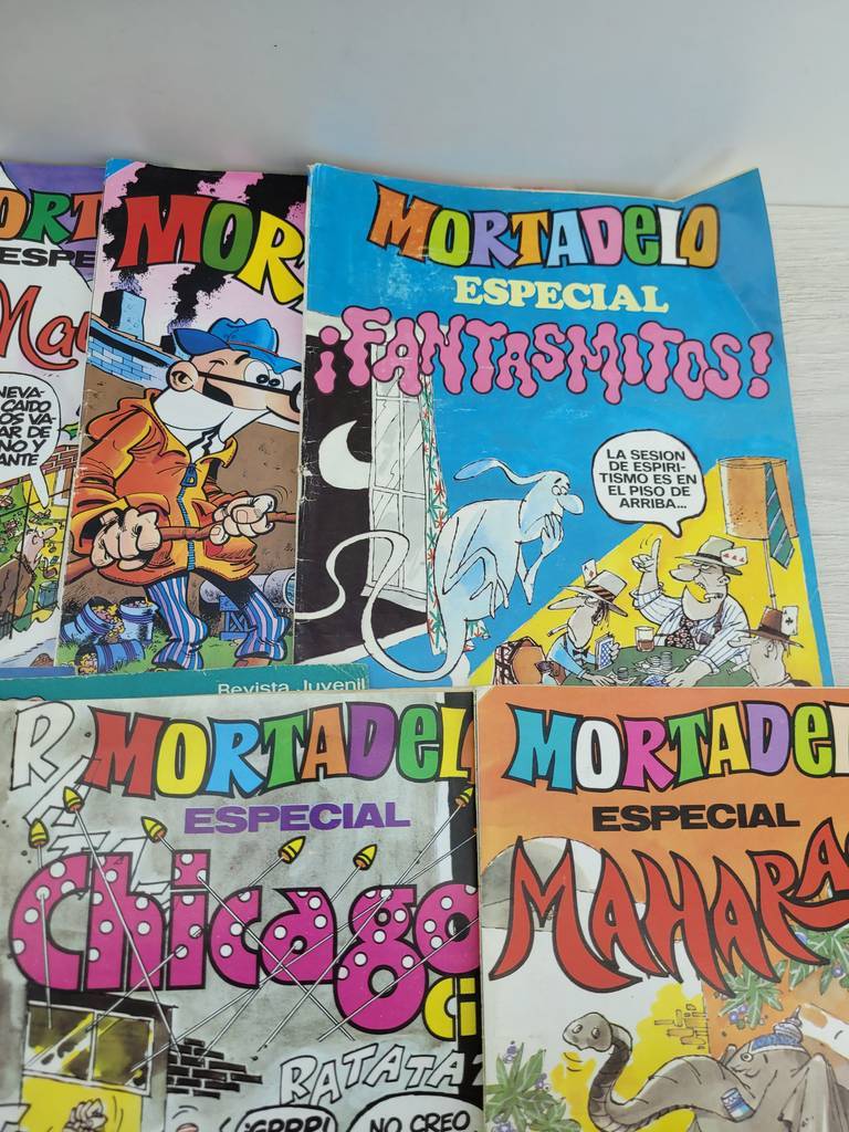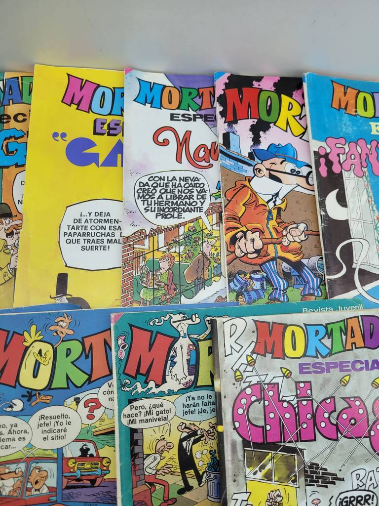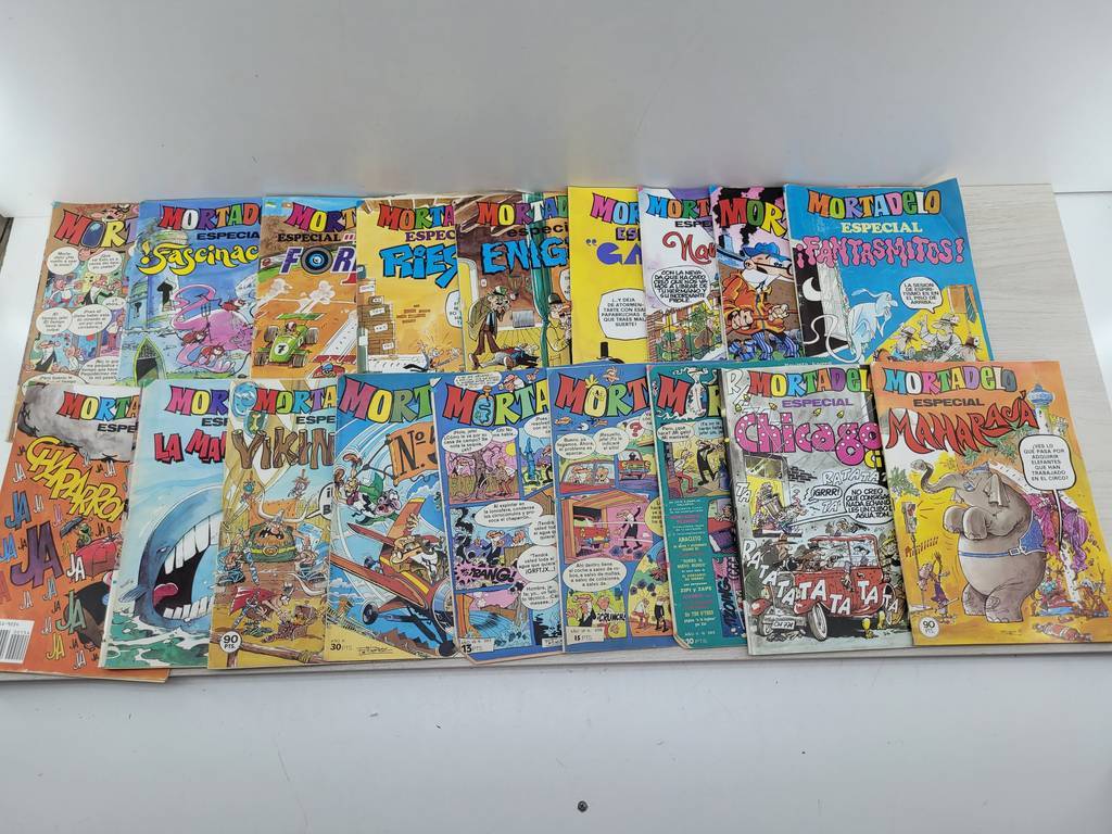 Lote de la colección de revistas “Mortadelo Especial” compuesto por 18 números. Los números son 35, 50, 54, 56, 71, 84, 99, 101, 116, 120, 122, 147, 154, 205, 302, 342, 356 y 500. Estas revistas vintage son ideales para completar una colección. Estos divertidos cómics son perfectos para pasar un entretenido rato. Como podemos observar en las fotografías se encuentran en buen estado.
