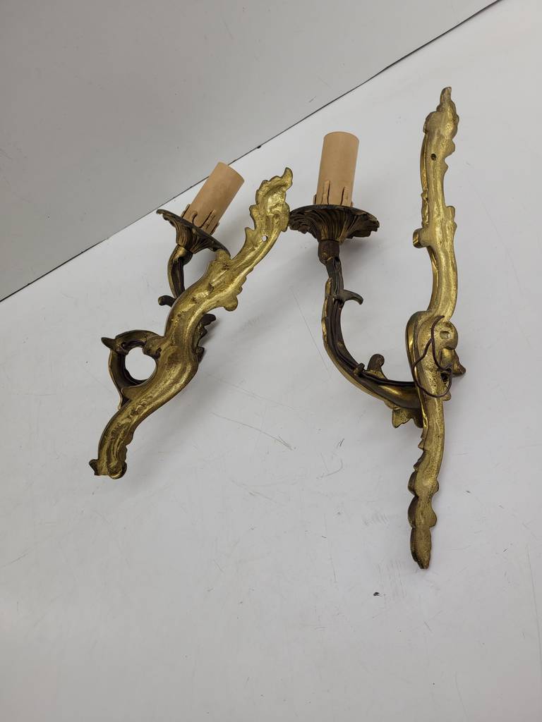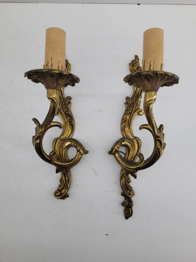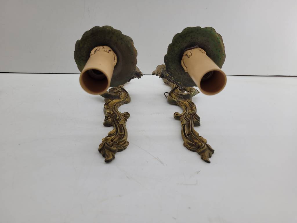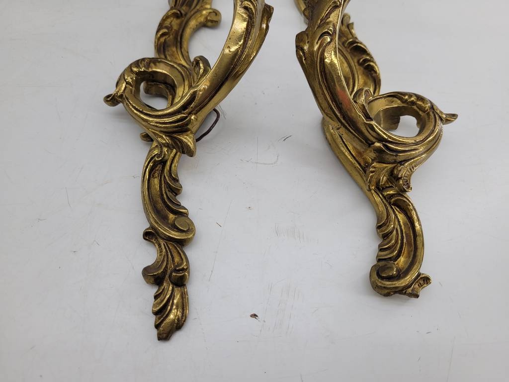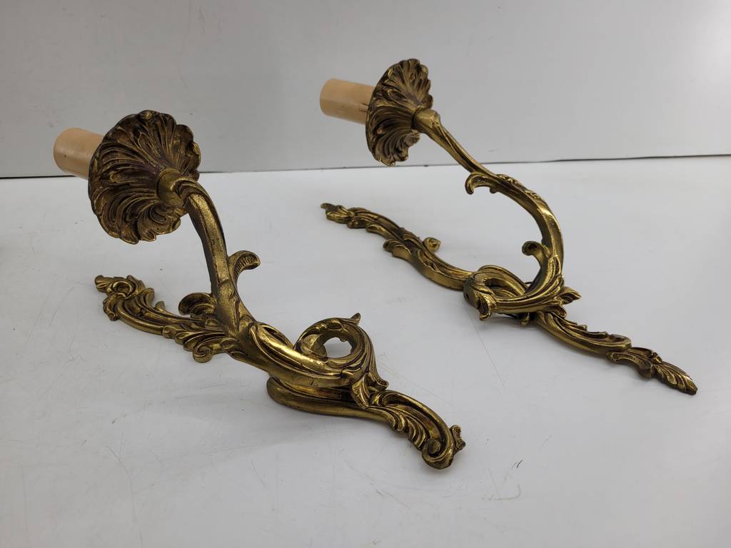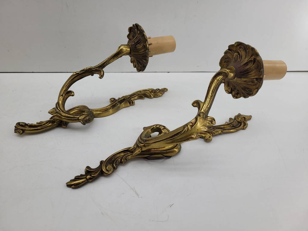 Pareja de apliques de pared ornamentales clásicos que han sido realizados en bronce con detalles y formas que los hacen resaltar. Son unos apliques que podemos colocar en, por ejemplo, el pasillo de nuestra casa aportándole un toque elegante y único. Incorpora cada uno una luz en forma de vela. Como podemos observar en las fotografías presentan un ligero desgaste.