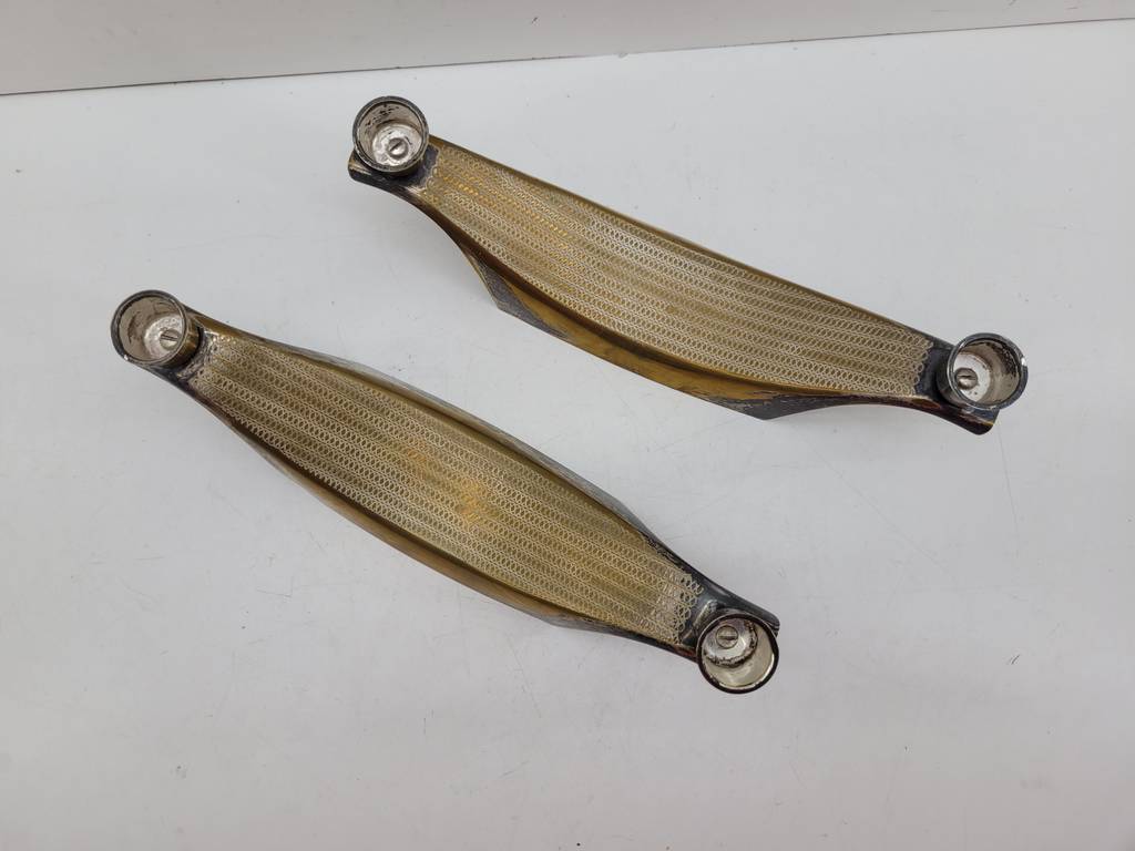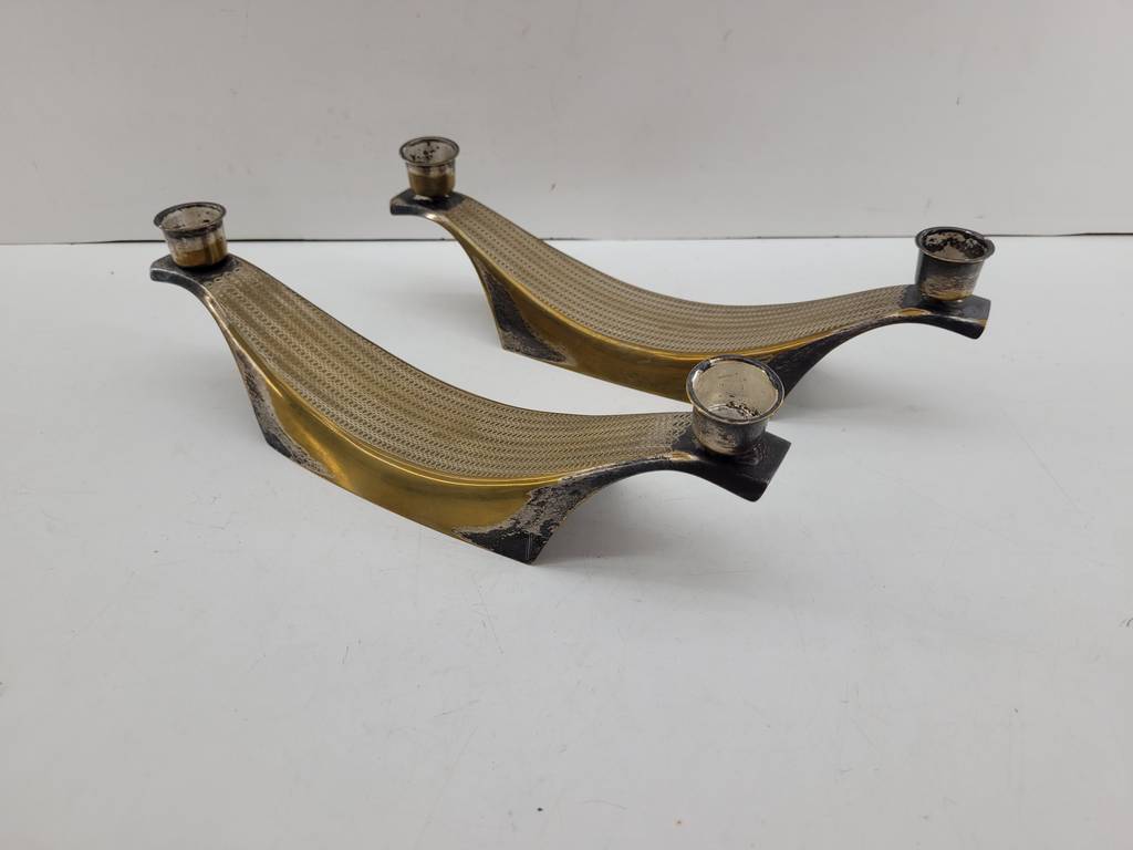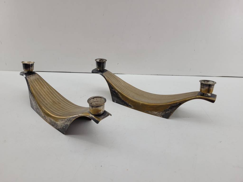 Pareja formada por dos candelabros con una original forma alargada y curva de color dorado y negro. Se trata de dos candelabros en los que se pueden colocar dos velas en cada uno. Estos candelabros son perfectos para ponerlos encima de una mesa en un salón comedor con unas bonitas velas. Como se puede observar en las fotografías se encuentran en buenas condiciones.