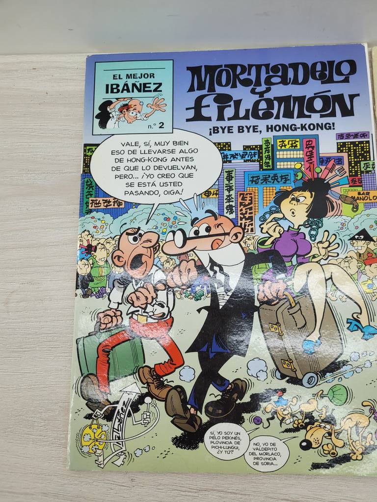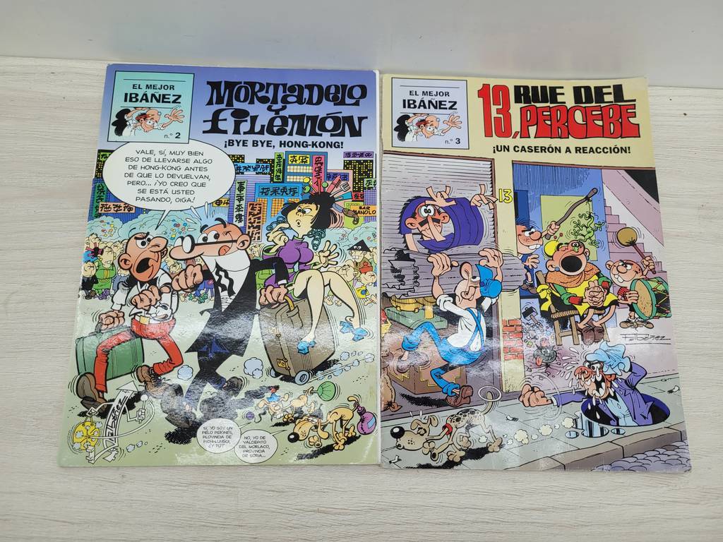 2 cómics pertenecientes a la colección de “El mejor Ibañez”. Se trata del nº 2 de Mortadelo y Filemón ¡BYE BYE, HONG-KONG! y del nº 3 de 13, Rue del percebe ¡UN CASERO A REACCIÓN!. Son unos cómics ideales para completar la colección o para amantes de este tipo de cómics españoles divertidos. Como podemos observar en las fotografías se encuentran en buenas condiciones.