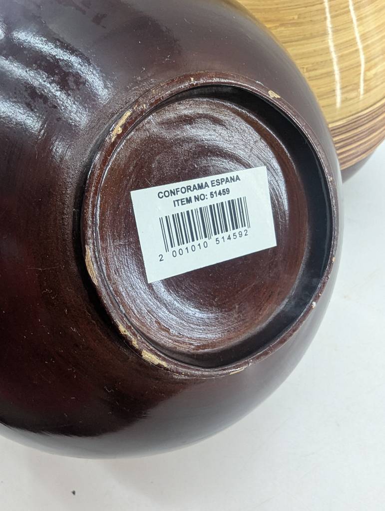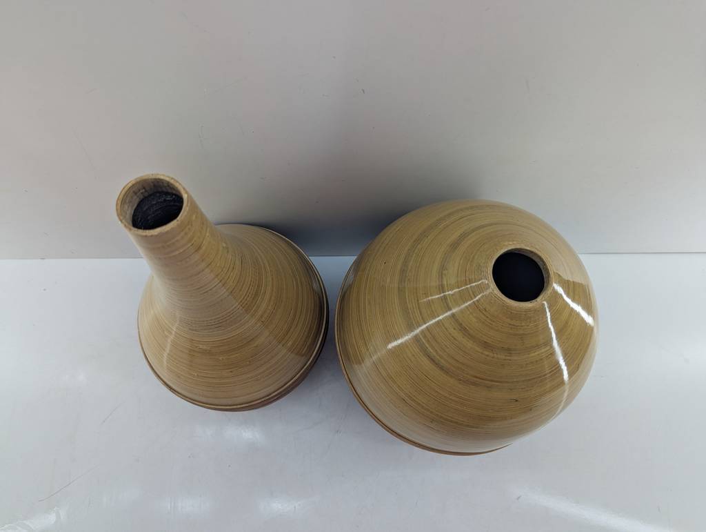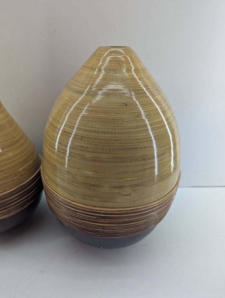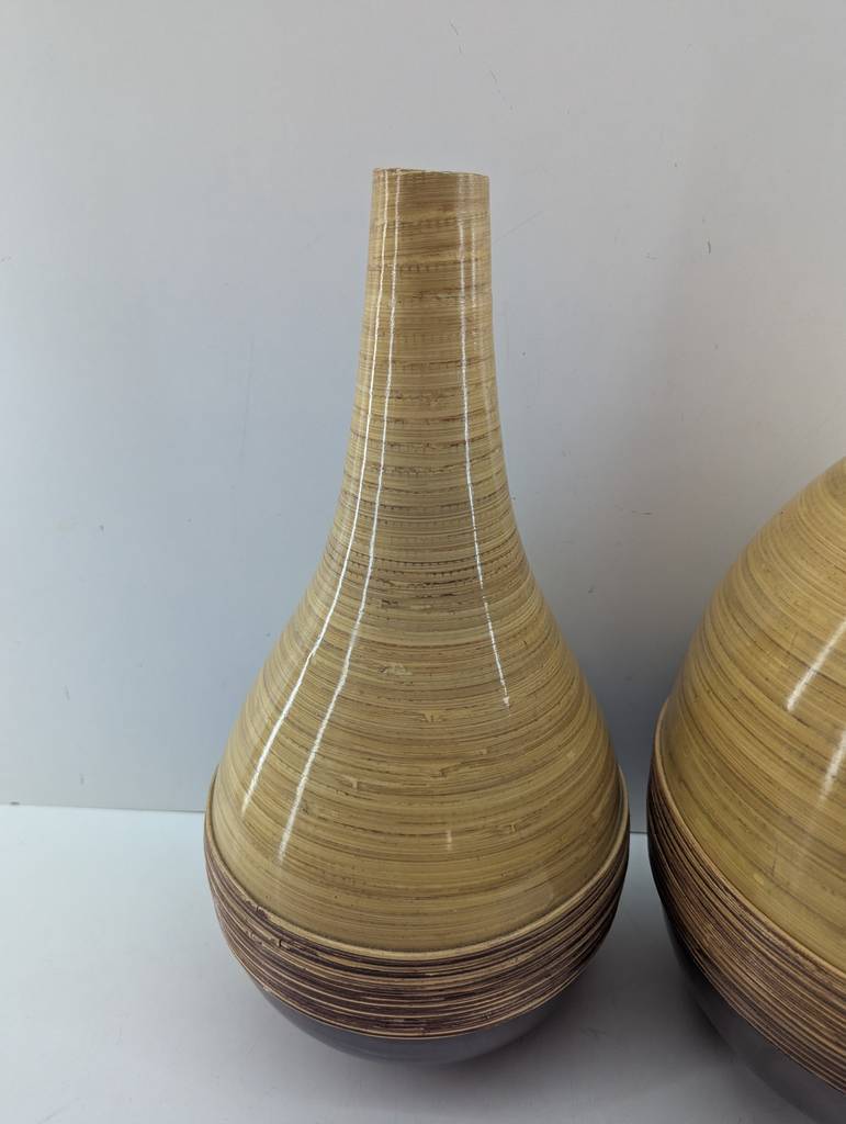 Pareja formada por dos jarrones decorativos fabricados en bambú y madera de buena calidad de color marrón oscuro y marrón claro. Se trata de dos jarrones decorativos, uno más redondeado y el otro más alargado. Estos jarrones resultan ideales para colocarlos en un salón comedor y ponerles flores dentro. Como se puede observar en las fotografías se encuentran en buenas condiciones.