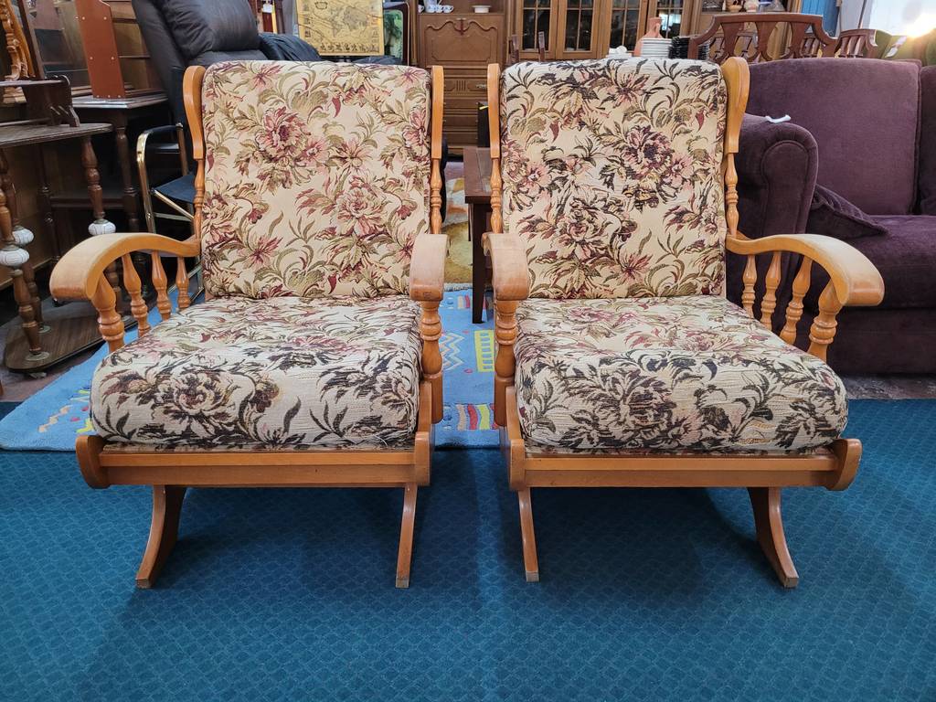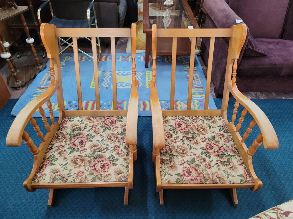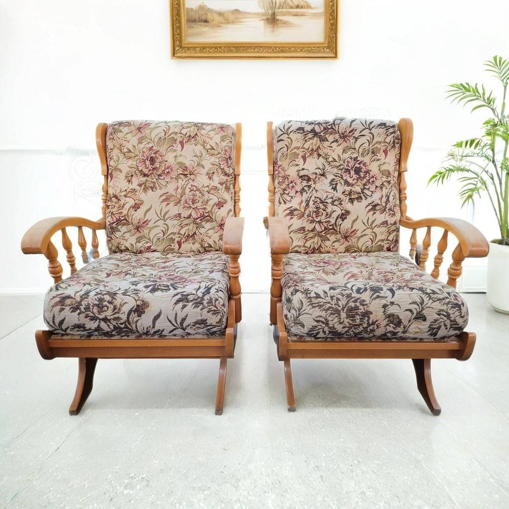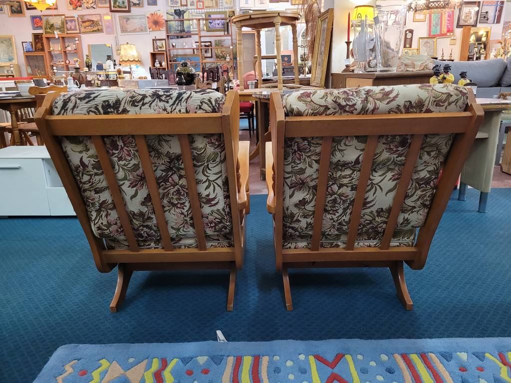 Pareja formada por dos mecedoras de estilo clásico tapizadas con una tela de flores rosas. Se trata de dos mecedoras que tienen una estructura de madera de buena calidad y son ideales para ponerlas en un salón comedor. Como se puede observar en las fotografías las mecedoras se encuentran algo deterioradas por el paso del tiempo por lo que se recomienda cambiar el tapizado.