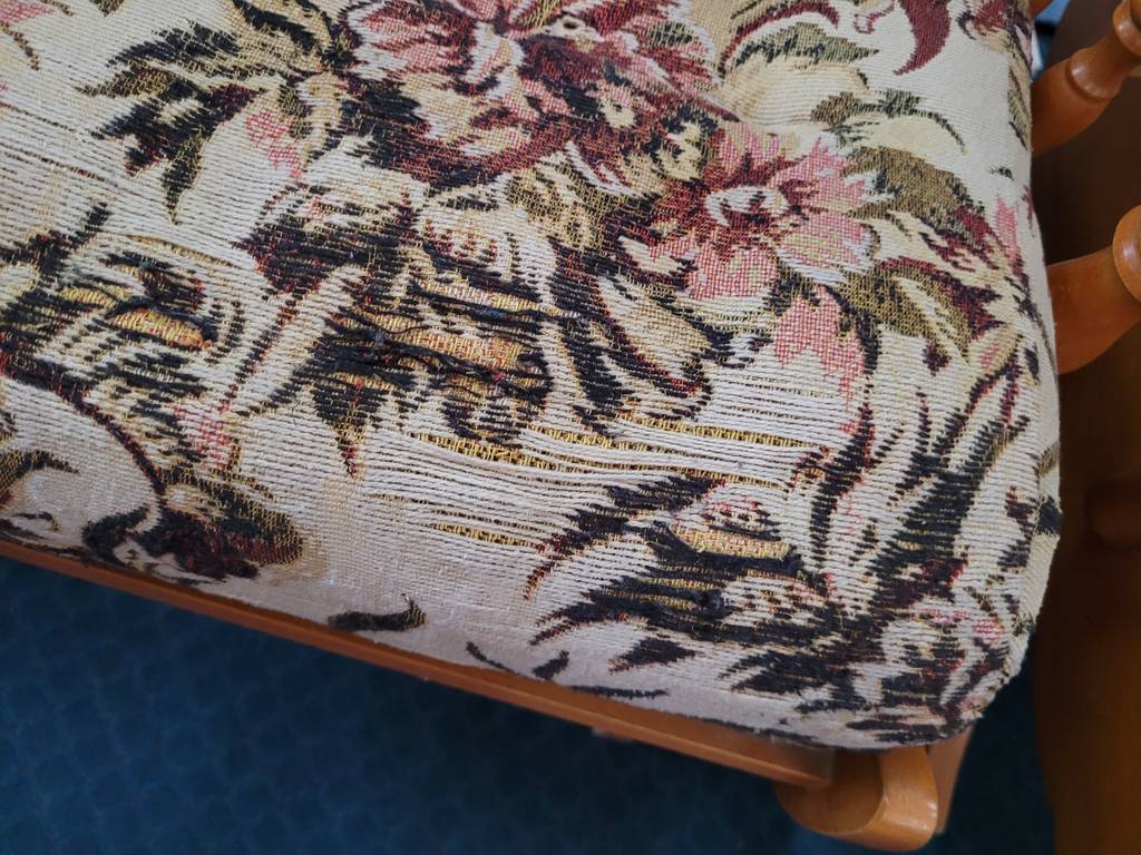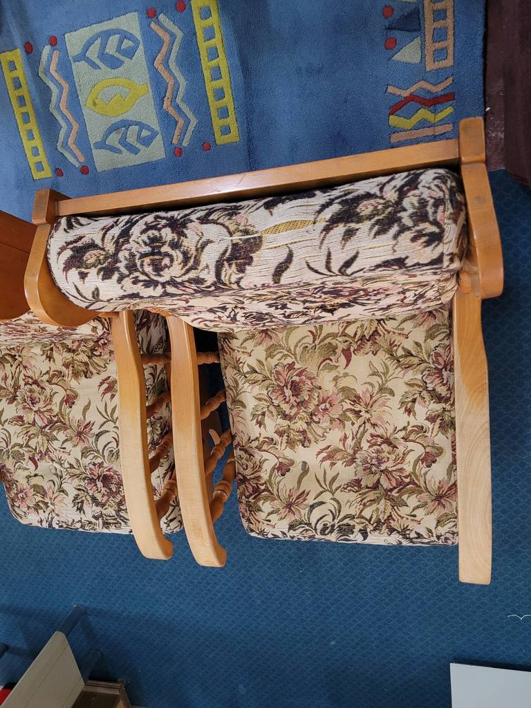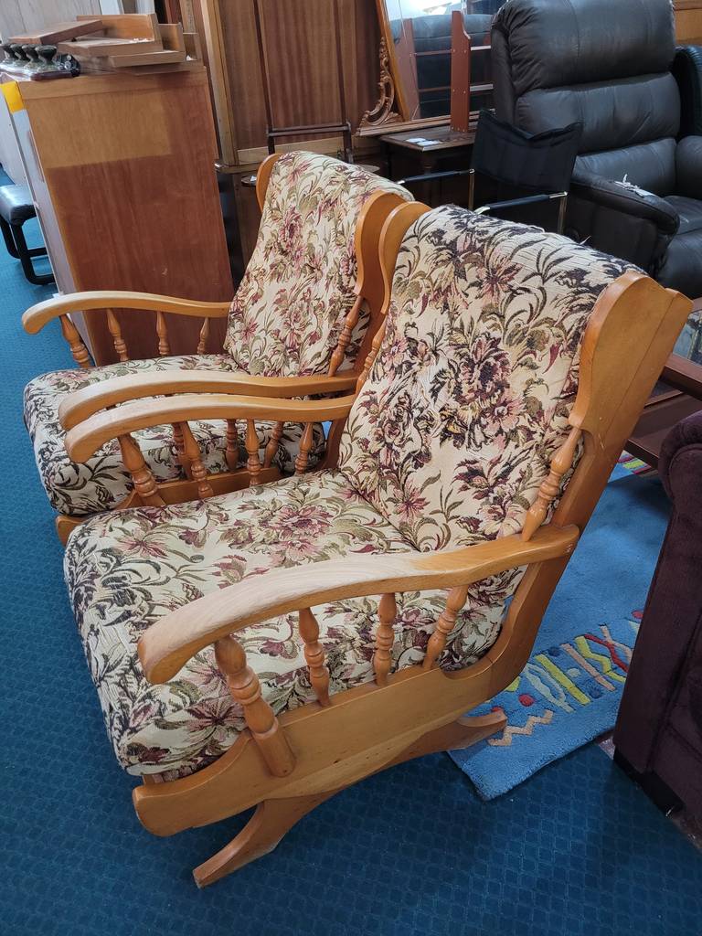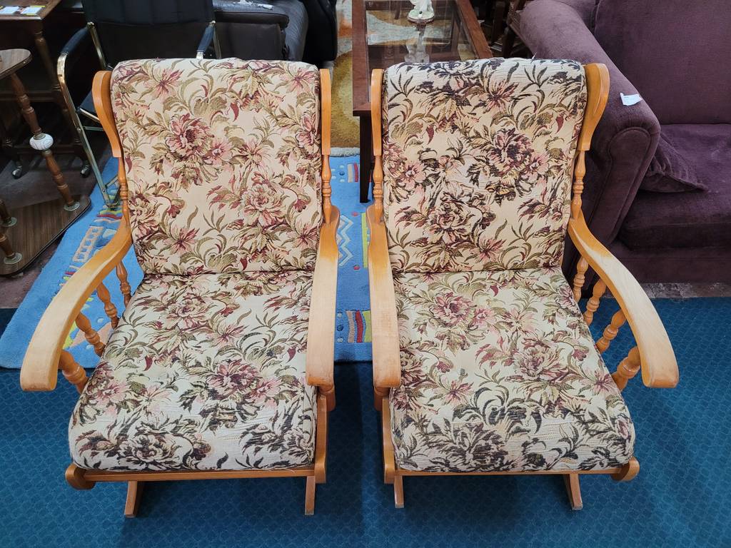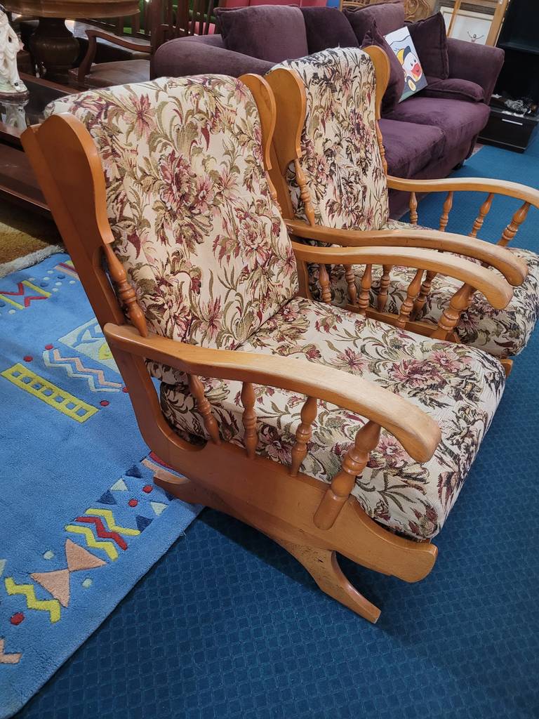 Pareja formada por dos mecedoras de estilo clásico tapizadas con una tela de flores rosas. Se trata de dos mecedoras que tienen una estructura de madera de buena calidad y son ideales para ponerlas en un salón comedor. Como se puede observar en las fotografías las mecedoras se encuentran algo deterioradas por el paso del tiempo por lo que se recomienda cambiar el tapizado.