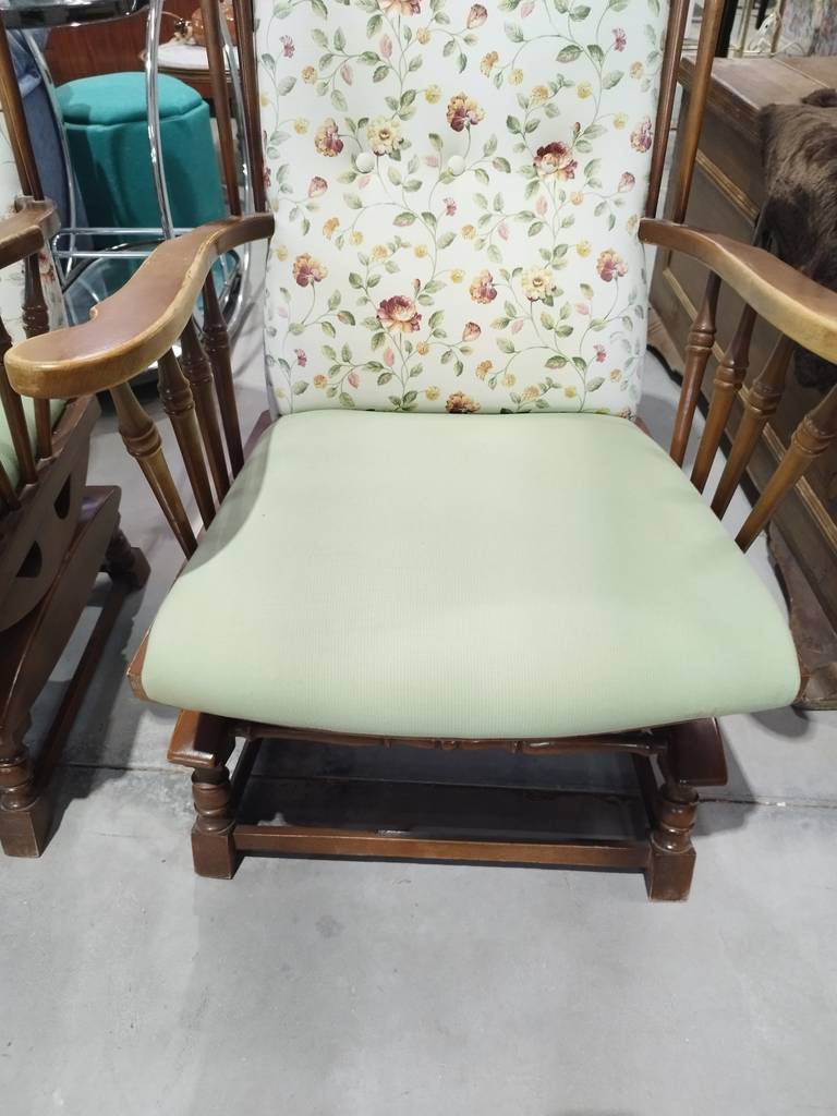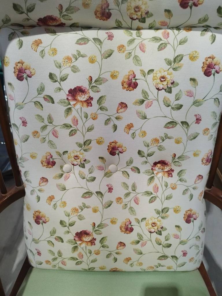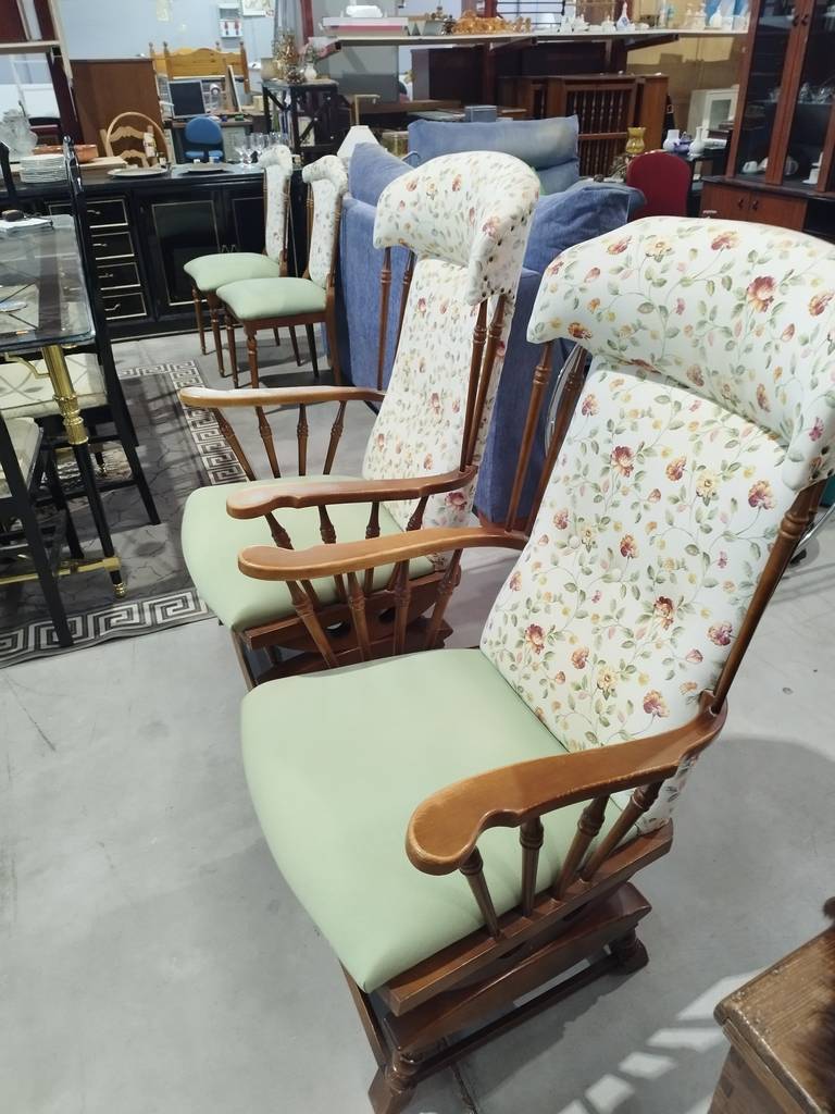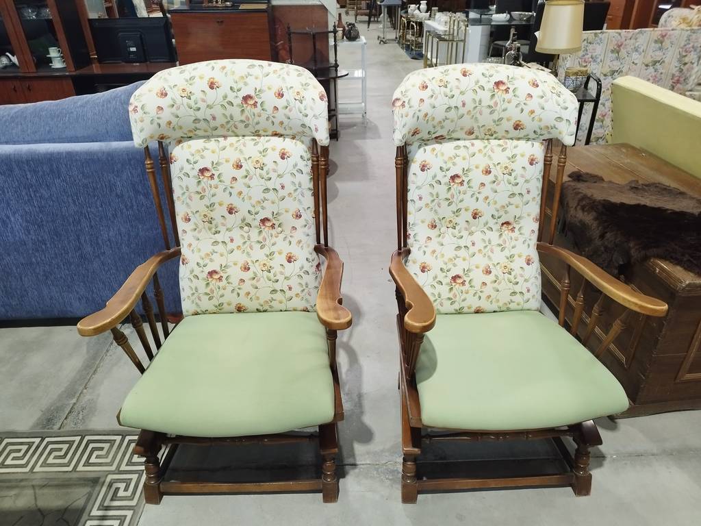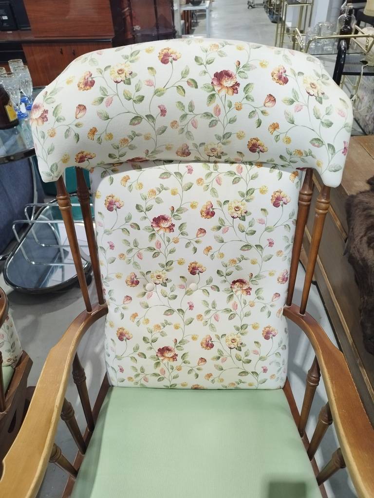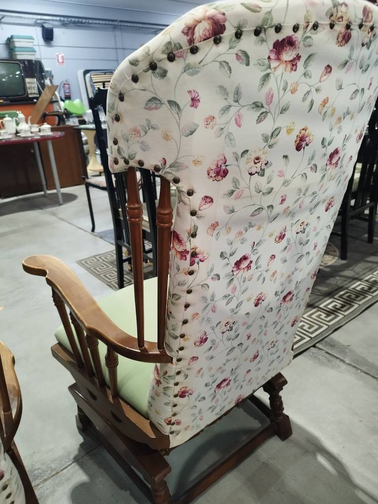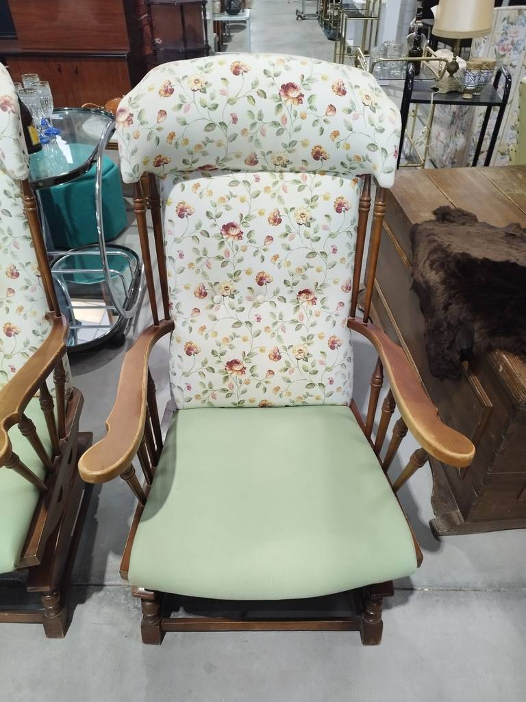 Pareja de mecedoras de estilo vintage muy bonitas y elegantes con un diseño compuesto por un respaldo tapizado con flores sobre fondo blanco con cuatro finos listones de madera en los laterales, un asiento en color verde claro y dos reposabrazos de madera en los laterales. Tanto el asiento como el respaldo son mullidos y cómodos. Son ideales para colocar en un salón comedor y relajarse plácidamente. Como podemos observar en las fotografías se encuentran en buenas condiciones.