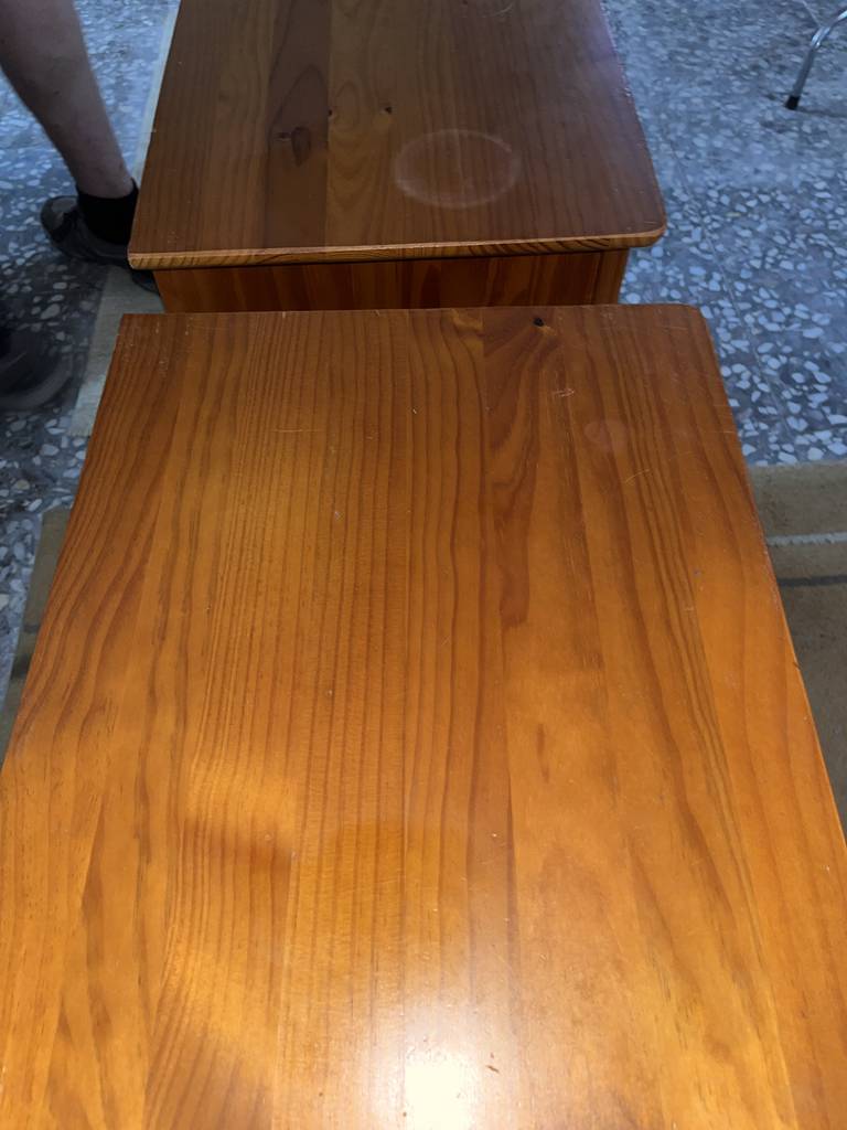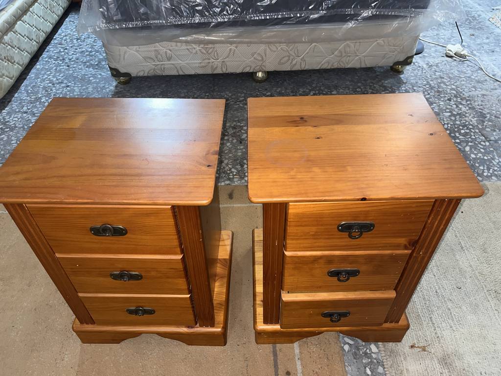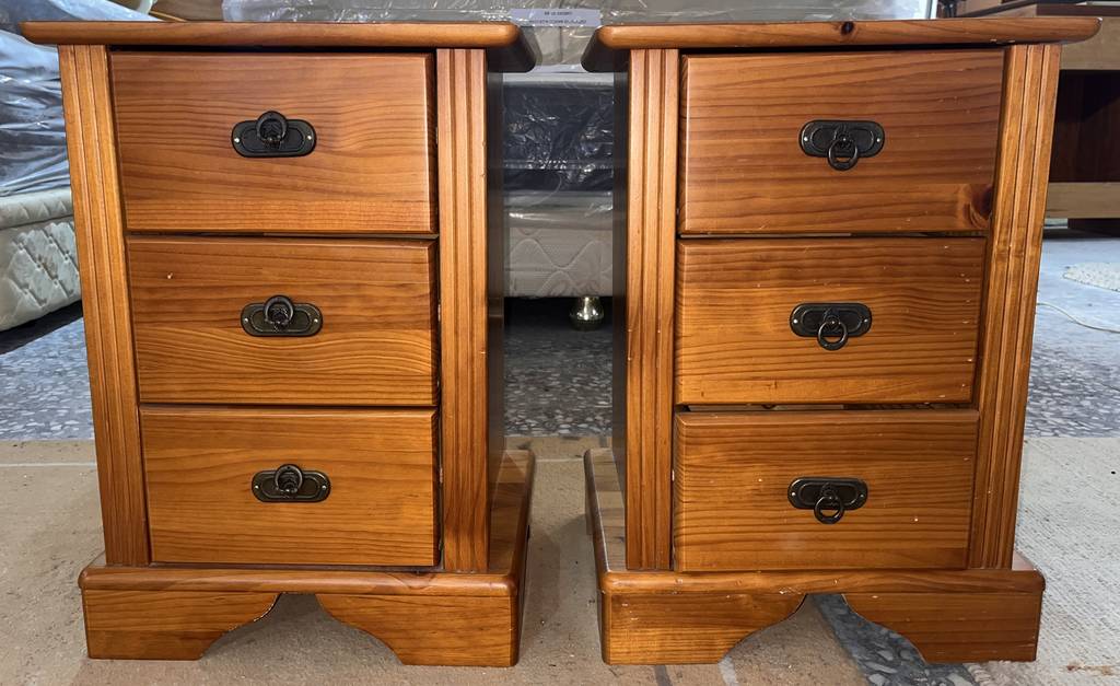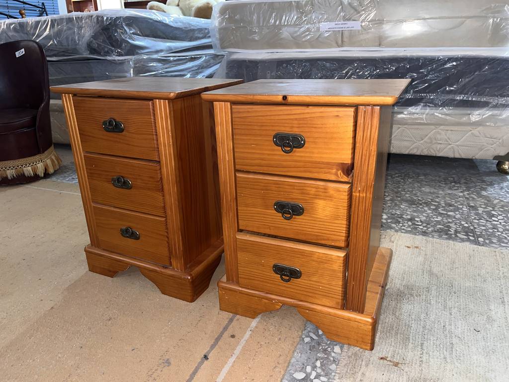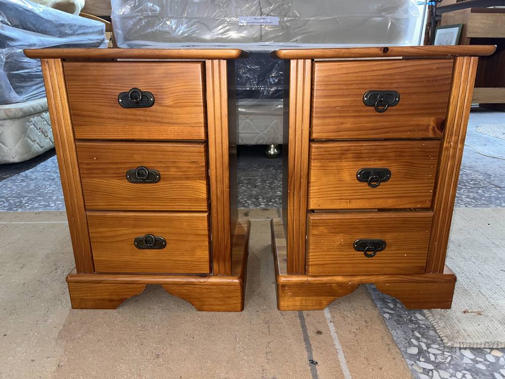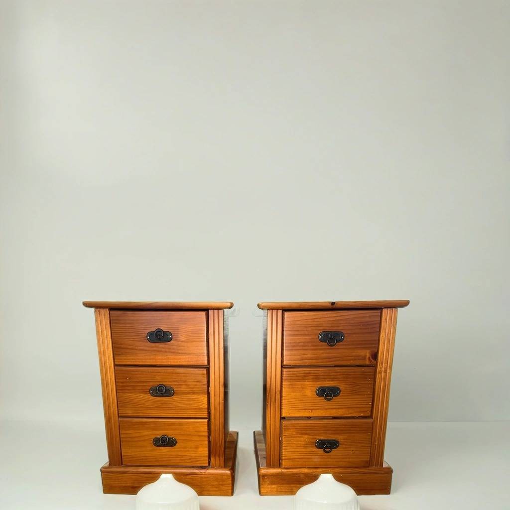 Pareja formada por dos mesitas de noche fabricadas en madera de buena calidad de color marrón claro. Se trata de dos mesitas de noche que cuentan con tres cajones cada una con tiradores metálicos en forma de argolla circular. Son dos mesitas perfectas para ponerlas en un dormitorio de matrimonio a ambos lados de una cama. Como se puede observar en las fotografías se encuentran en buenas condiciones.