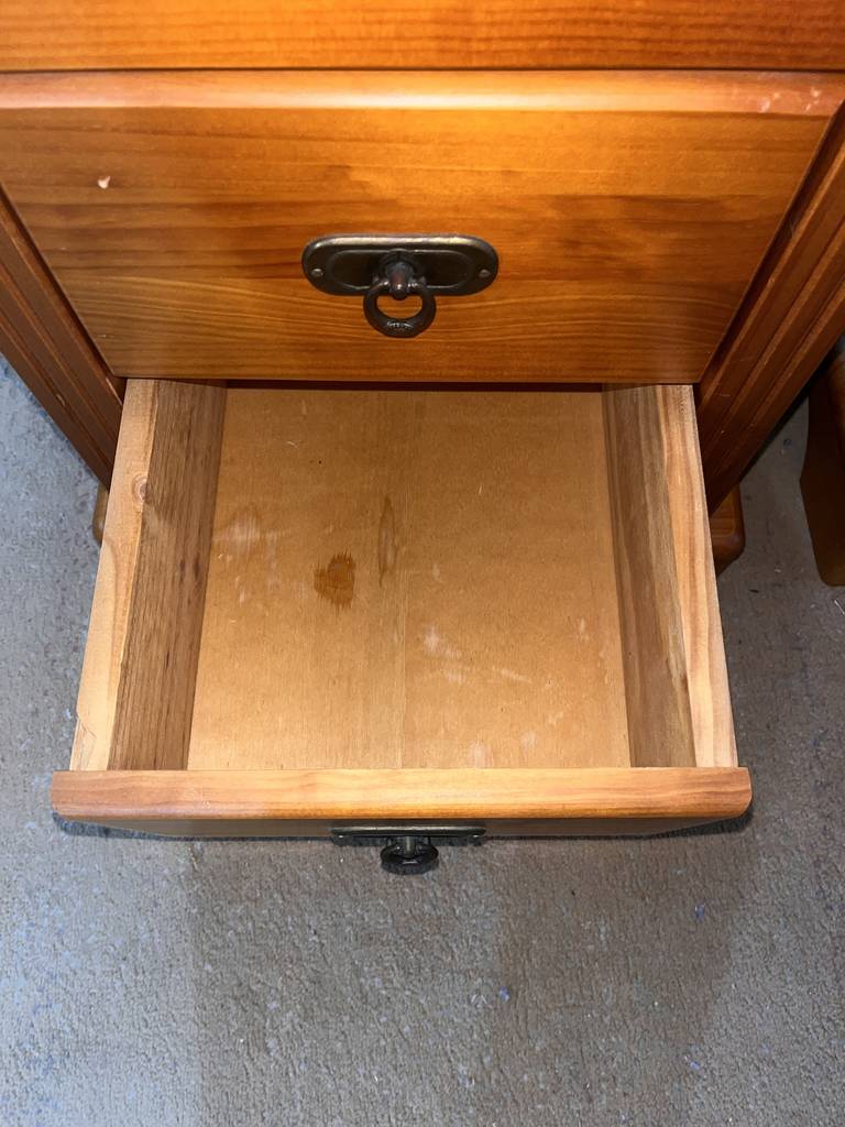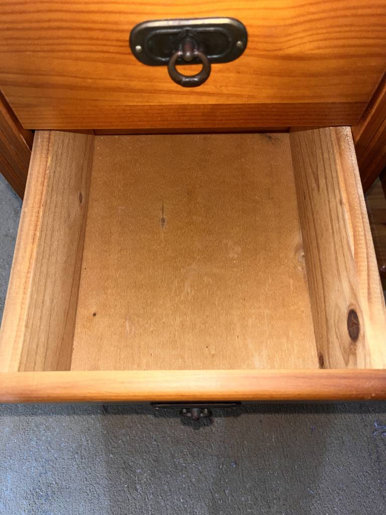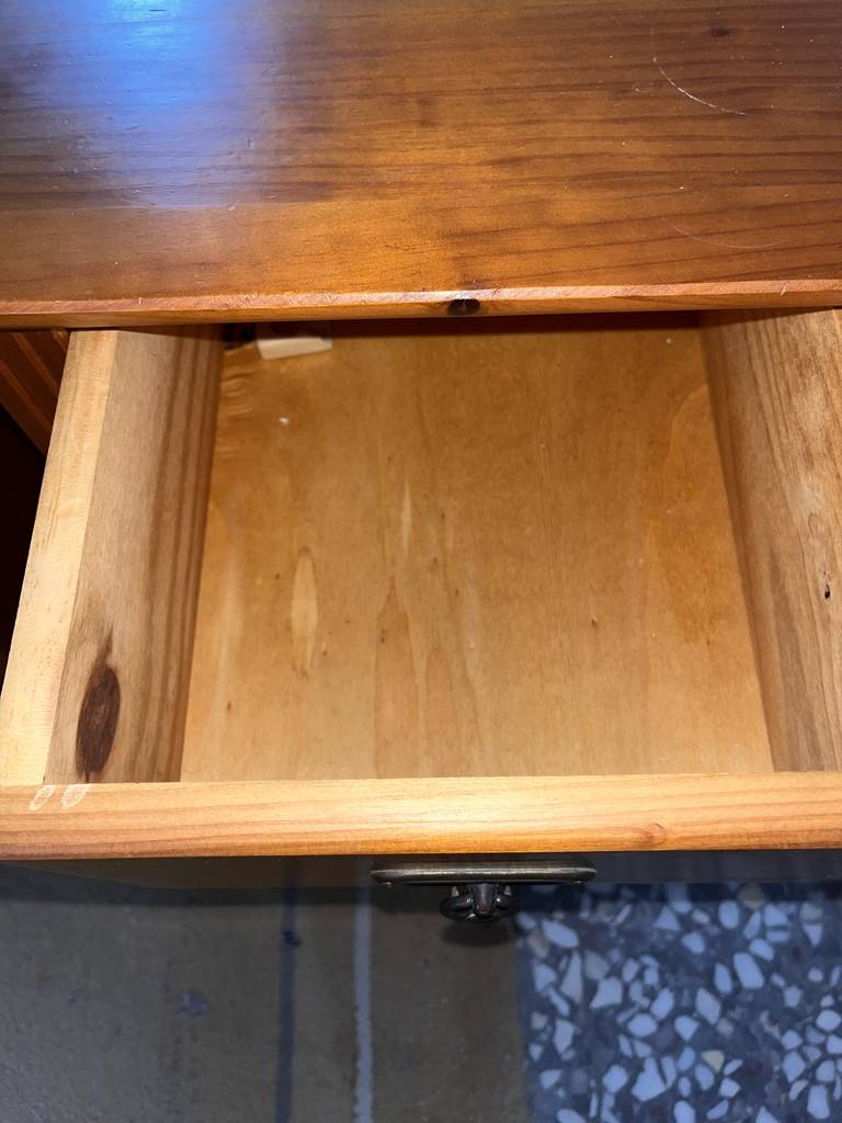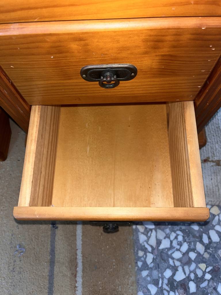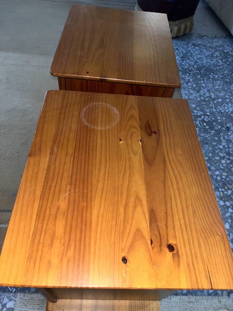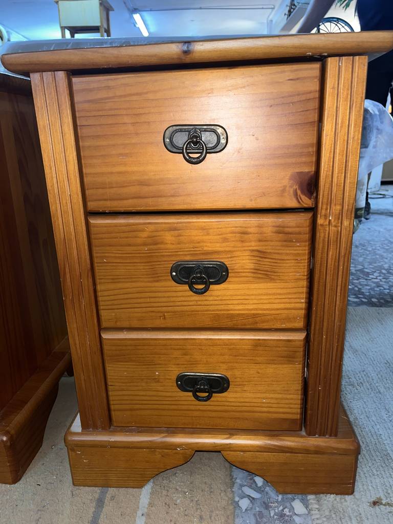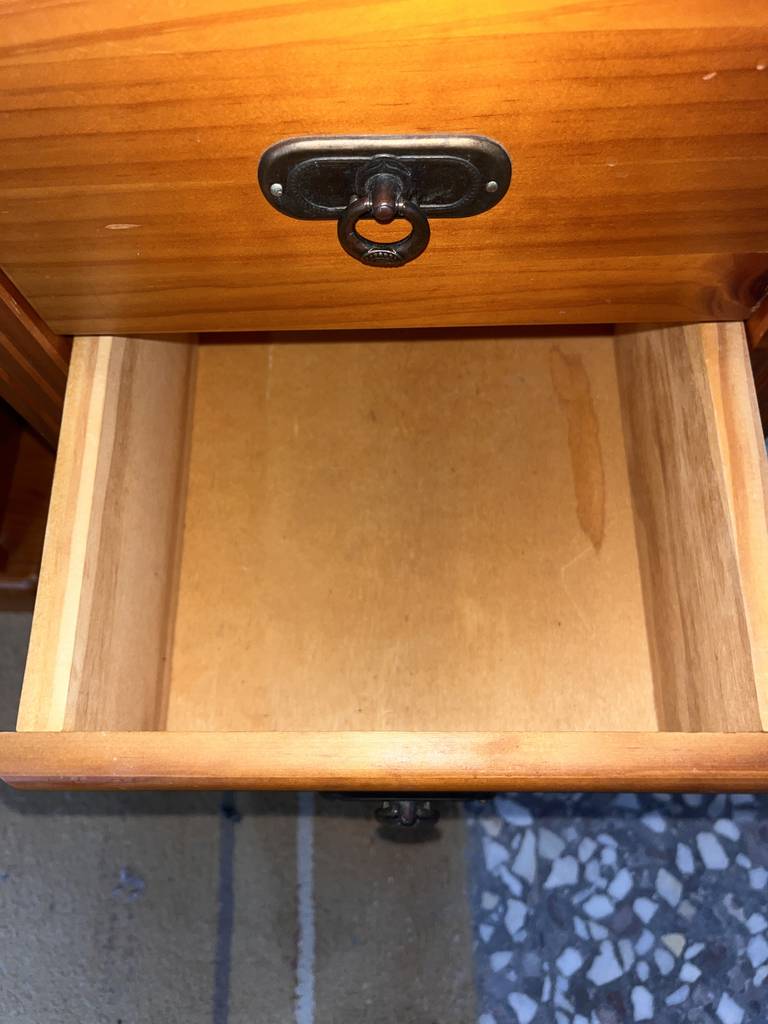 Pareja formada por dos mesitas de noche fabricadas en madera de buena calidad de color marrón claro. Se trata de dos mesitas de noche que cuentan con tres cajones cada una con tiradores metálicos en forma de argolla circular. Son dos mesitas perfectas para ponerlas en un dormitorio de matrimonio a ambos lados de una cama. Como se puede observar en las fotografías se encuentran en buenas condiciones.
