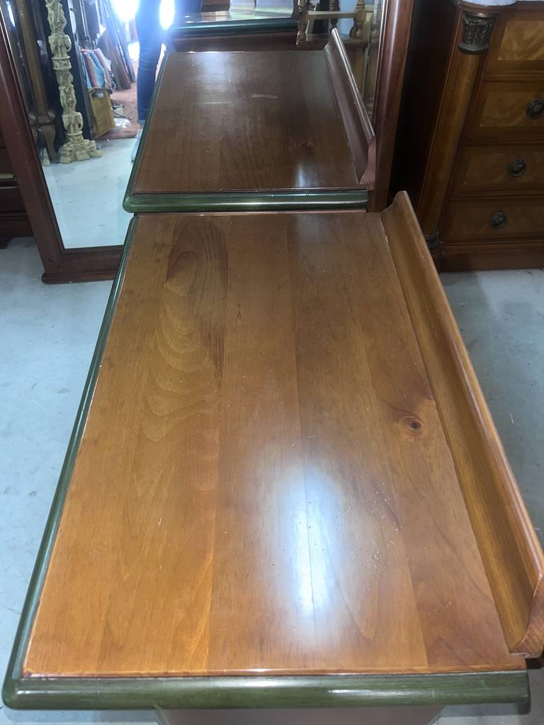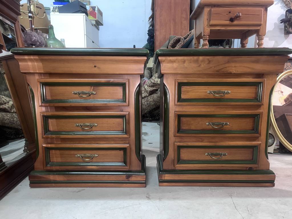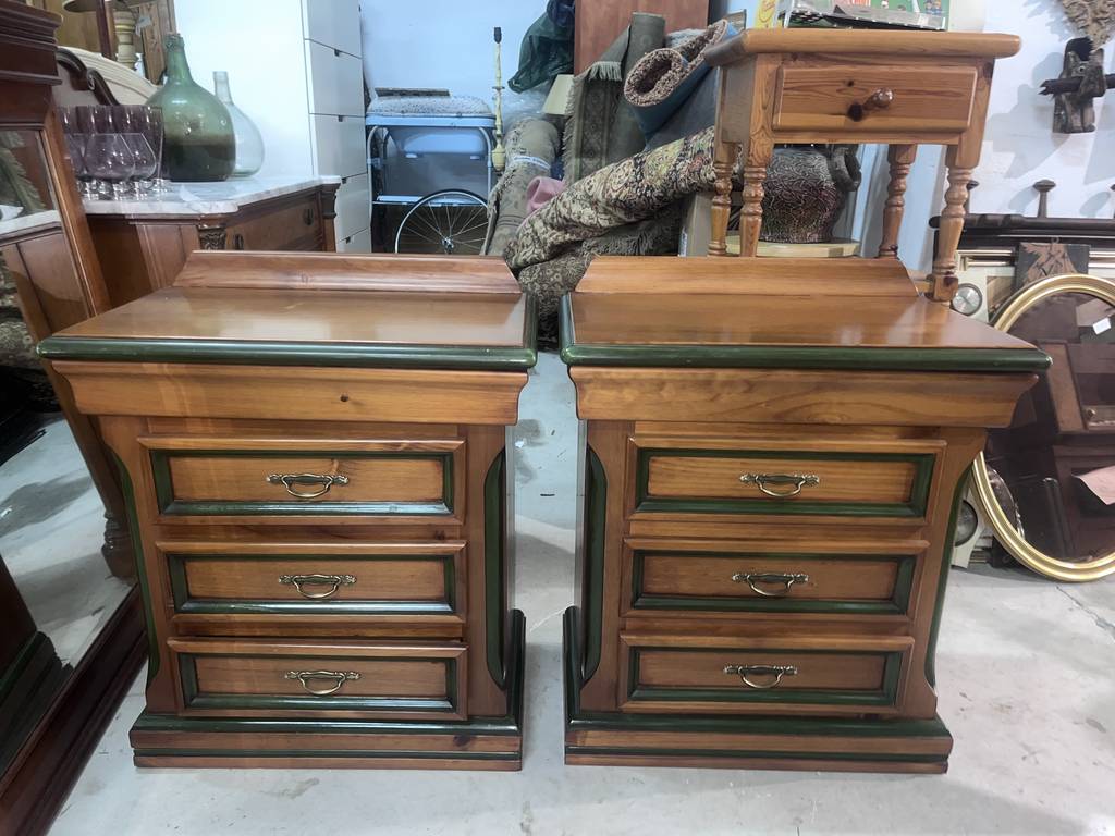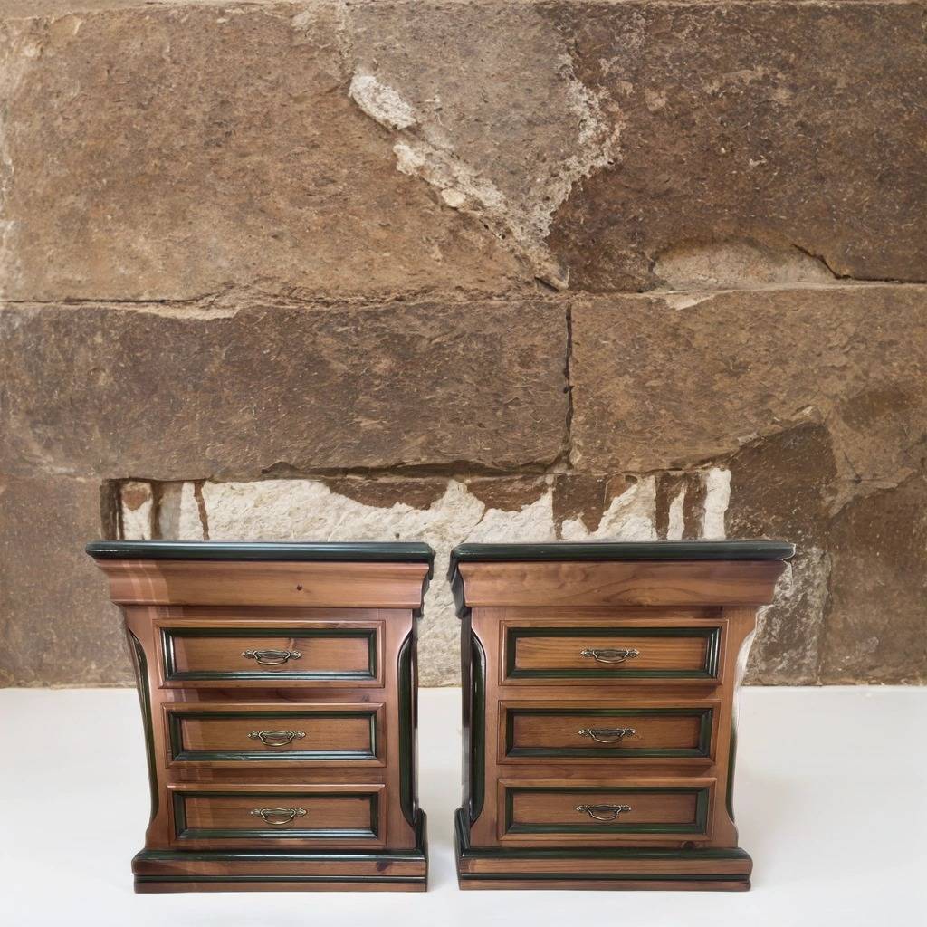 Pareja formada por dos mesitas de noche fabricadas en madera de buena calidad y robusta de color marrón oscuro. Se trata de dos mesitas de noche que cuentan con tres cajones cada una con tiradores metálicos en forma de asa para facilitar su apertura. Son dos mesitas ideales para colocarlas a ambos lados de una cama en un dormitorio de matrimonio. Como se ve en las imágenes están en buen estado.