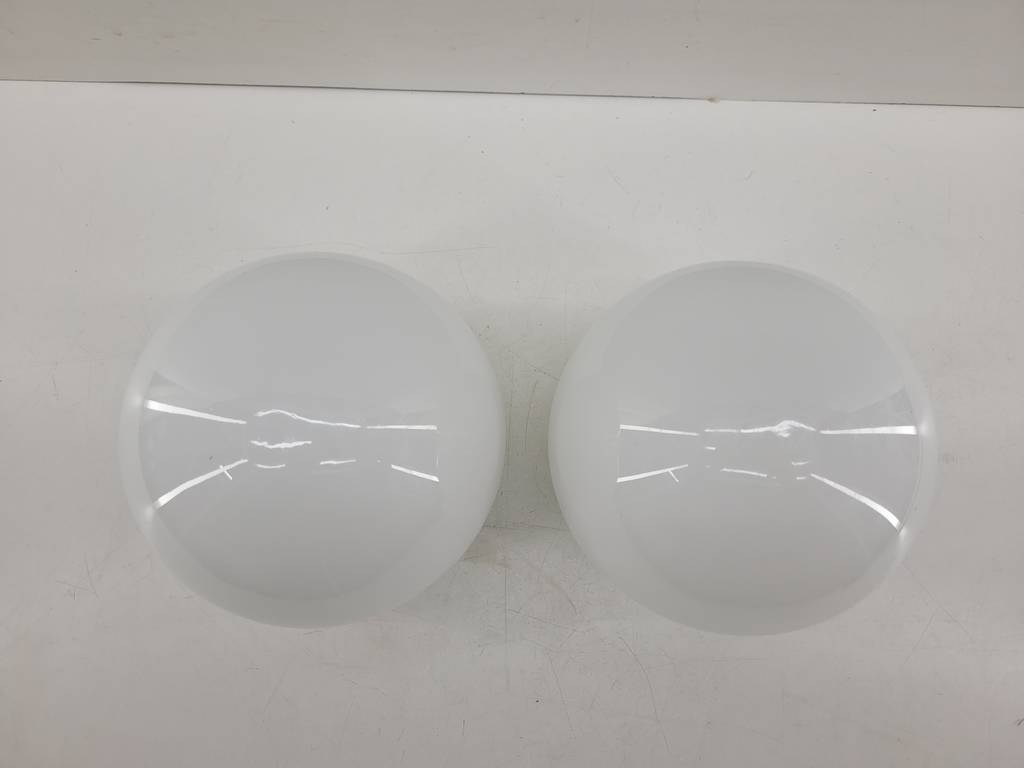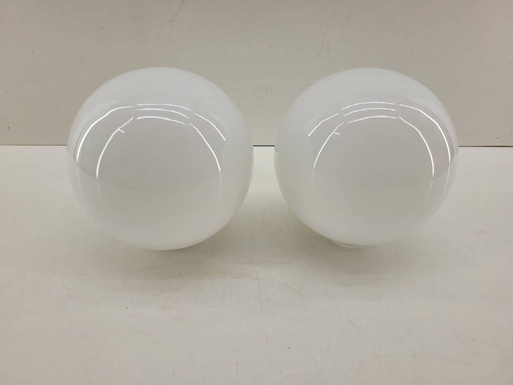 Pareja de pantallas de lámpara en forma de globo de cristal opaco grueso de buena calidad y duradero. Disponen cada una de un agujero con una medida de 5cm. Son ideales para sustituir por unas lámparas o apliques de pared en mal estado. Como podemos observar en las fotografías se encuentran en buenas condiciones y listas para ser instaladas.