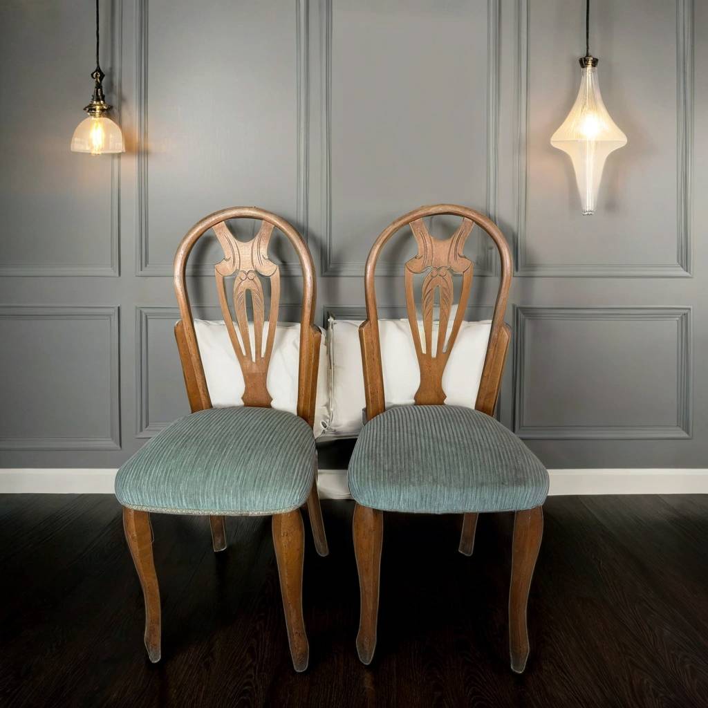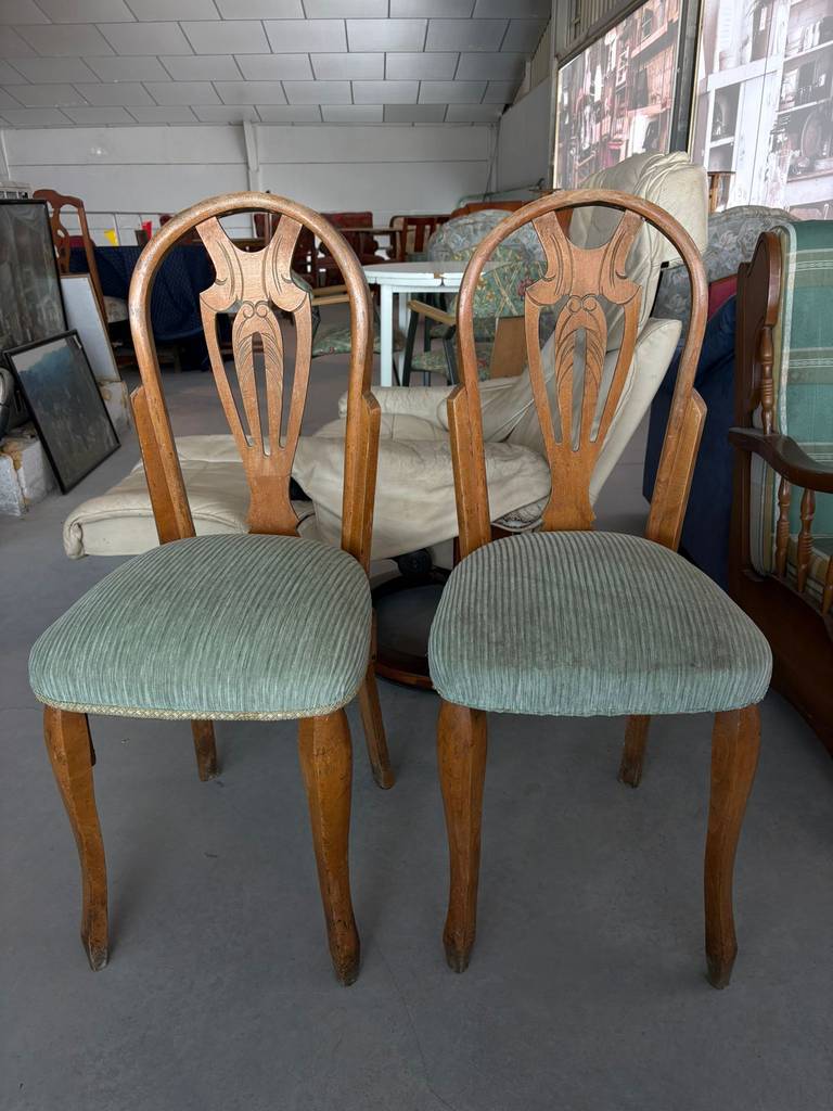 Pareja formada por dos sillas fabricadas en madera de buena calidad de color marrón claro con un asiento de color verde. Se trata de dos sillas que tienen un bonito respaldo formado por la unión de listones de madera y son perfectas para colocarlas alrededor de una mesa en un salón comedor. Como se puede observar en las fotografías se encuentran en buenas condiciones.