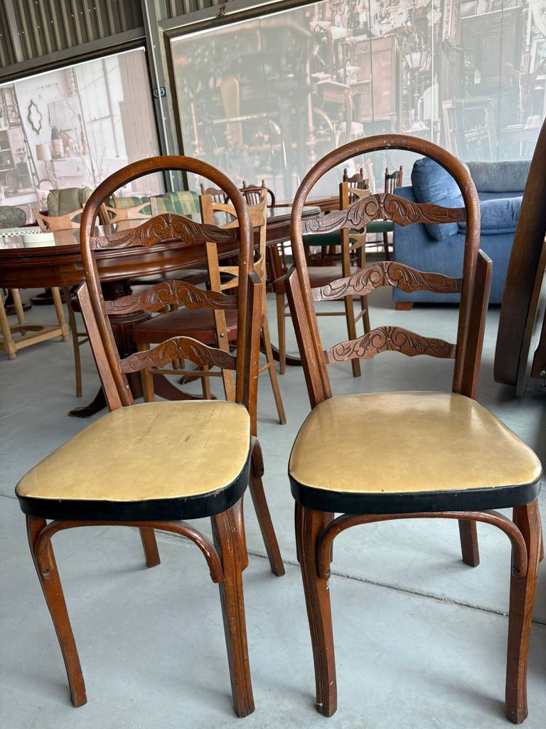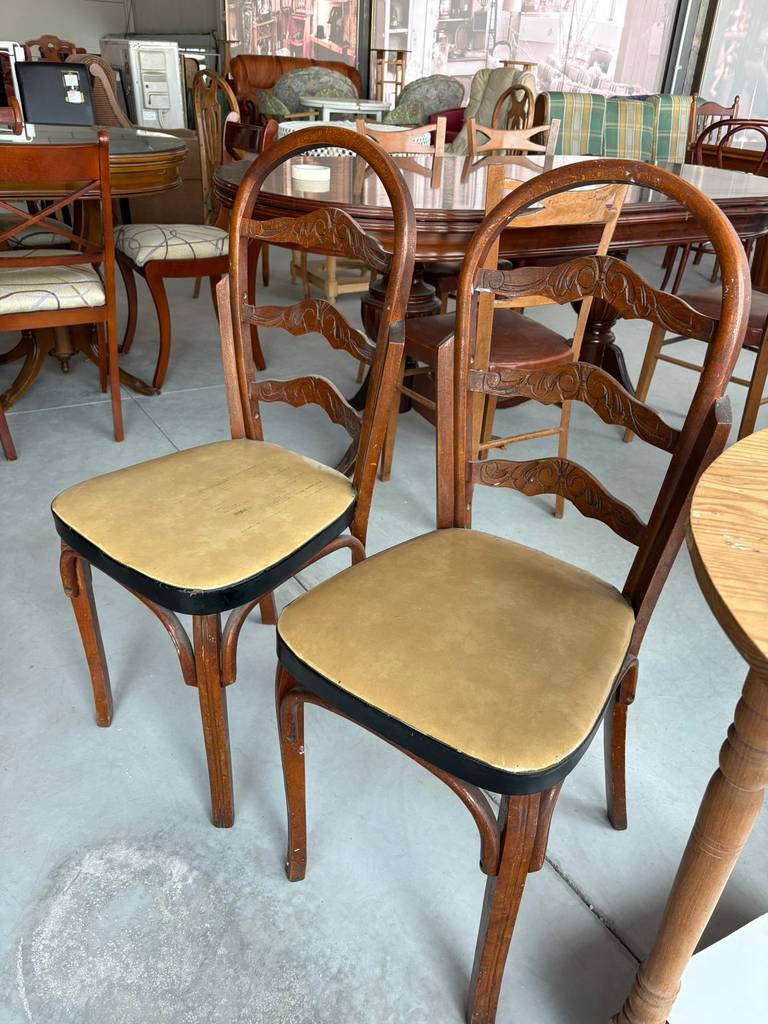 Pareja formada por dos sillas fabricadas en madera de buena calidad de color marrón oscuro con un asiento de color beige. Se trata de dos sillas que tienen un bonito respaldo formado por la unión de listones de madera y son perfectas para colocarlas alrededor de una mesa en un salón comedor. Como se puede observar en las fotografías se encuentran en buenas condiciones.