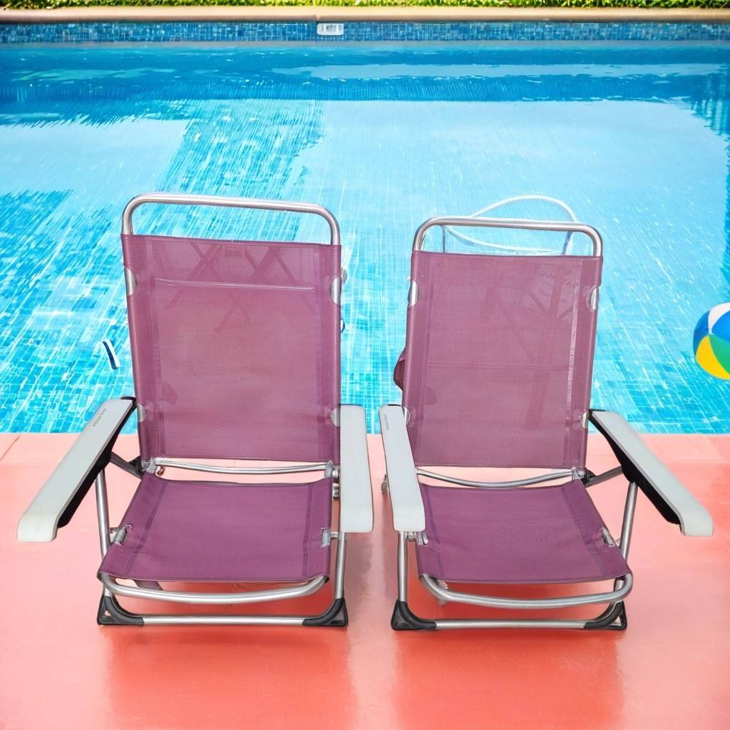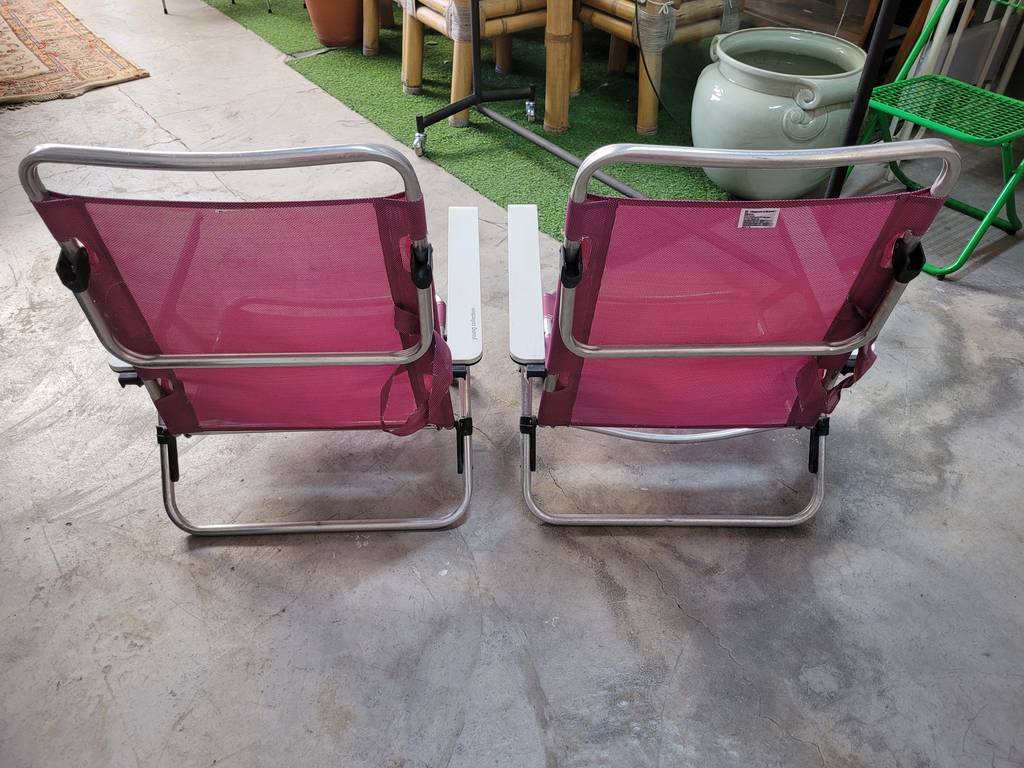 Dos sillas plegables de playa de color violeta. Se trata de una pareja de sillas plegables que cuentan con dos cómodos reposabrazos, un amplio asiento y un confortable respaldo. Son dos sillas ideales para llevar a la playa o al campo para sentarse cómodamente. Como se puede observar en las fotografías se encuentran en buenas condiciones para ser utilizadas.