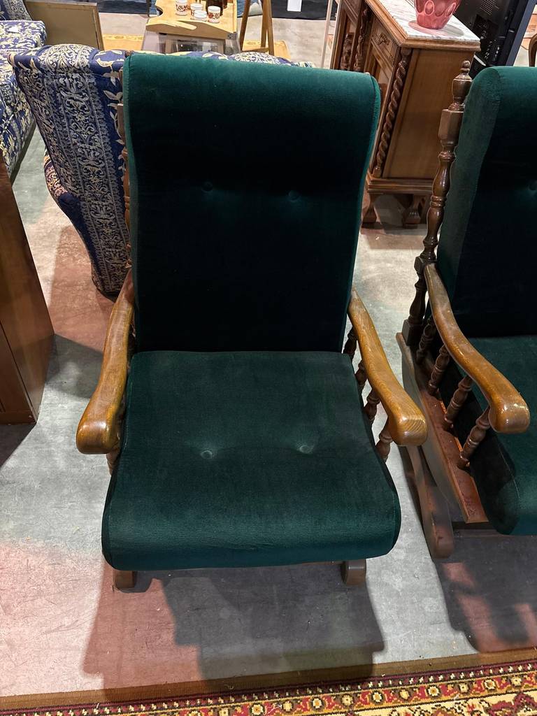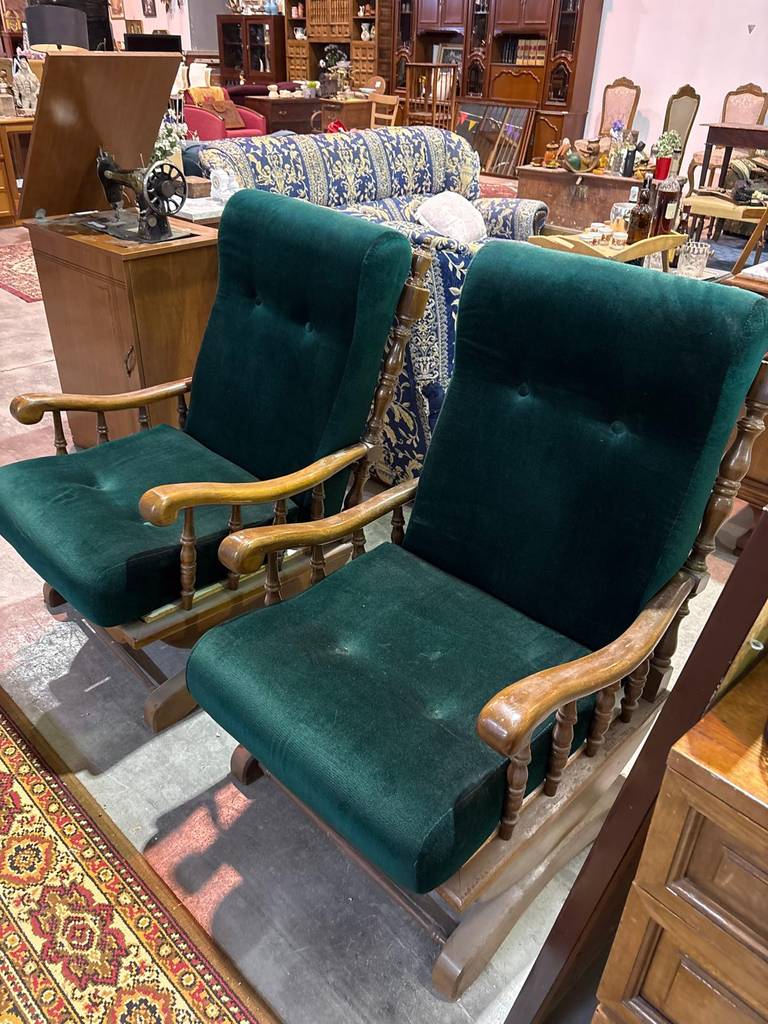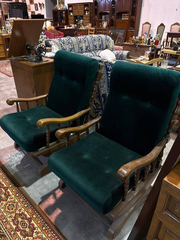 Pareja de sillones con unos asientos y respaldos cómodos y acolchados, así como un tapizado verde de terciopelo muy suave y agradable al tacto. Su estructura es de madera de buena calidad y robusta. Se trata de unos sillones ideales para colocar en un salón comedor y mecerse en ellos con un gran relax a diario. Como podemos observar en las fotografías presenta desperfectos.