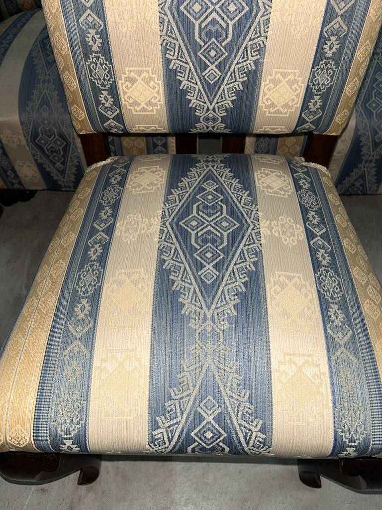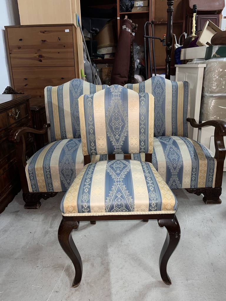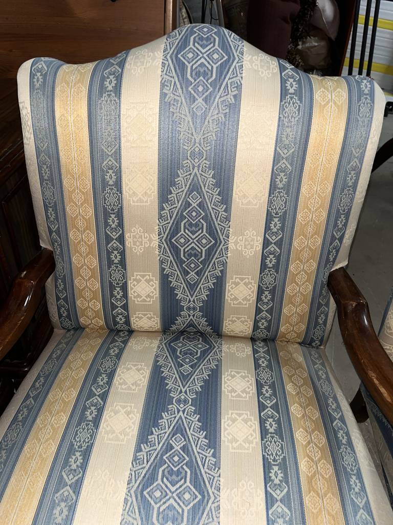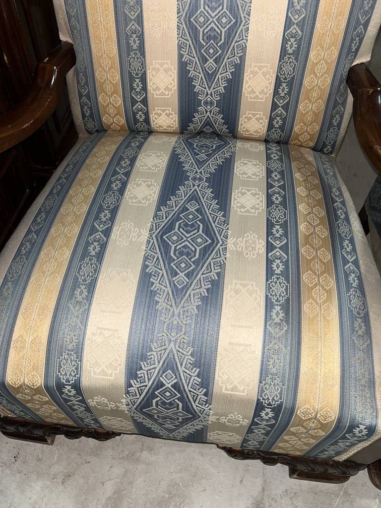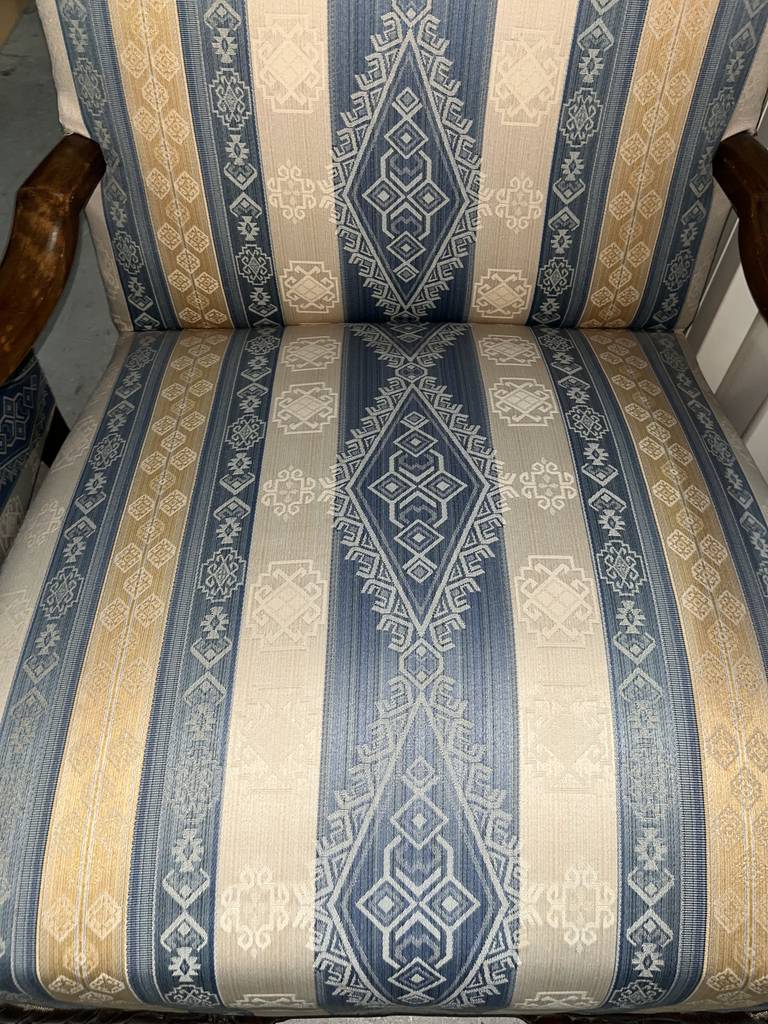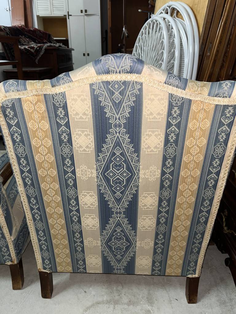 Conjunto compuesto por dos sillones y una silla. Se trata de un conjunto muy bonito y elegante que incorpora todos unos respaldos y asientos acolchados y cómodos. Los sillones también incluyen reposabrazos en los laterales. Disponen de un tapizado brillante a rayas azules y beige con grabados que los hacen resaltar. Como podemos observar en las fotografías se encuentran en buenas condiciones.