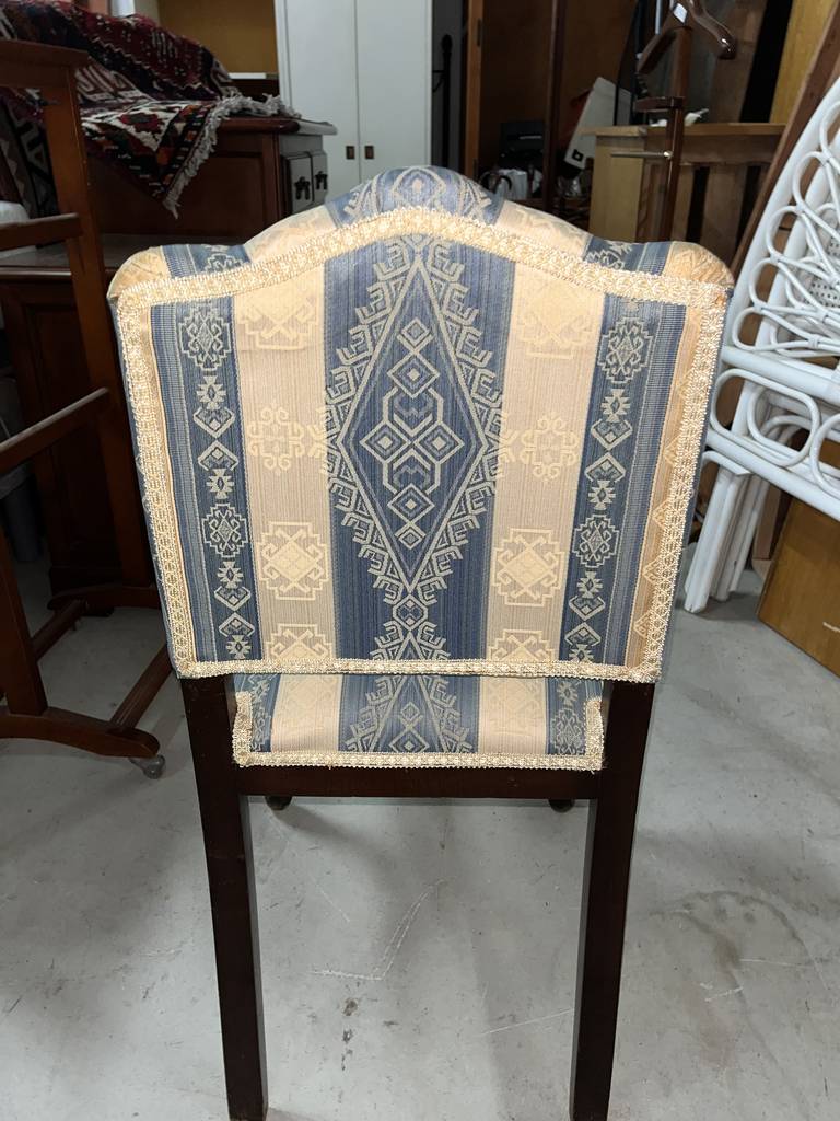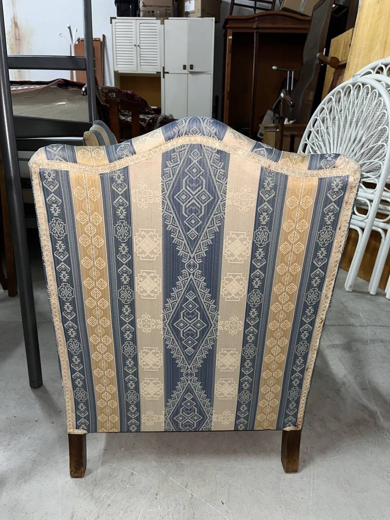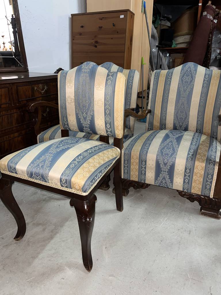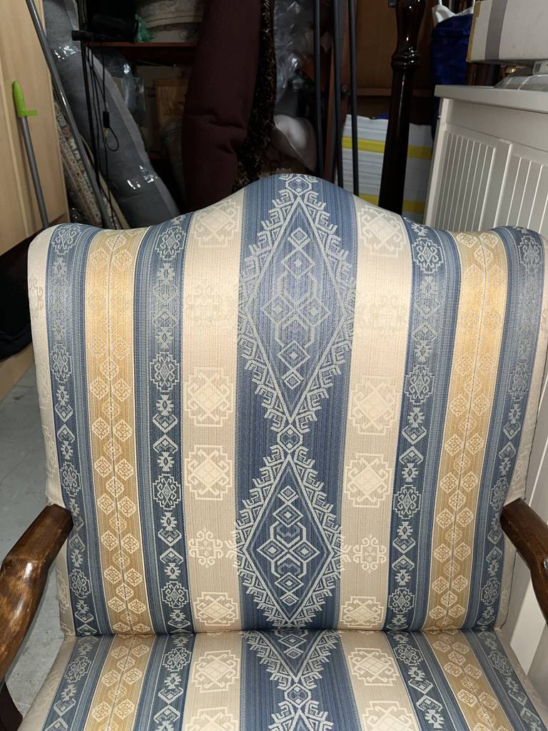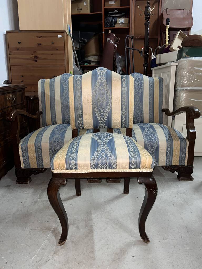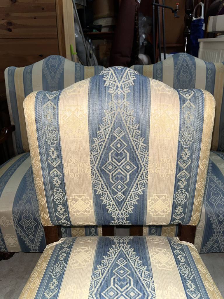 Conjunto compuesto por dos sillones y una silla. Se trata de un conjunto muy bonito y elegante que incorpora todos unos respaldos y asientos acolchados y cómodos. Los sillones también incluyen reposabrazos en los laterales. Disponen de un tapizado brillante a rayas azules y beige con grabados que los hacen resaltar. Como podemos observar en las fotografías se encuentran en buenas condiciones.