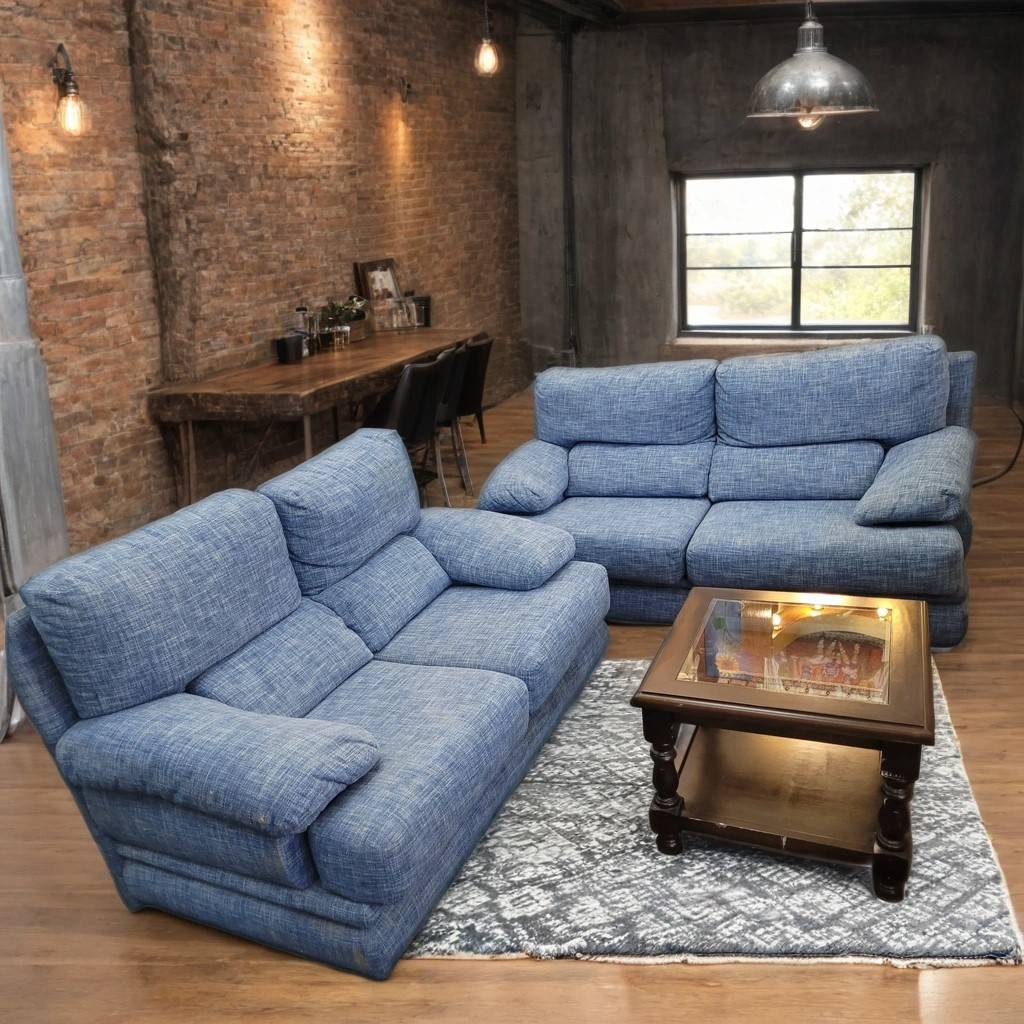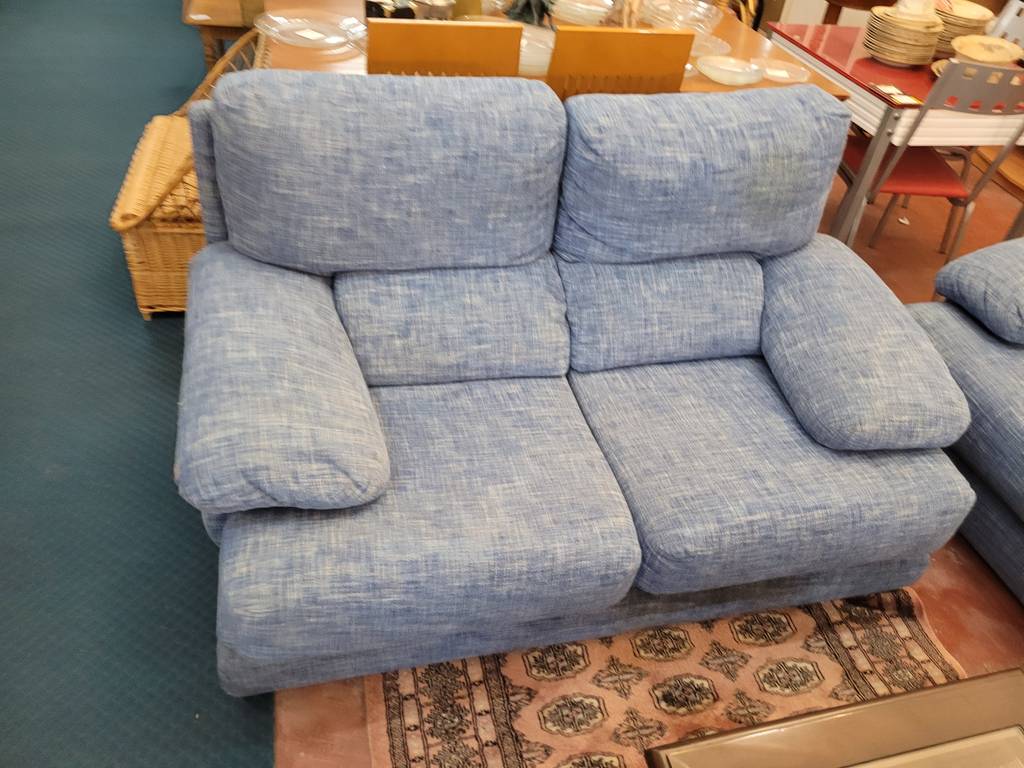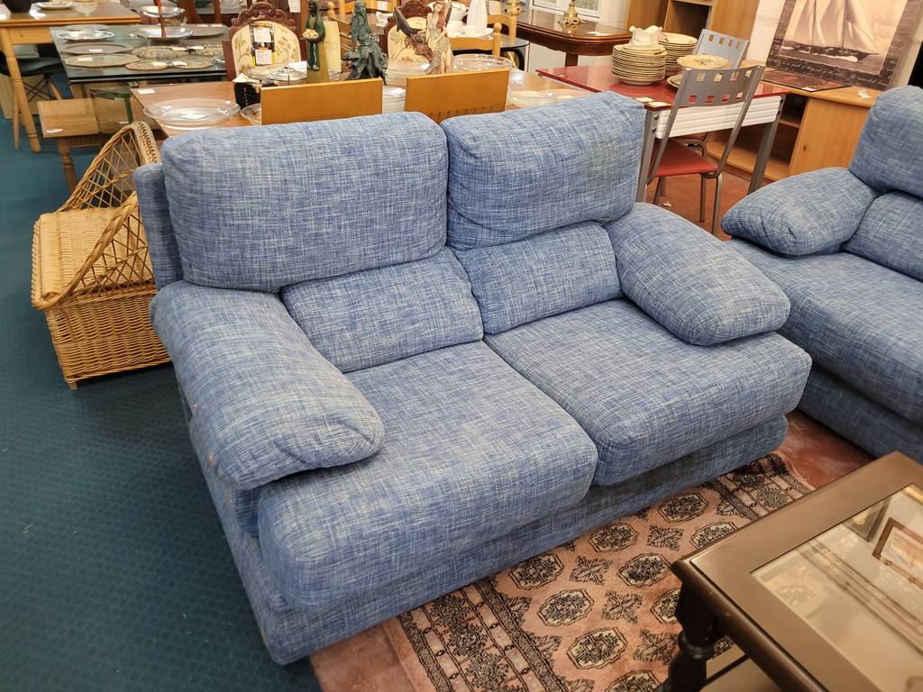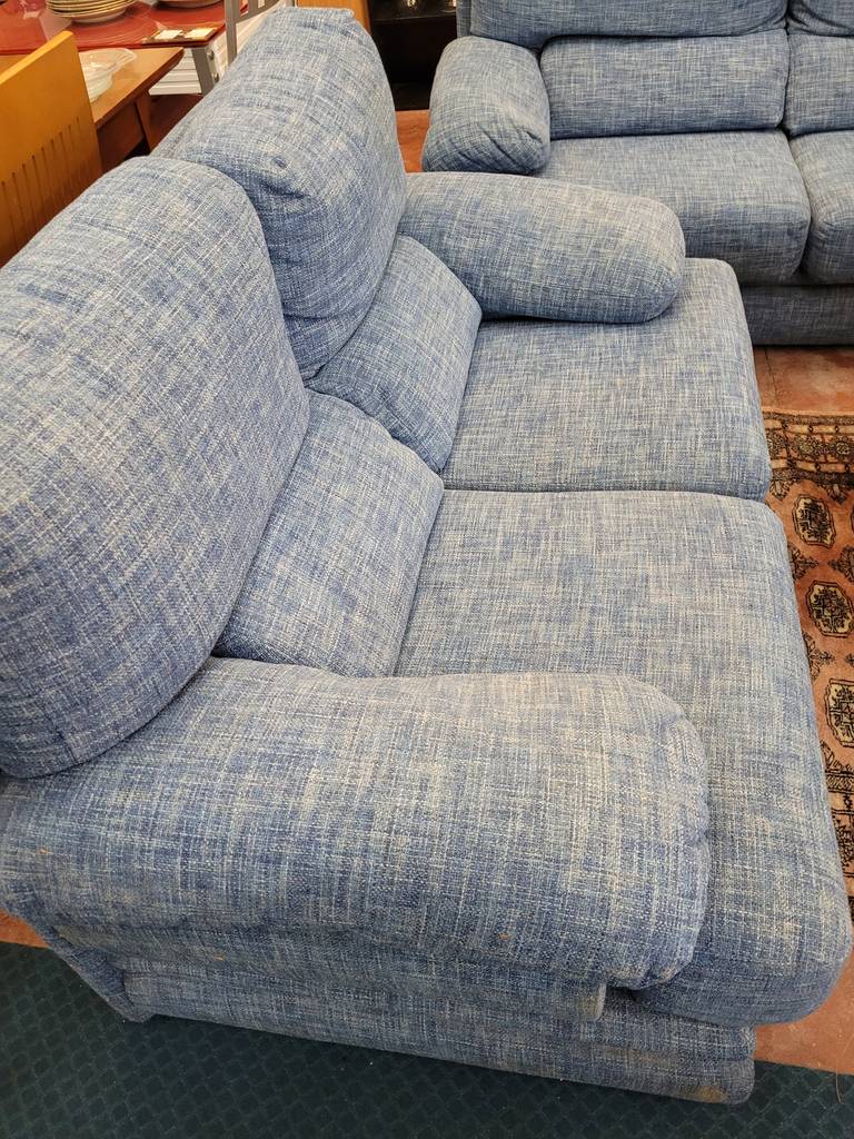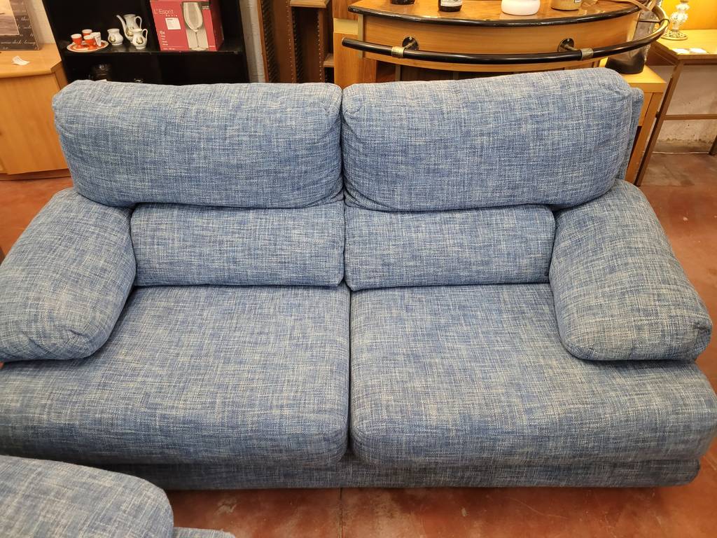 Conjunto de dos sofás a juego en color azul jeans. Con tres y dos plazas respectivamente estos sofás incorporan asientos y respaldos cómodos y acolchados. También dispone de reposabrazos en los laterales que les aporta un confort extra. Son ideales para colocar en un salón comedor. Como podemos observar en las fotografías se encuentra en buenas condiciones.