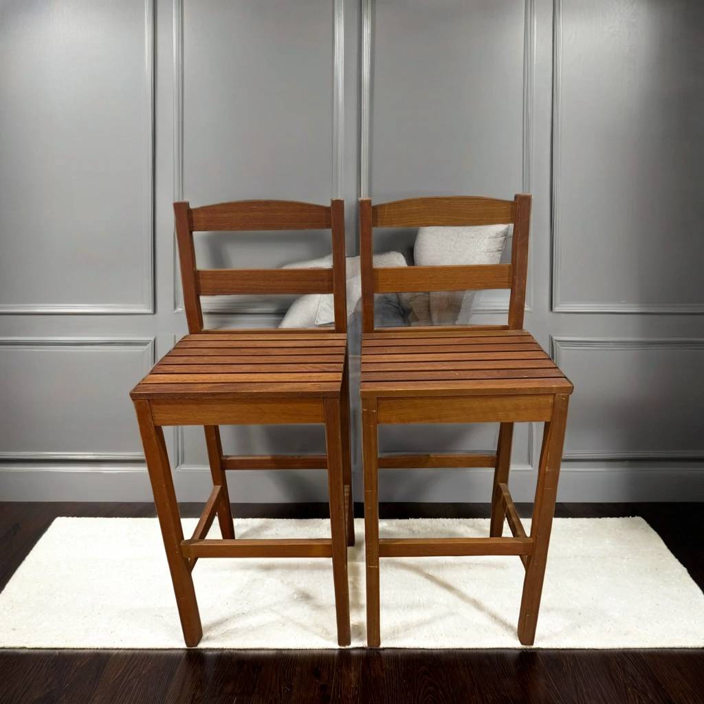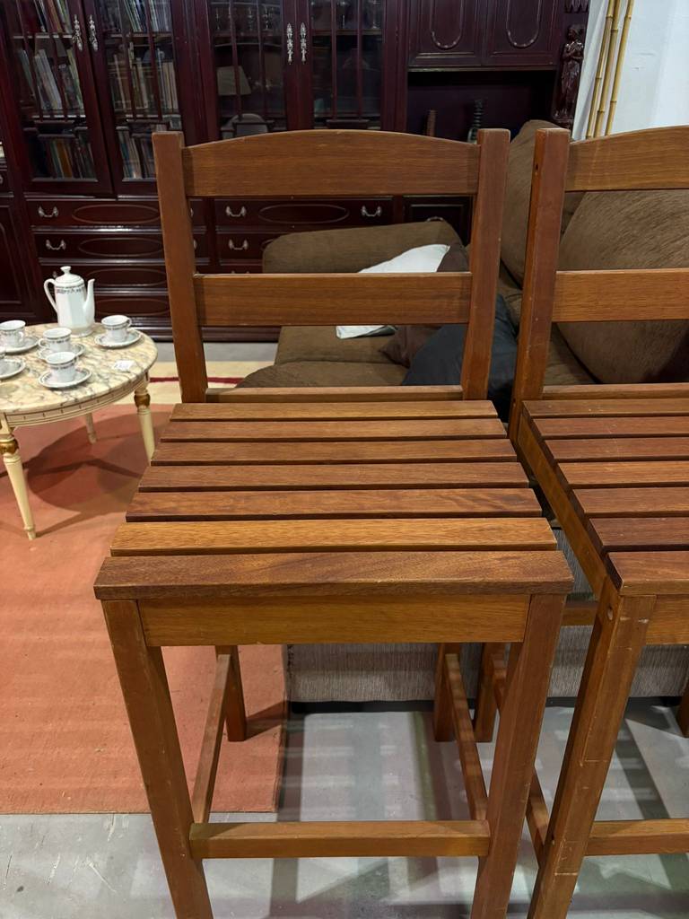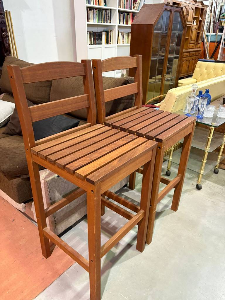 Pareja de taburetes completamente realizados con madera de buena calidad y robusta. Se trata de unos taburetes con cuatro patas unidas por listones de madera que los hacen muy estables. Incorporan respaldo para una mayor comodidad. Son ideales para colocar en una cocina o también en una isla. Como podemos observar en las fotografías presentan ligeros rasguños.