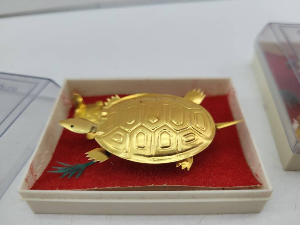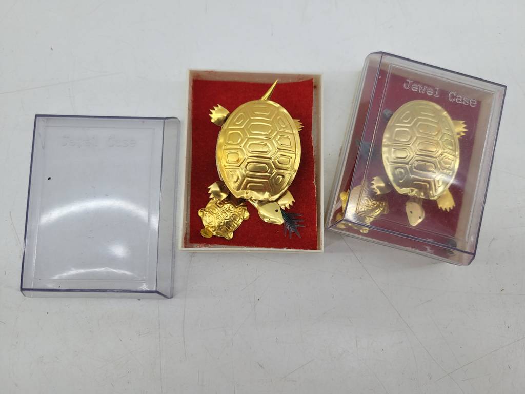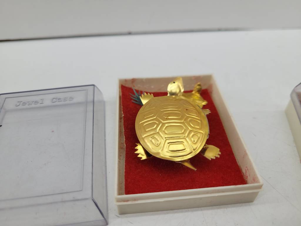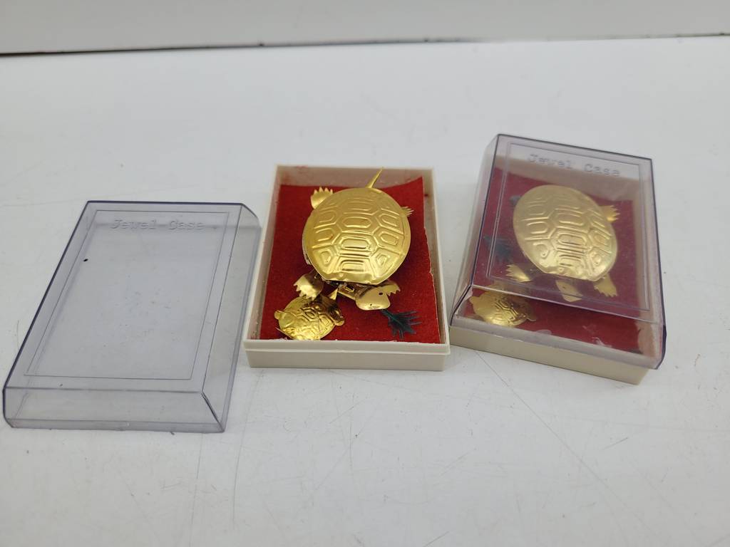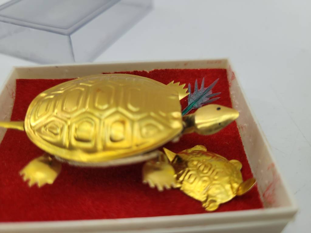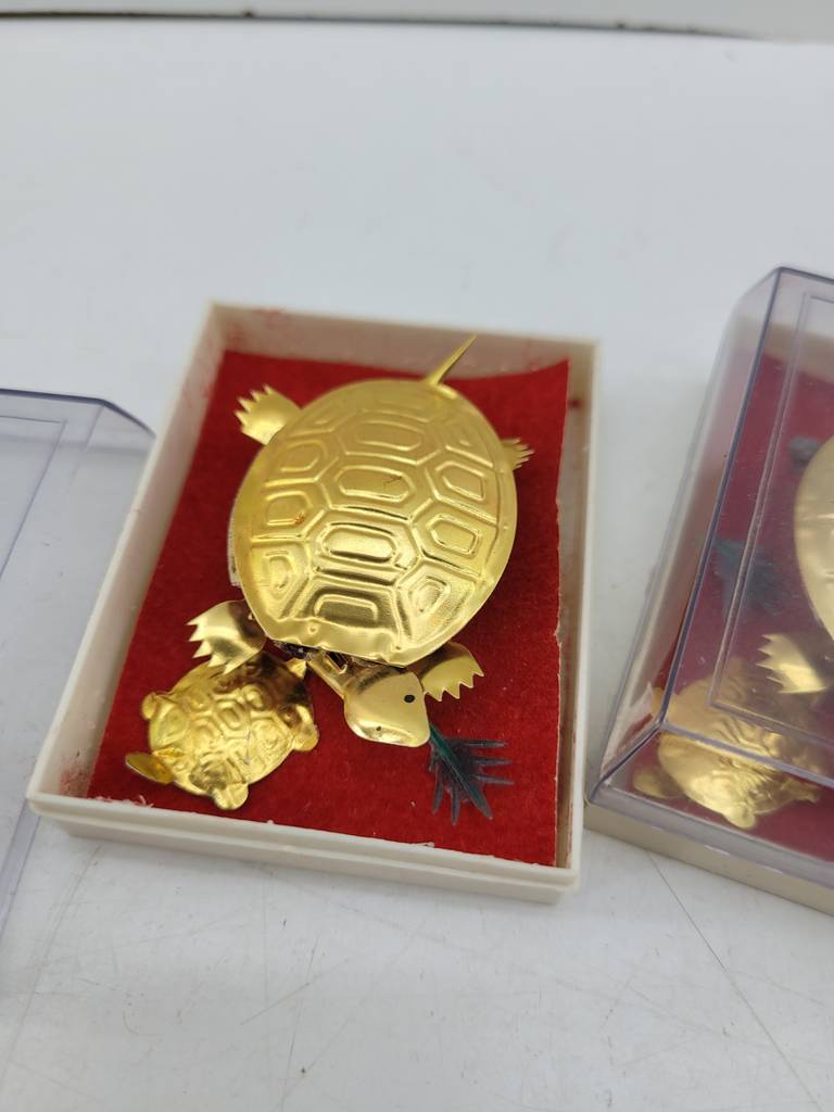 Pareja de figuras de estilo vintage de unas tortugas doradas brillantes que han sido conservadas en su caja original. Se trata de un elemento decorativo único y original que resaltará en cualquier estancia de nuestra casa, en especial en un recibidor, salón comedor o en un despacho. Como podemos observar en las fotografías se encuentra en buen estado de conservación.