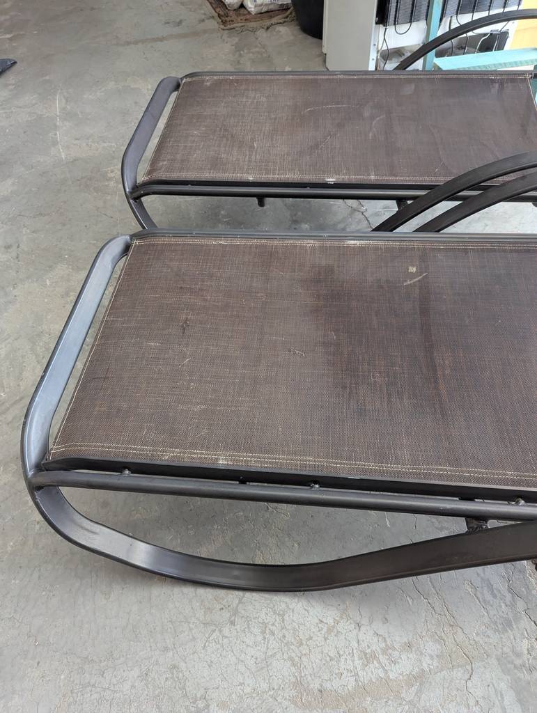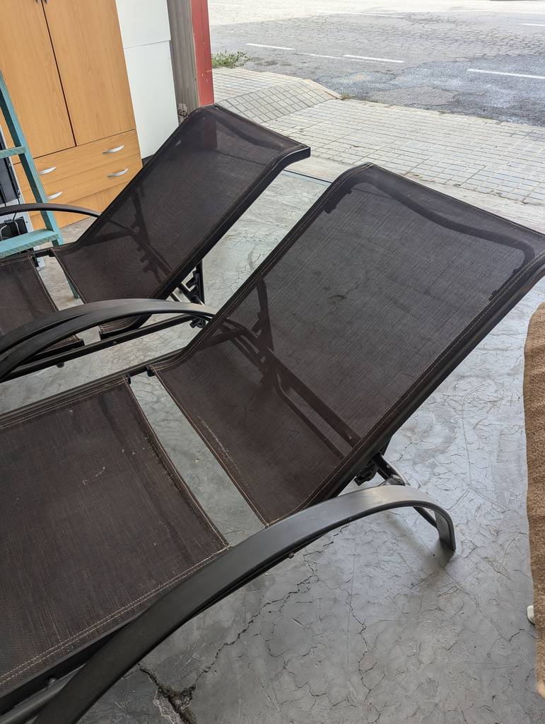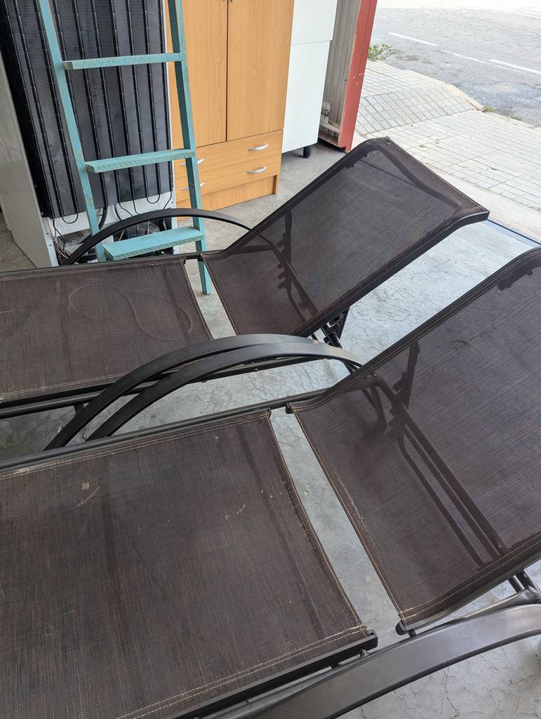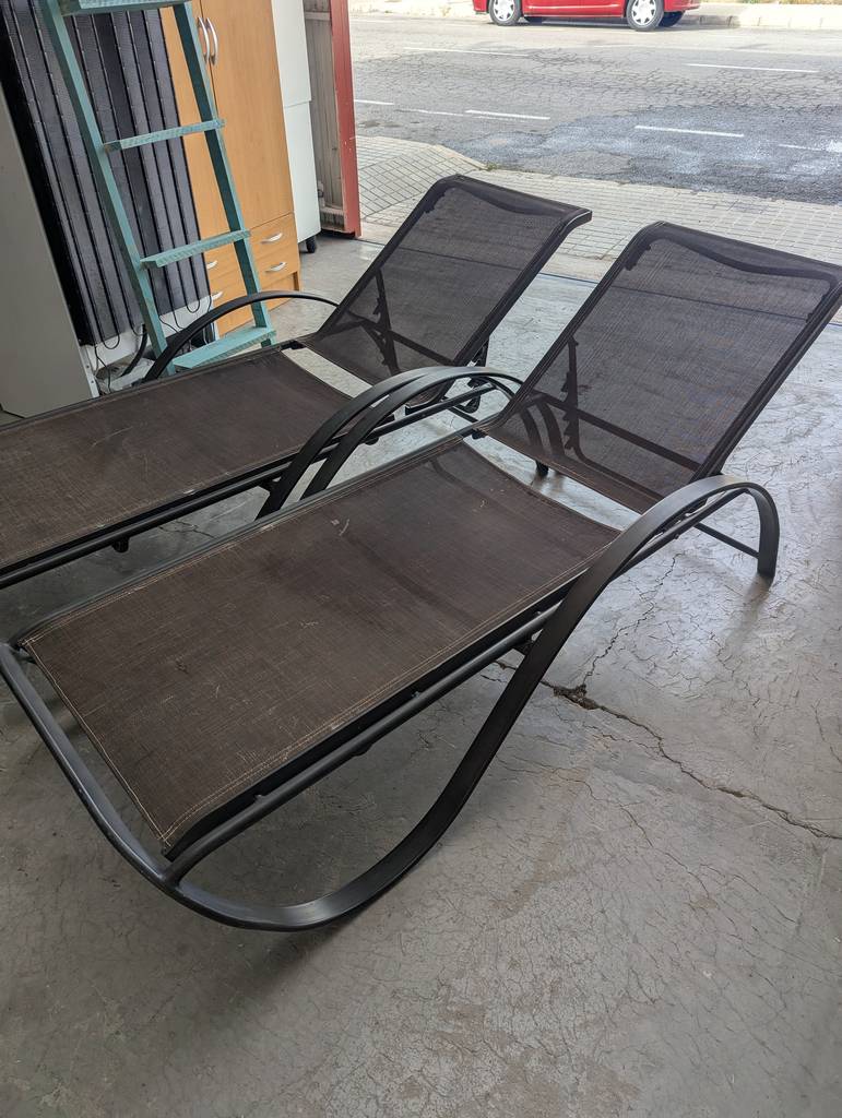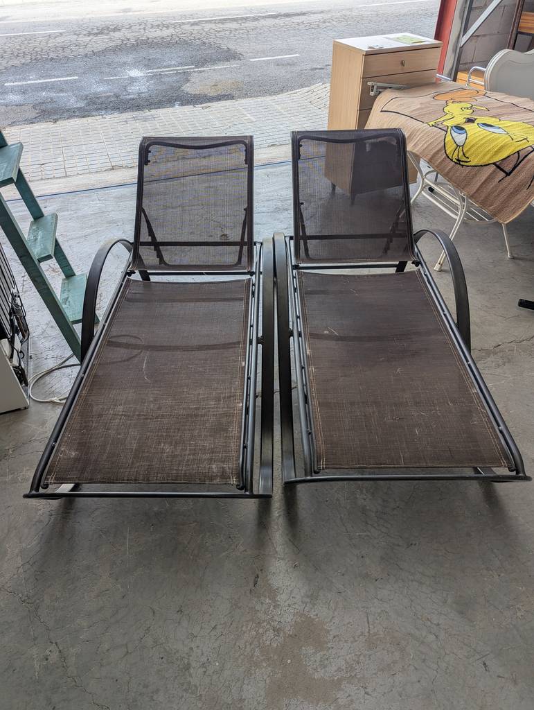 Pareja formada por dos tumbonas metálicas de color negro. Se trata de dos grandes y cómodas tumbonas metálicas que tienen una superficie confortable para estirarse encima de ellas y disfrutar de un día soleado en el jardín de casa o en un patio exterior. Estas tumbonas se pueden llevar a la playa ya que están fabricadas con materiales resistentes. Como se puede observar en las fotografías se encuentran en buenas condiciones.