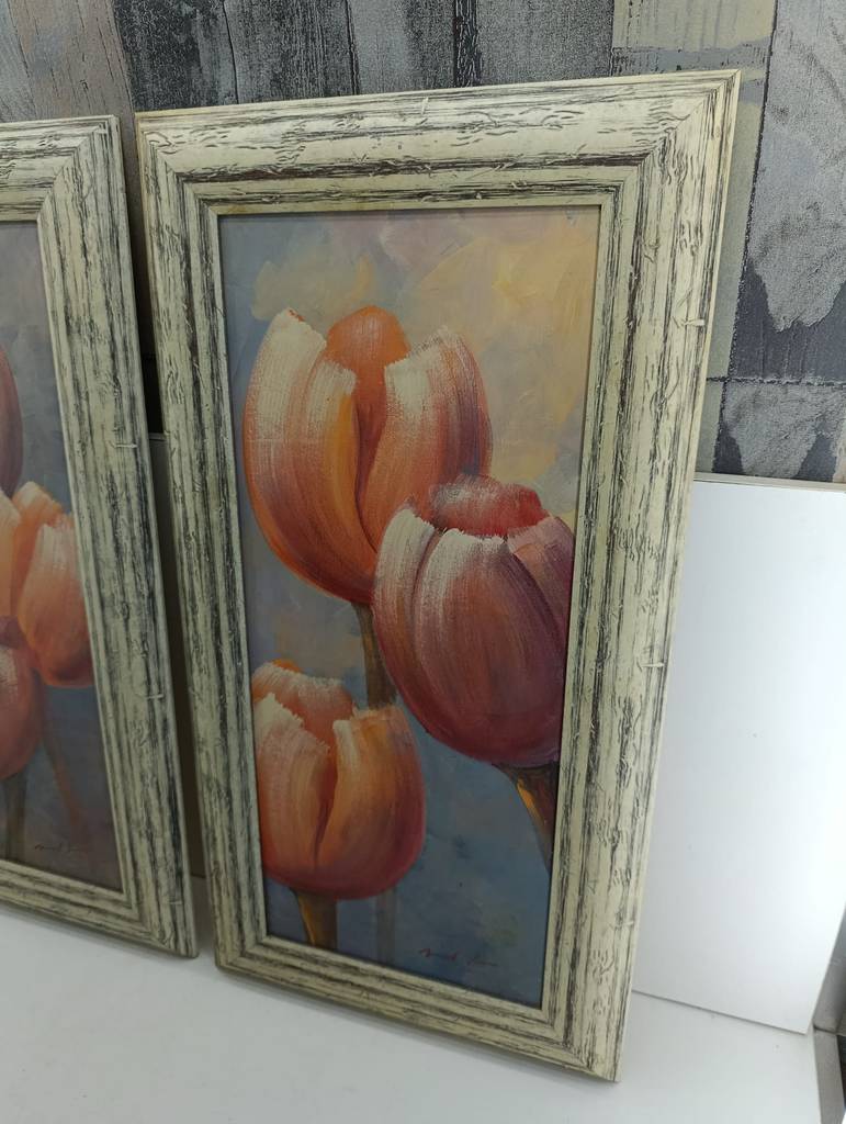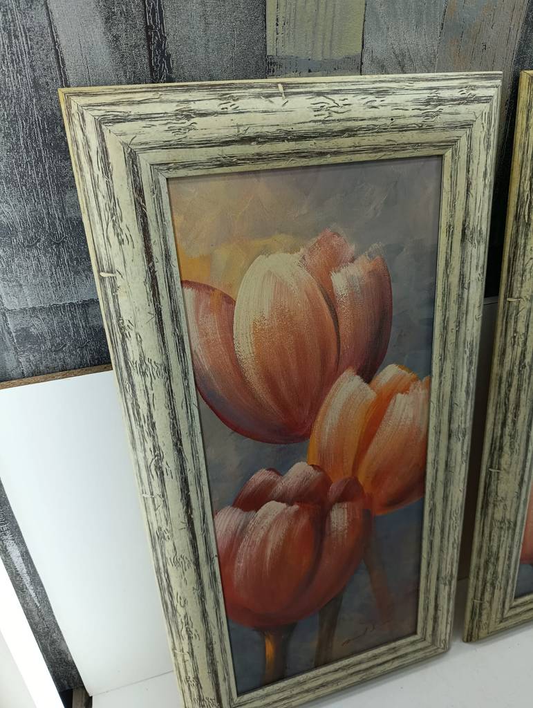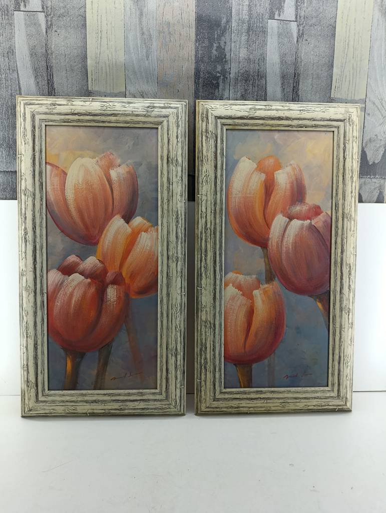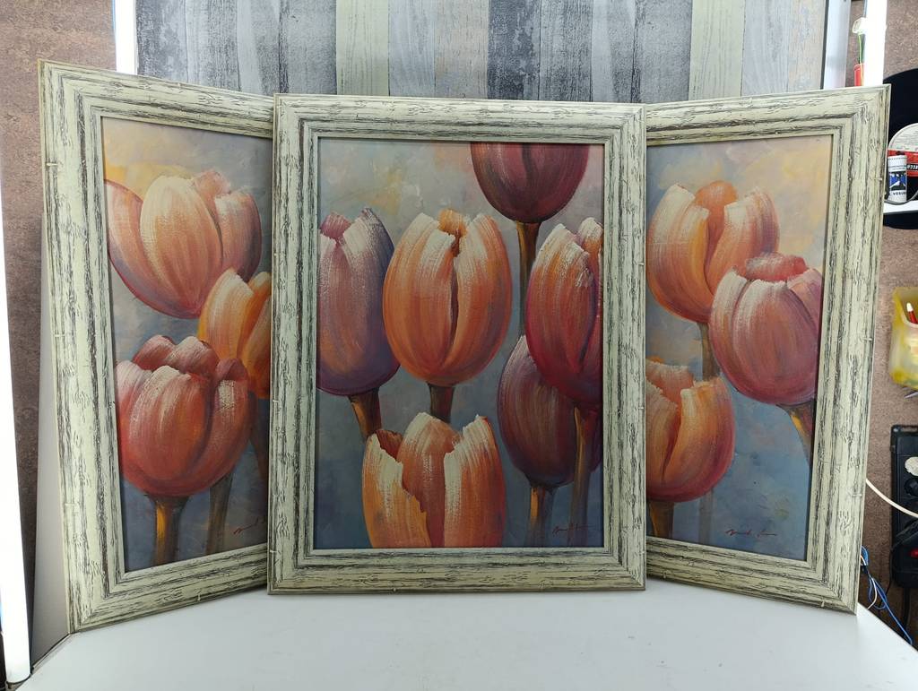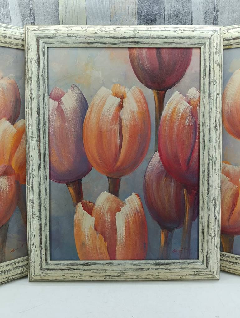 Conjunto compuesto por tres cuadros a juego con motivos de tulipanes muy bonitos y originales. Todos ellos están enmarcados con un marco de madera de buena calidad. Son ideales para colocar en un recibidor o salón comedor de nuestra casa y hacerlos resaltar. Como podemos observar en las fotografías se encuentran en buenas condiciones.