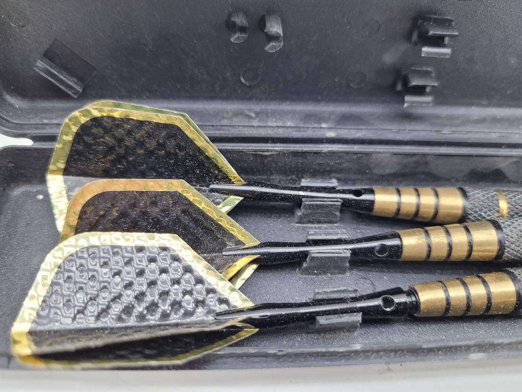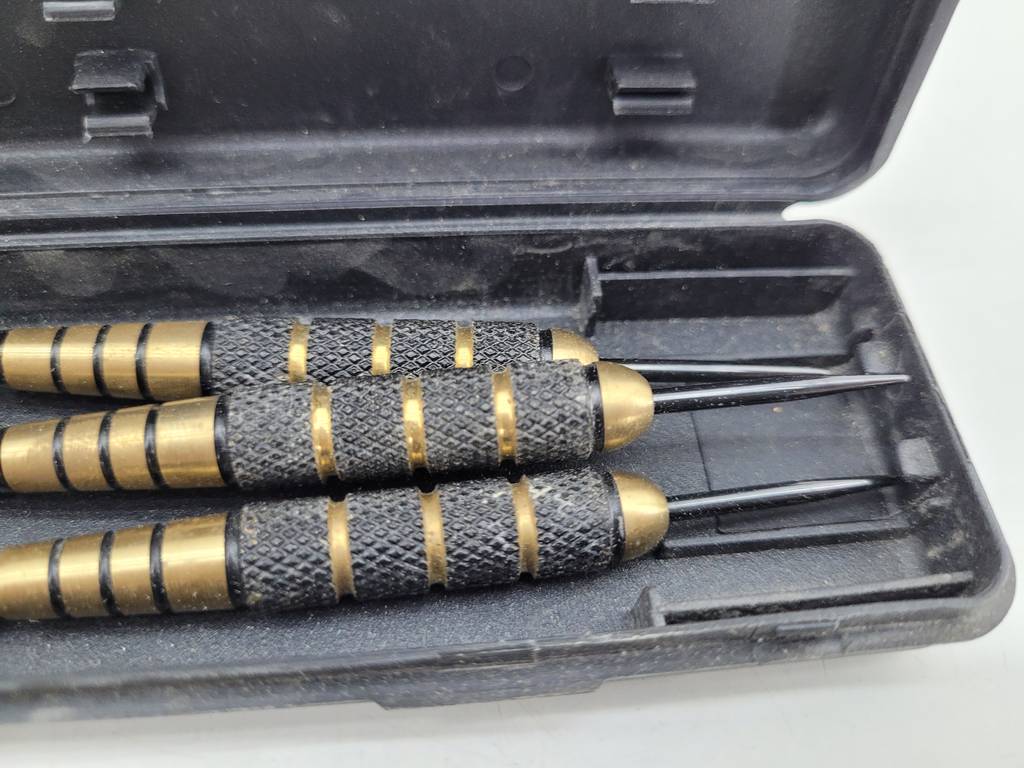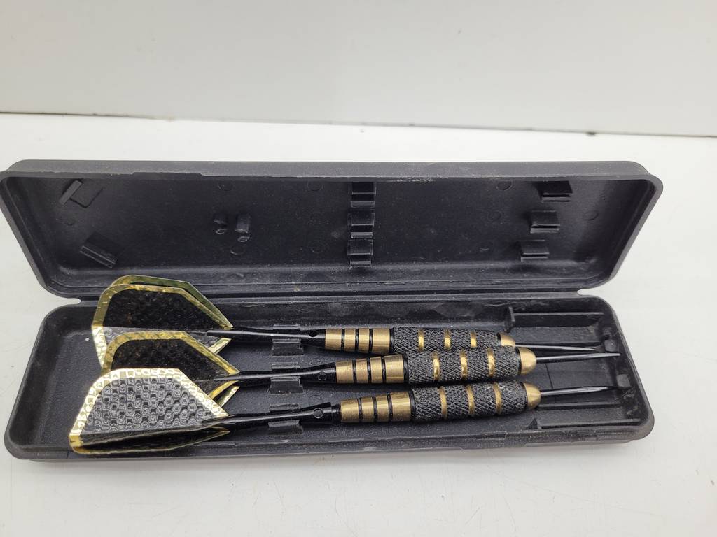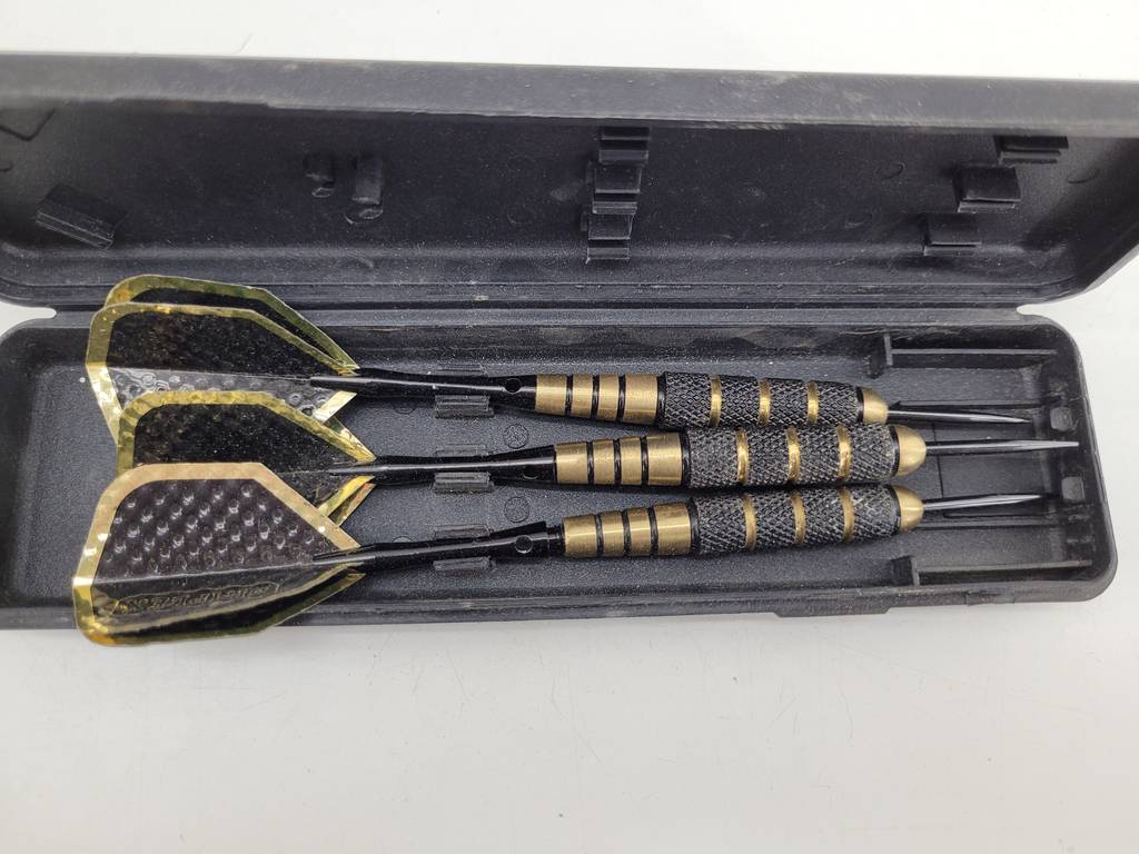 3 dardos de la marca Dimplex con funda de plástico duro negro de buena calidad. Se tratan de unos dardos de buena calidad fabricados con materiales buenos y duraderos. Es ideal tanto para juego ocasional como para campeonatos profesionales. Como podemos observar en las fotografías se encuentra en buenas condiciones y listo para ser utilizado.