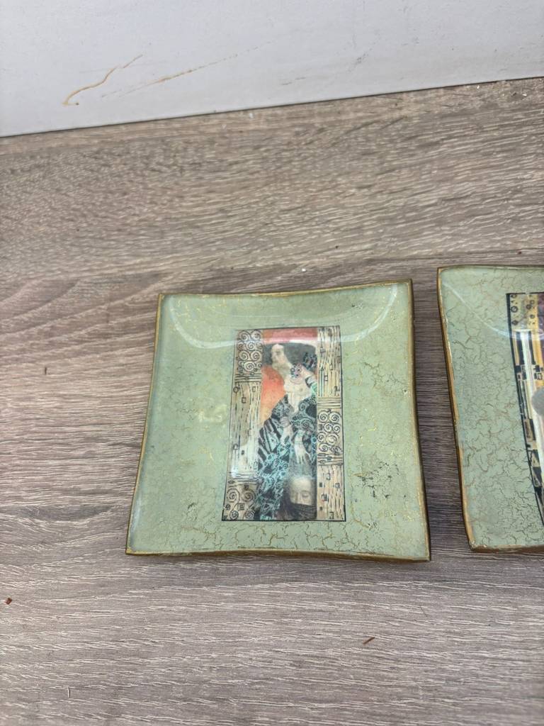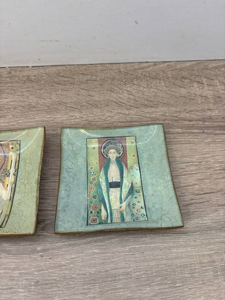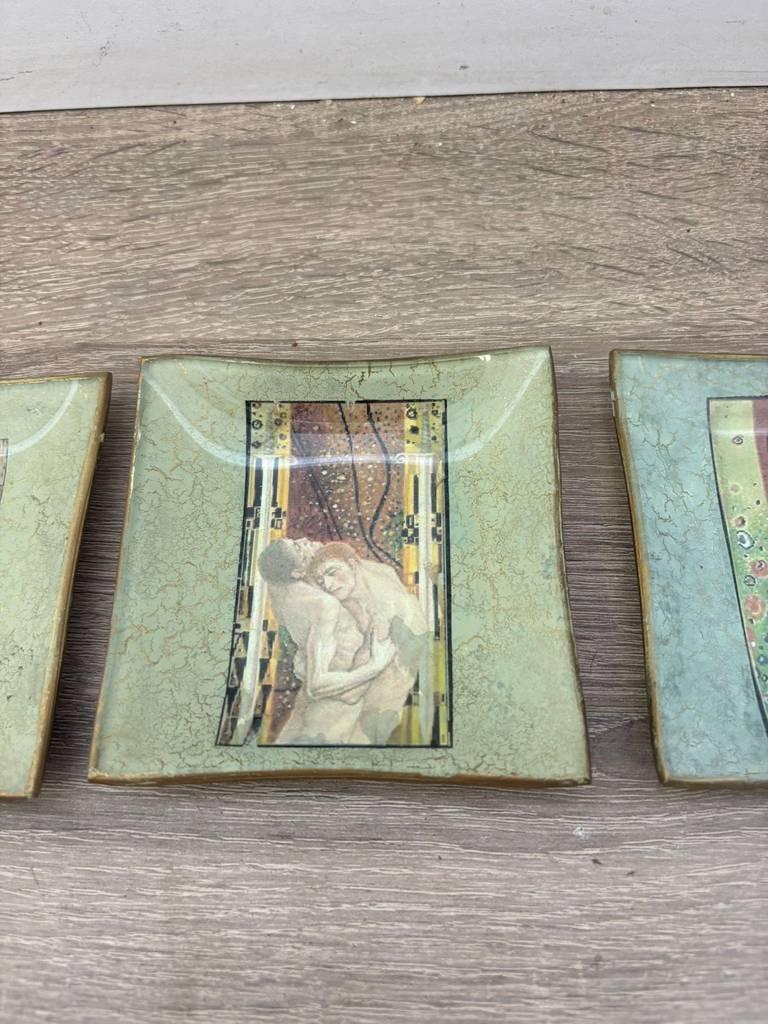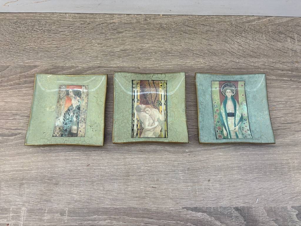 Conjunto formado por tres platos decorativos con ilustraciones de obras del reconocido pintor y artista simbolista austríaco Gustav Klimt. Se trata de tres platos que tienen una forma cuadrada y cada uno de ellos lleva estampada una ilustración obra del famoso artista Klimt. Son unos platos ideales para utilizarlos como elemento decorativo. Como se puede observar en las fotografías se encuentran en buenas condiciones.