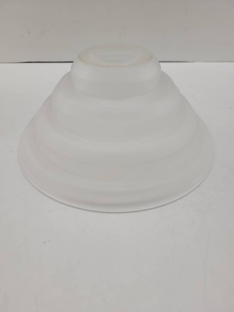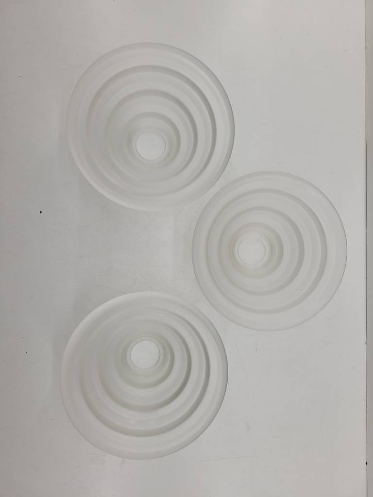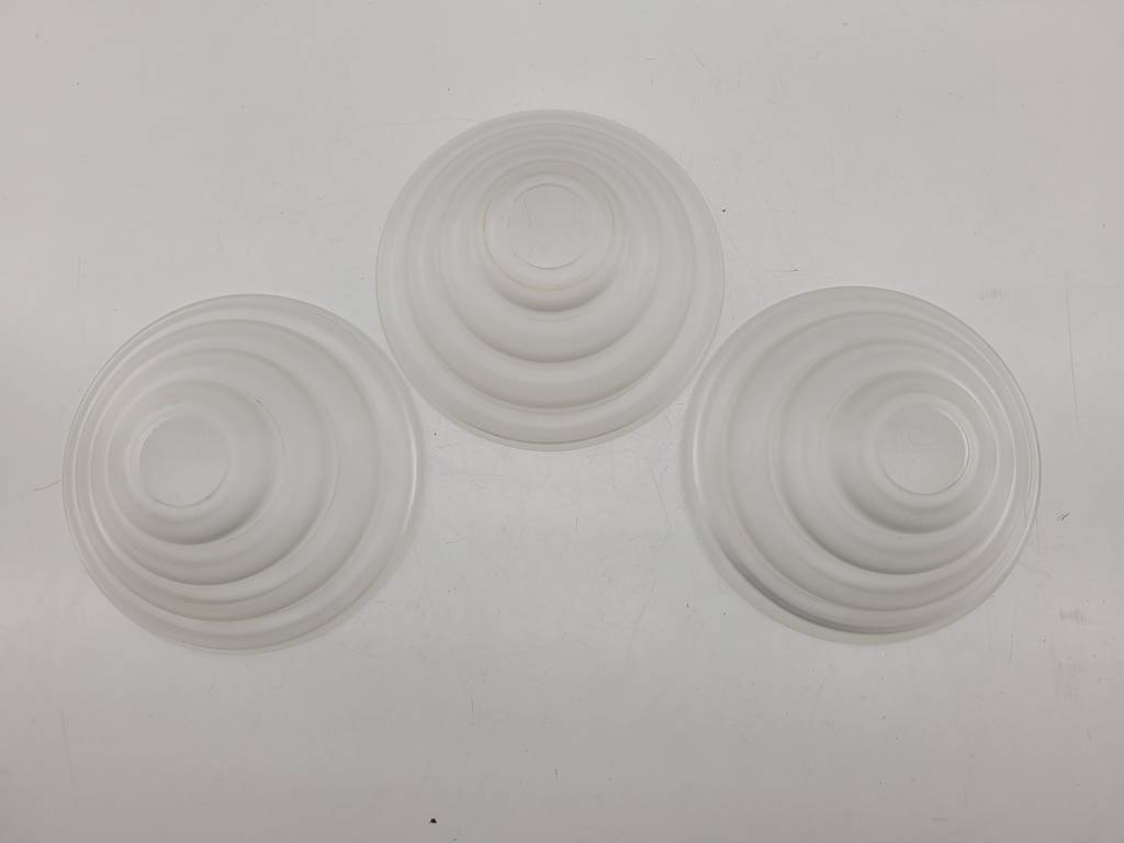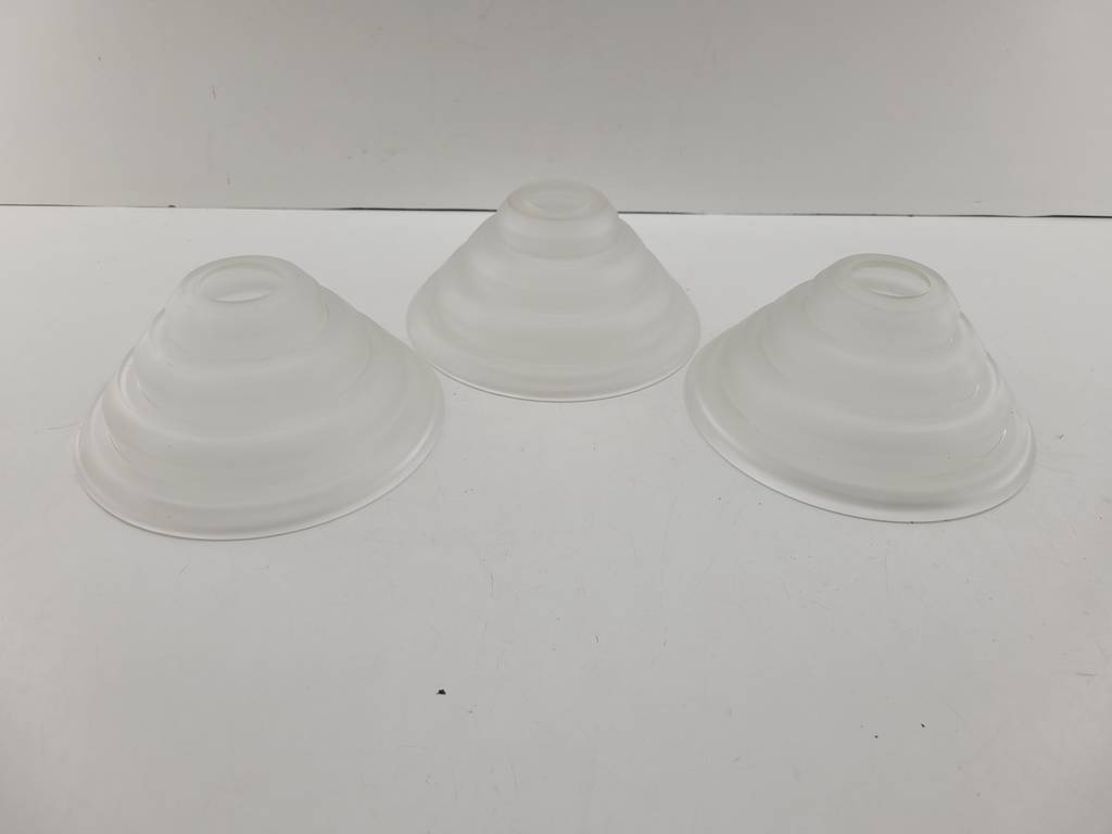 Lote compuesto por tres tulipas de cristal mate grueso de buena calidad. Se trata de unas tulipas muy originales en forma de cono y escalera, ideales para sustituir unas lámparas o apliques antiguos. Tienen una boca con un diámetro de 4cm. Como podemos observar en las fotografías se encuentran en buenas condiciones y listas para ser colocadas.