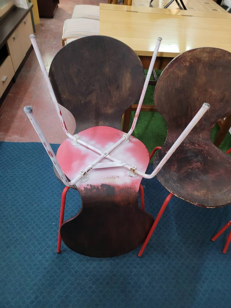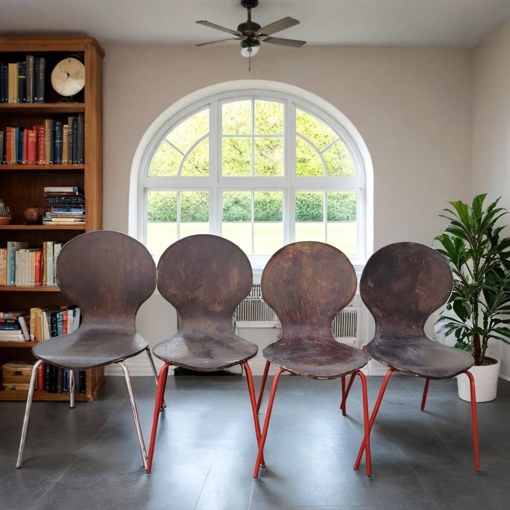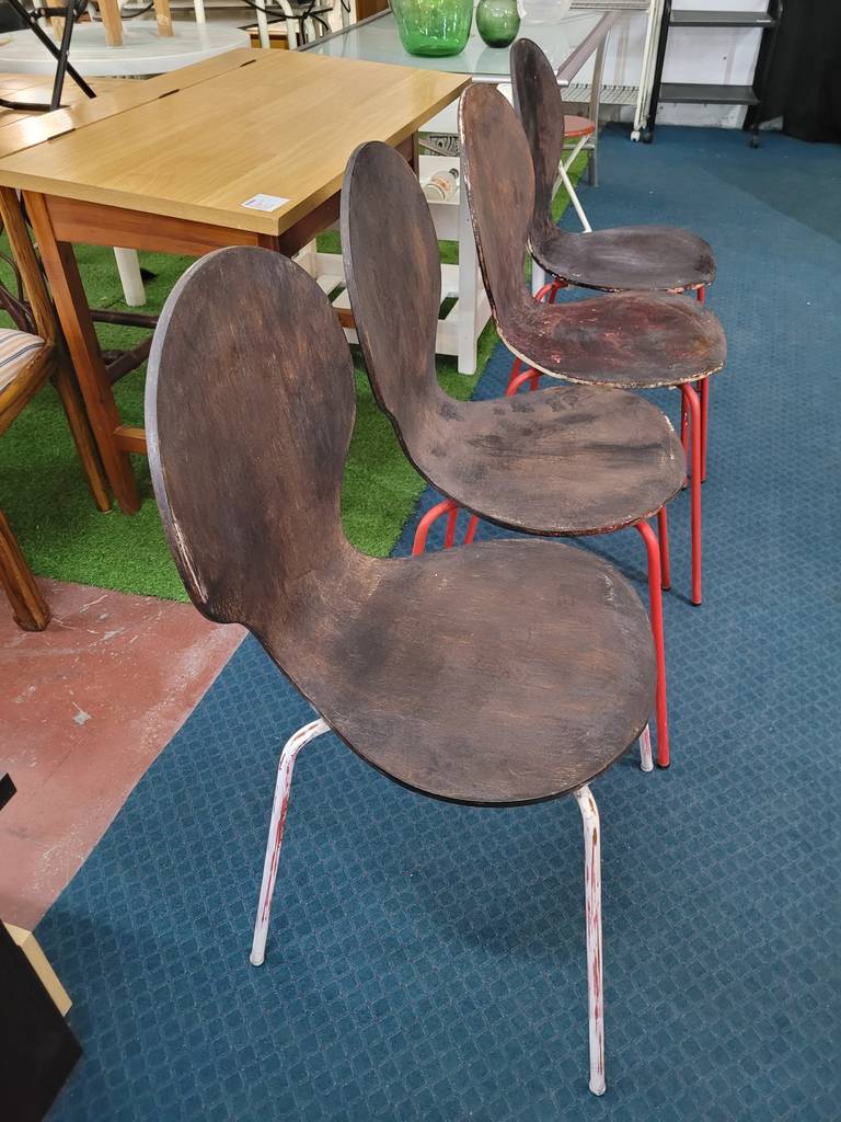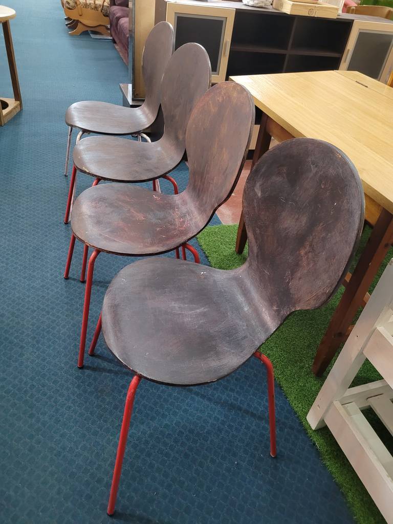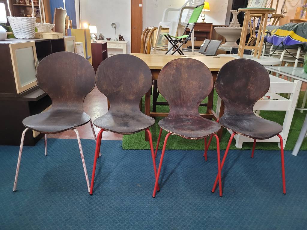 Lote formado por cuatro sillas apilables de color marrón oscuro. Se trata de cuatro sillas que tienen cuatro patas robustas y un asiento que va unido al respaldo. Son unas sillas perfectas para colocarlas alrededor de una mesa en un salón comedor y que se pueden apilar fácilmente. Como se puede observar en las fotografías se encuentran en buenas condiciones.