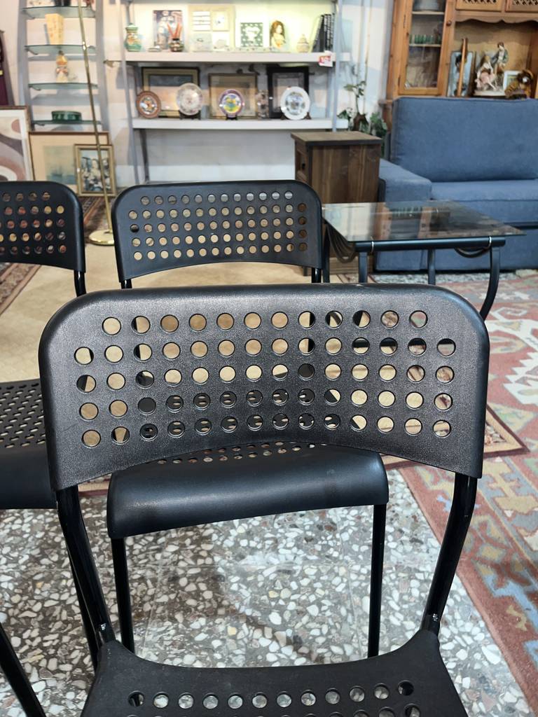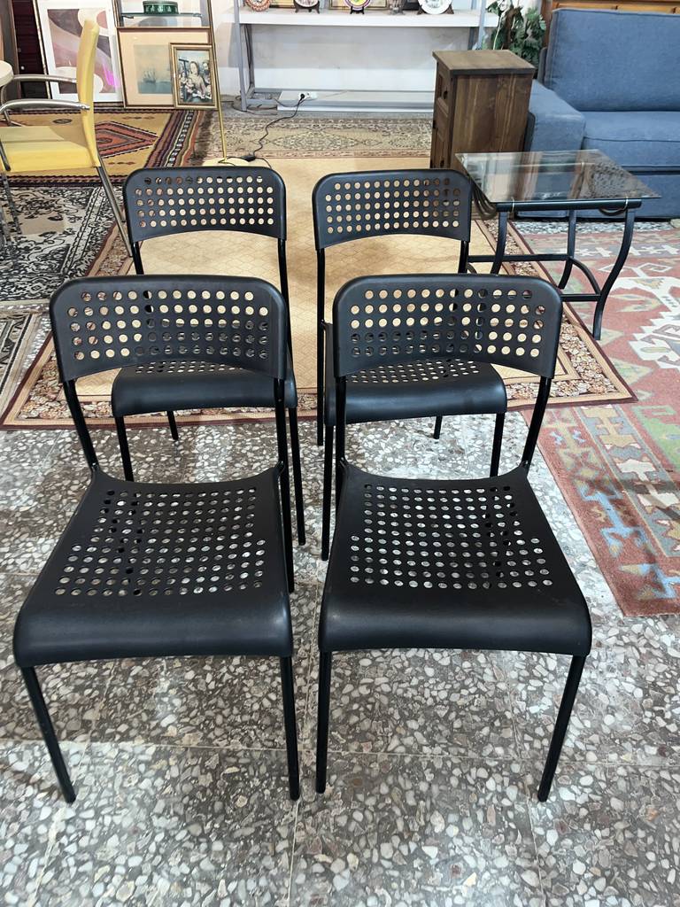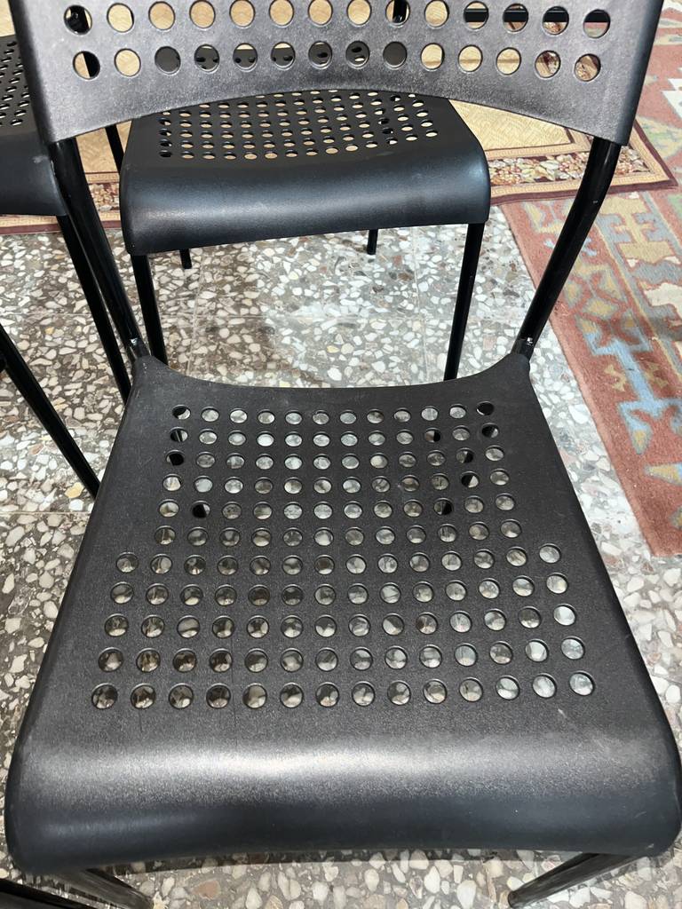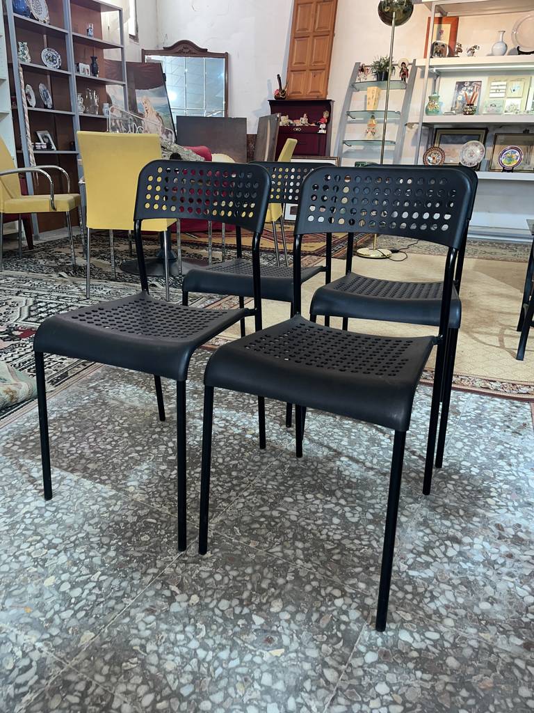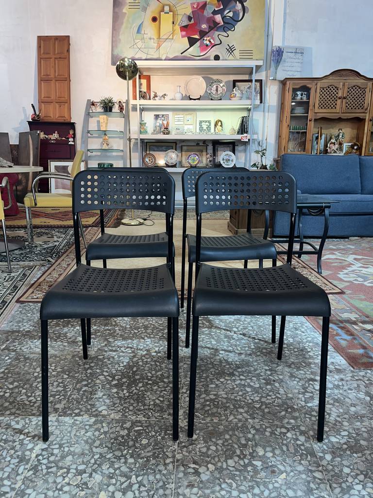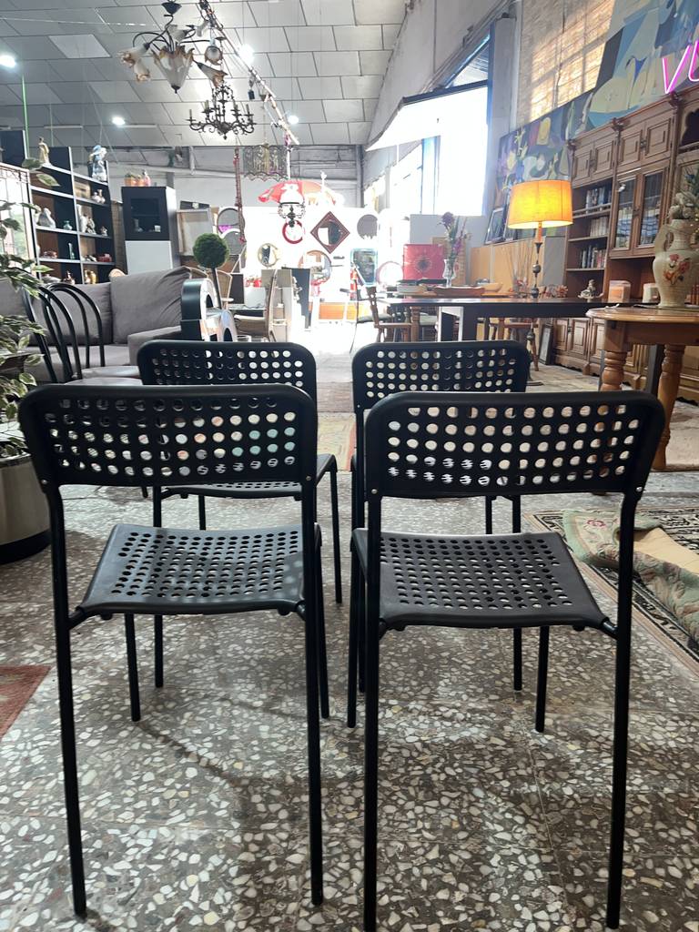 Lote compuesto por cuatro sillas de color negro con un asiento y respaldo originales formado por pequeños agujeros y realizados con plástico duro de buena calidad. Su estructura es de metal y lacada en color negro. Son unas sillas muy versátiles, ideales para colocar en una cocina o salón comedor acompañadas de una buena mesa. Como podemos observar en las fotografías se encuentran en buenas condiciones.