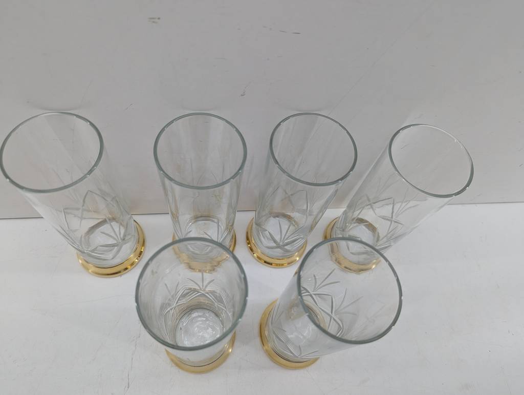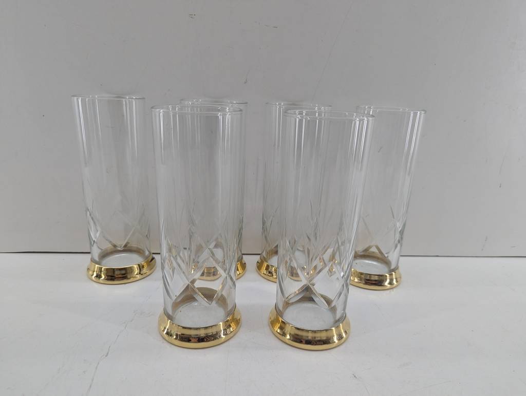 Conjunto formado por seis vasos de tubo transparentes con la base redonda y dorada. Se trata de seis vasos de talla E que tienen la superficie tallada con elegantes líneas. Son unos vasos perfectos para tenerlos tanto en una cocina como en un salón comedor de un hogar clásico y distinguido. Como se puede observar en las fotografías se encuentran en buenas condiciones.