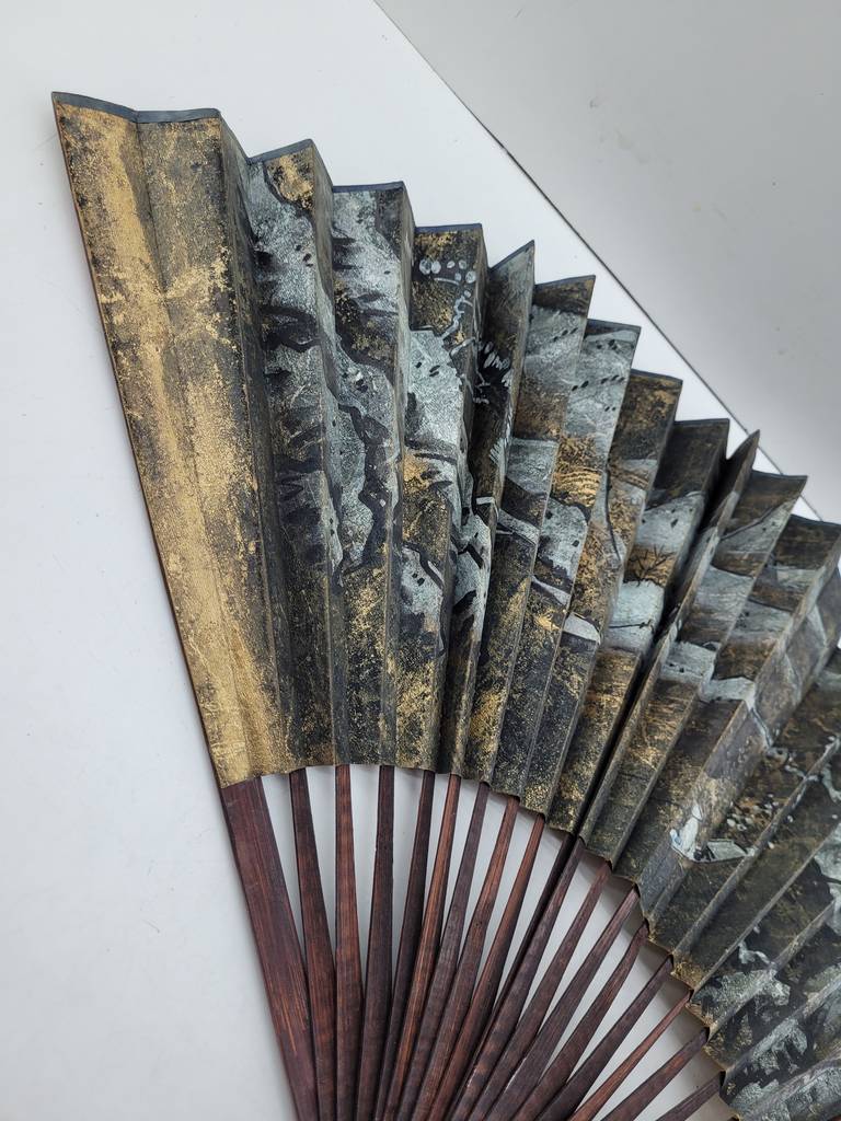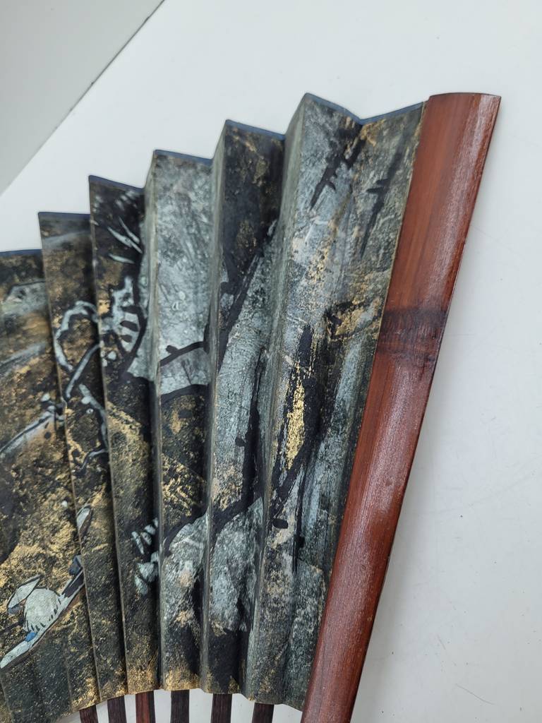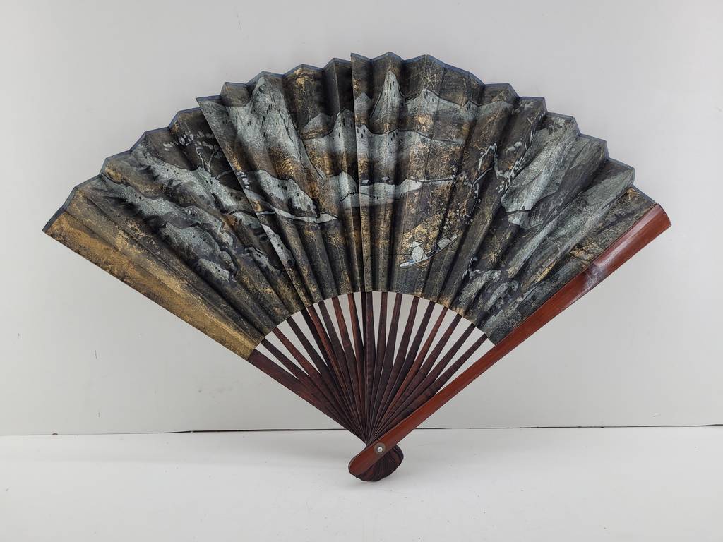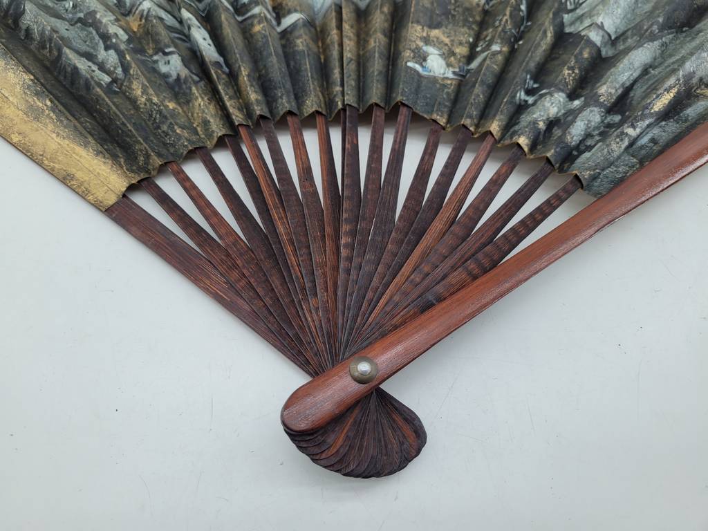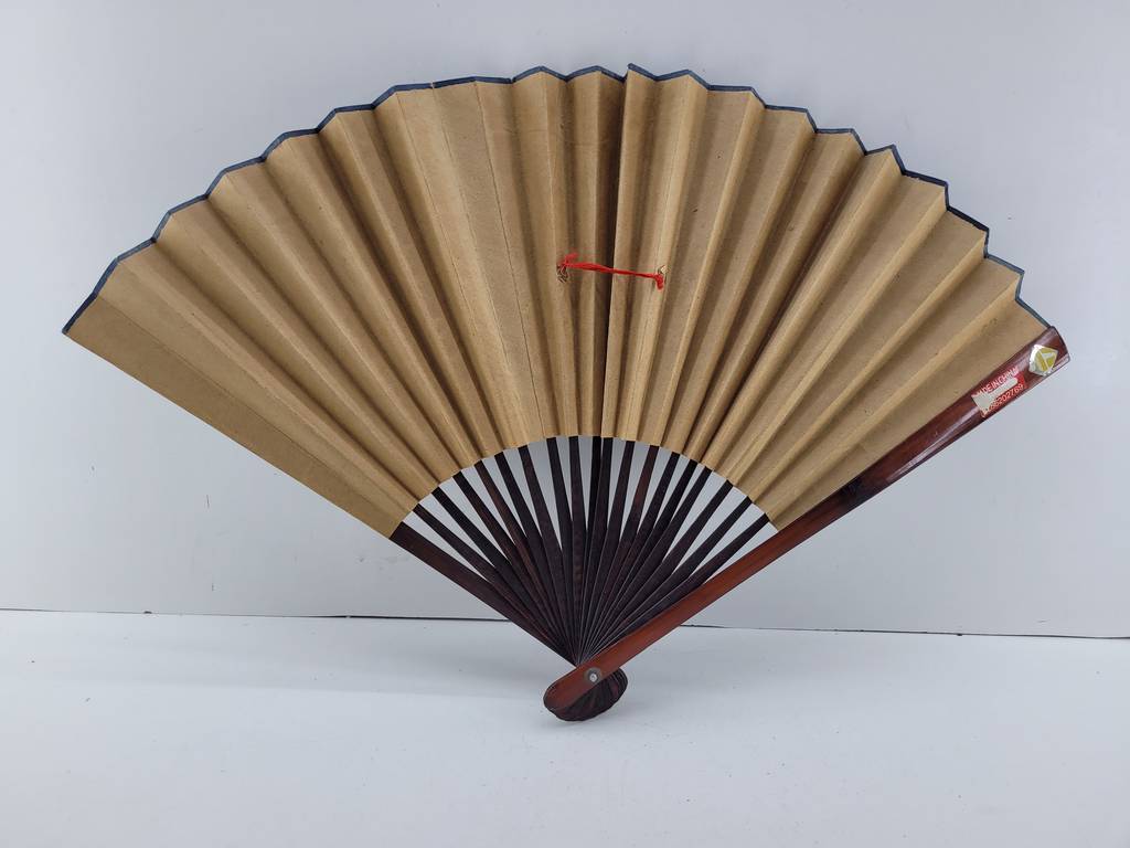 Abanico decorativo con motivos orientales de colores oscuros. Se trata de un abanico que está fabricado en tela de buena calidad y en madera de color marrón oscuro. Es un abanico que se puede utilizar como elemento decorativo para colocarlo encima de una cómoda o de una estantería en un salón comedor. Como se puede observar en las fotografías se encuentra en buenas condiciones.