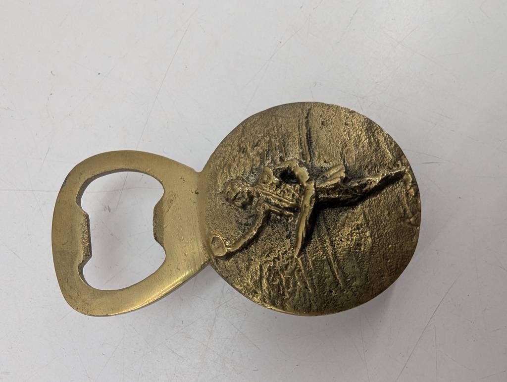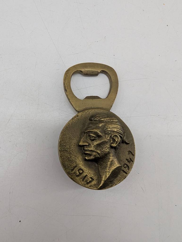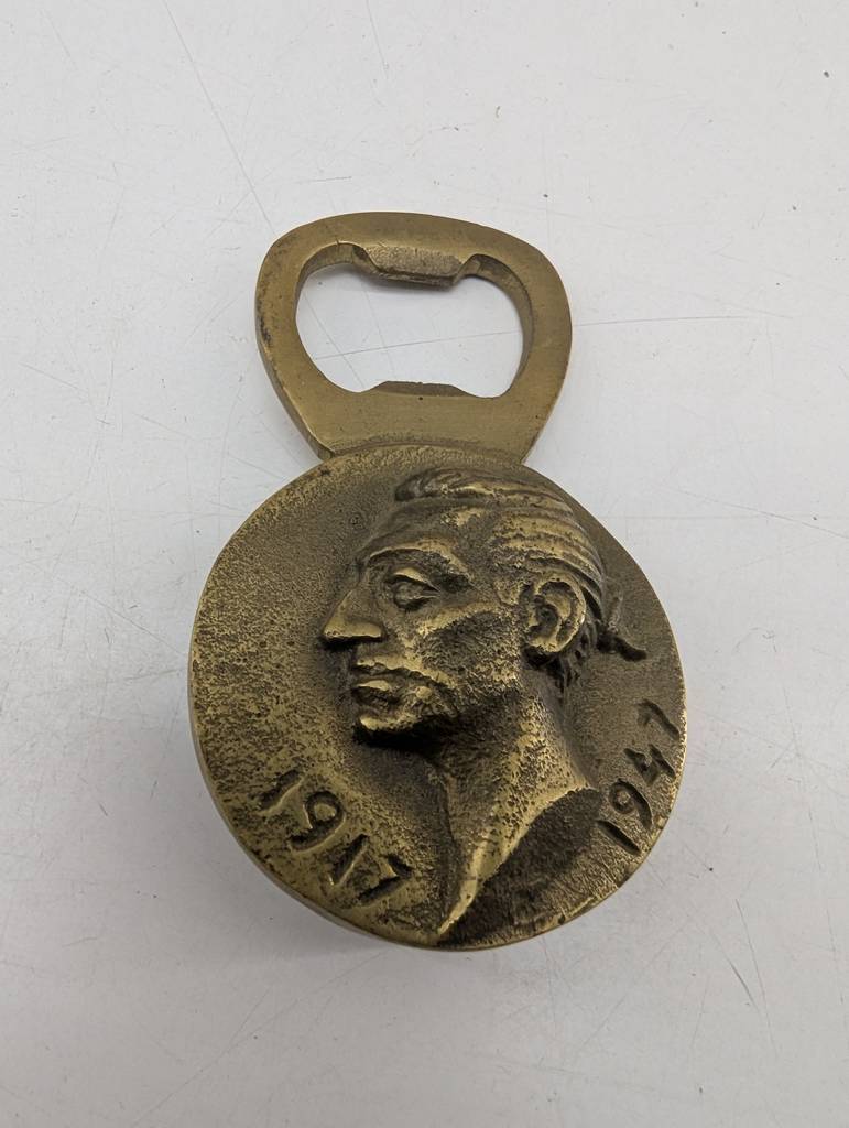 Abridor de bronce macizo del famoso torero Manolete. Se trata de un abridor de botellas fabricado en bronce macizo que lleva grabada la imagen del famoso torero Manolete y lleva inscritas las fechas 1917 y 1947. Es un abridor muy práctico que resulta perfecto para tenerlo en el hogar o para coleccionistas. Como se puede observar en las fotografías se encuentra en buenas condiciones.