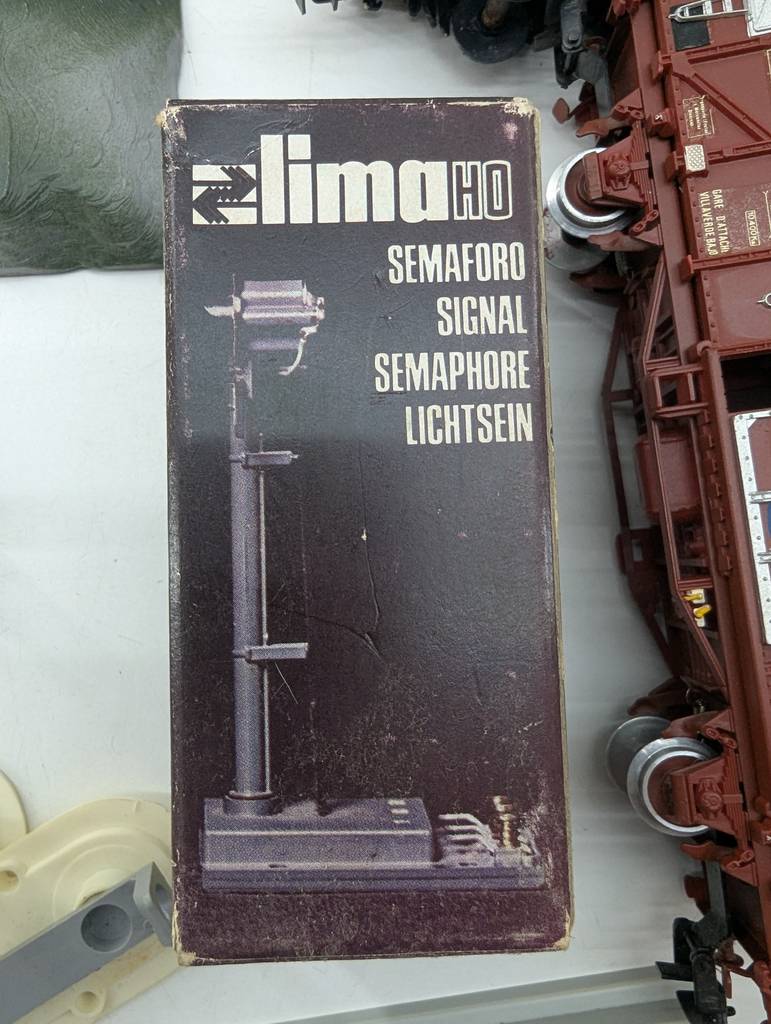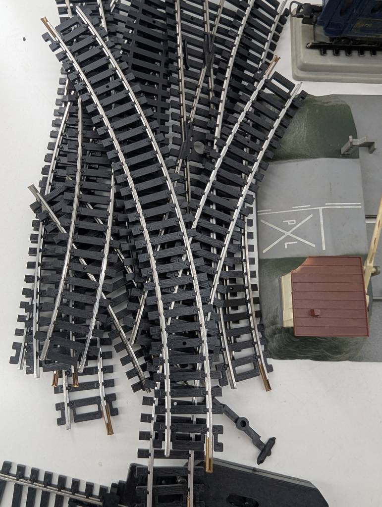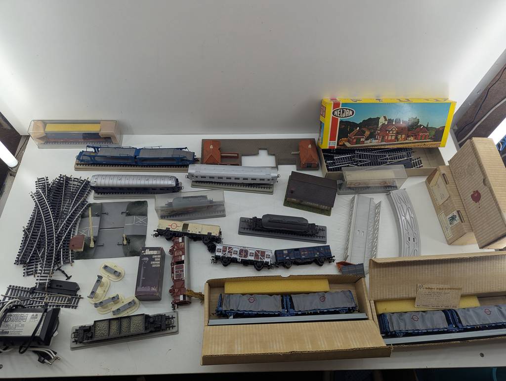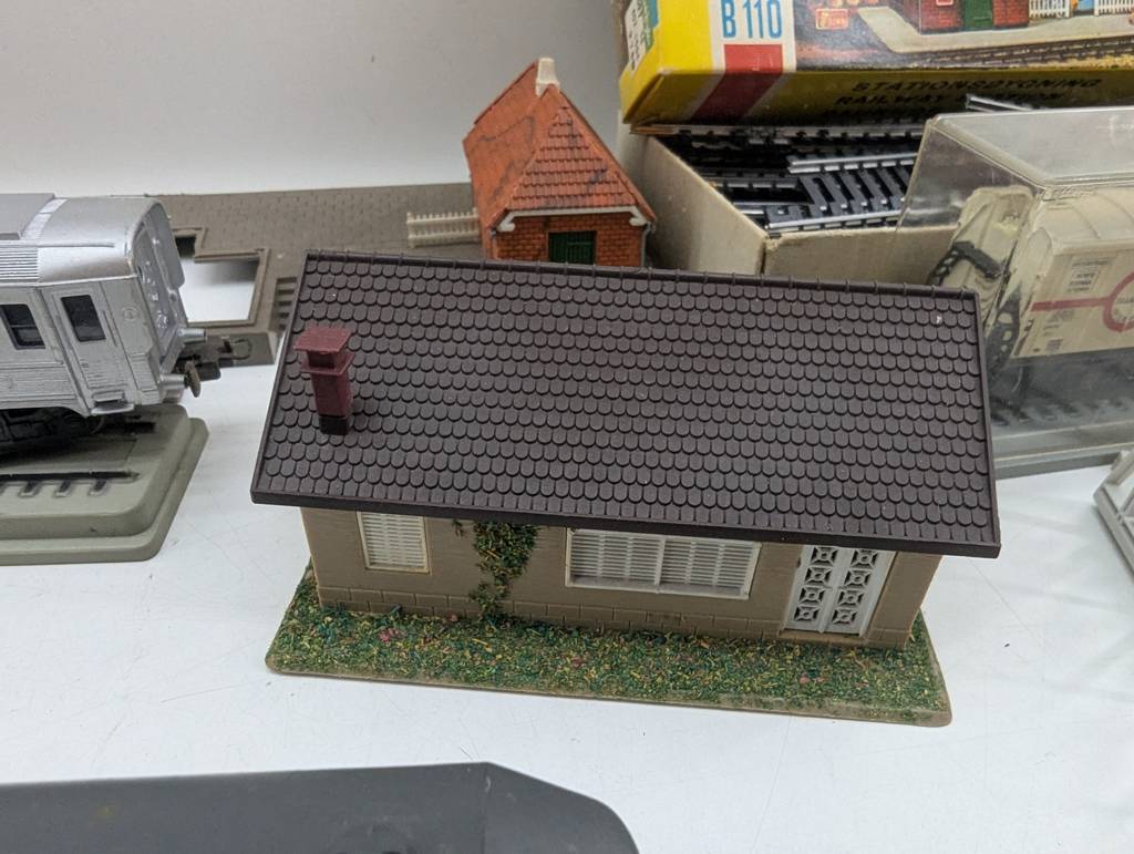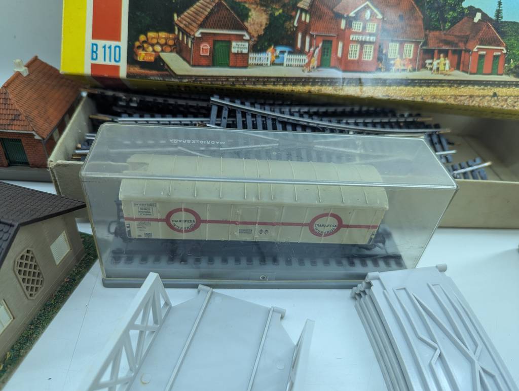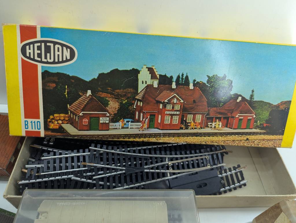Conjunto de accesorios de tren de juguete de la marca Heljan a escala 1/87. Se trata de un pack de accesorios para jugar con un tren de juguete entre los que se encuentran un conjunto de vías, casitas, vagones, semáforos y otros elementos con los que crear una estación de tren completa. Es un conjunto ideal para coleccionistas. Como se puede observar en las fotografías se encuentran en buenas condiciones.
