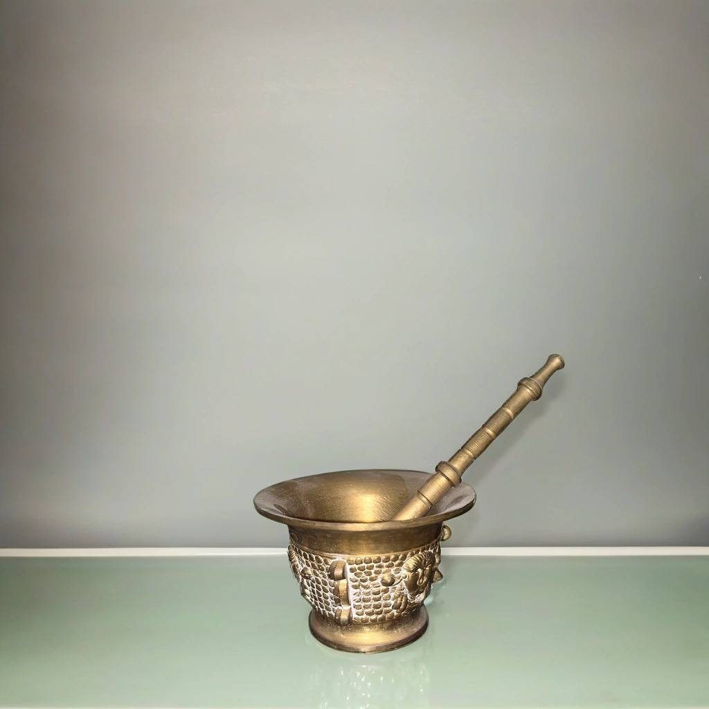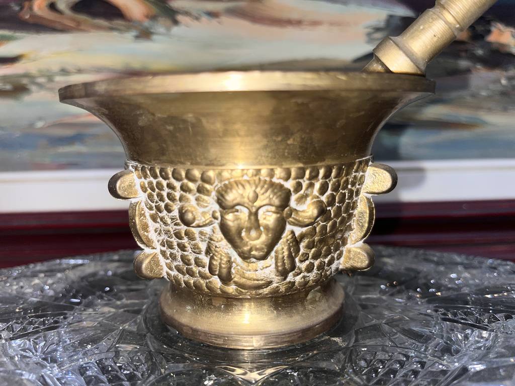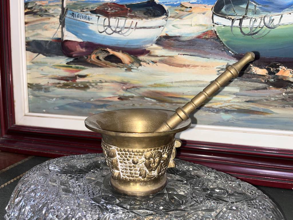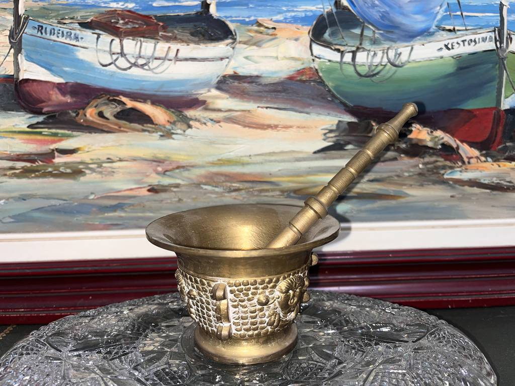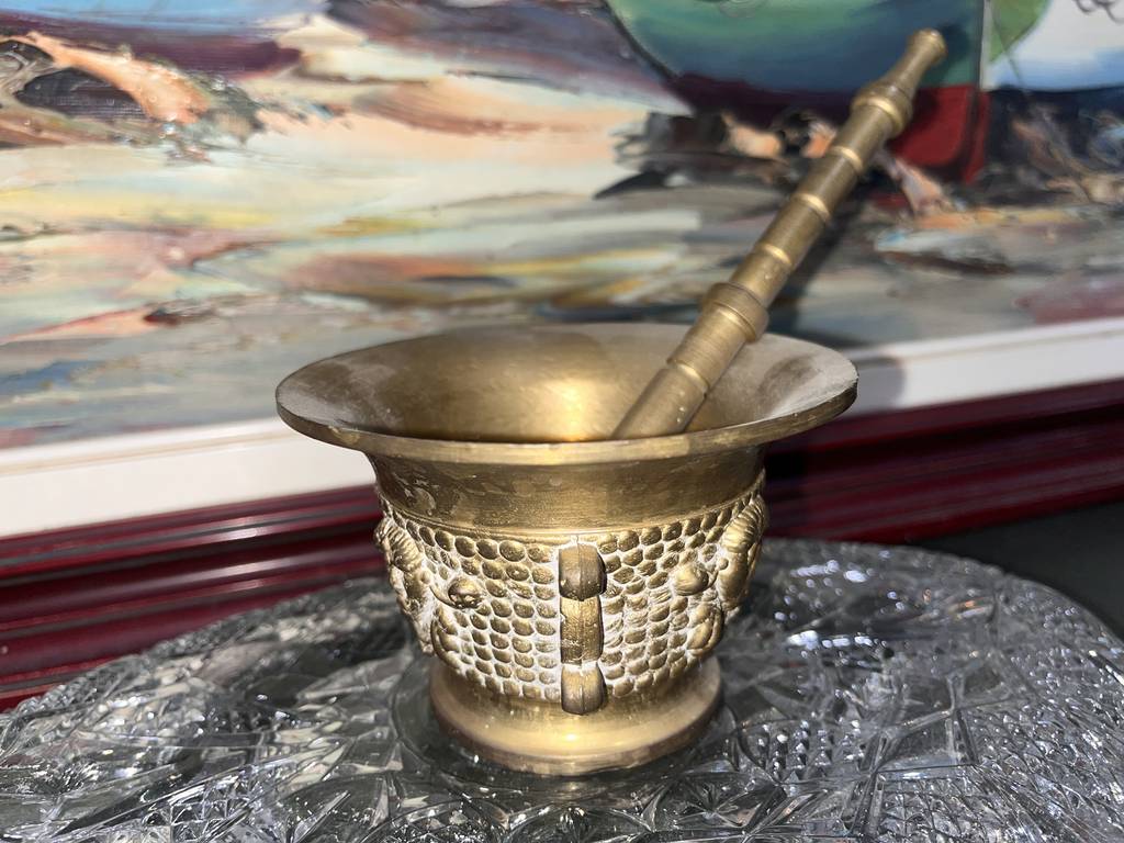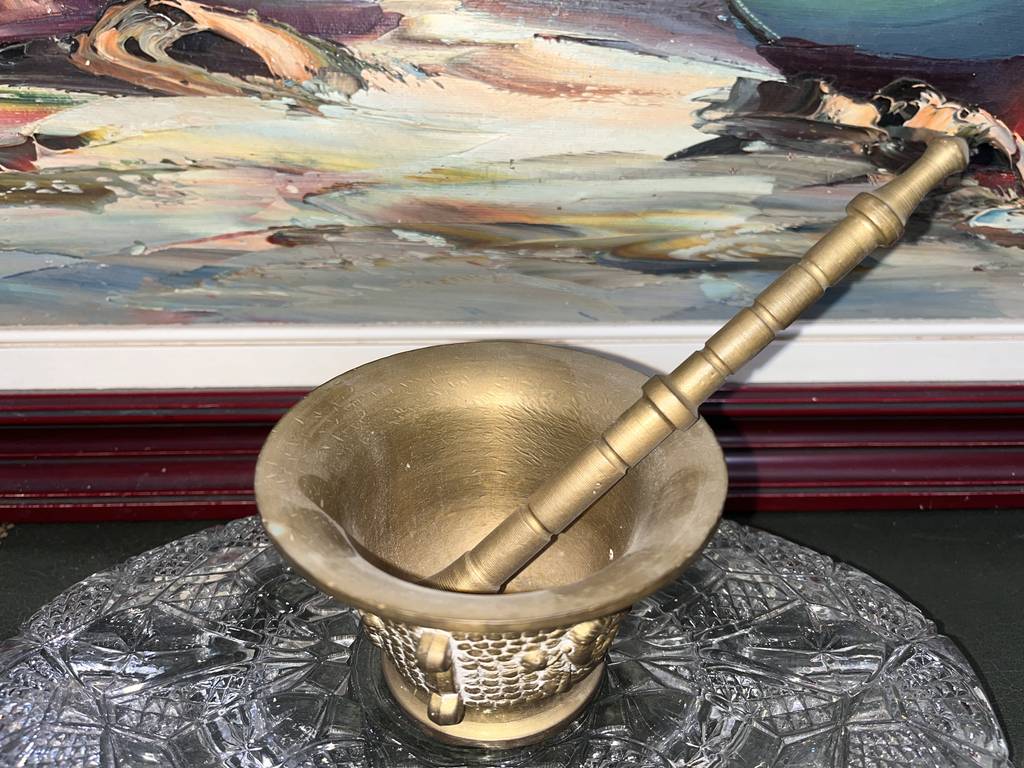 Almirez o mortero fabricado con un material de color dorado que resulta resistente y duradero. Se trata de un almirez o mortero de tamaño mediano que va acompañado de un palo para poder utilizarlo completamente. Es un mortero muy bonito que se puede utilizar de manera decorativa o para picar alimentos. Como se puede observar en las fotografías se encuentra en buenas condiciones.