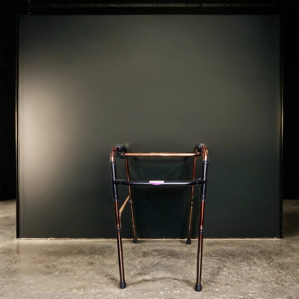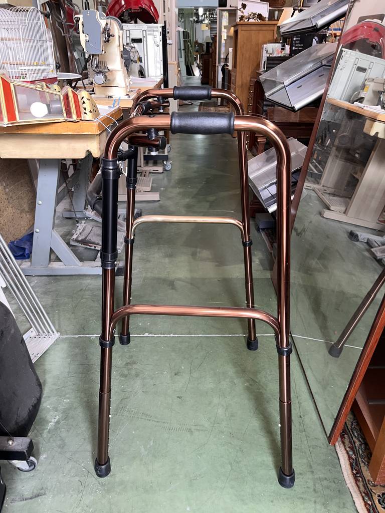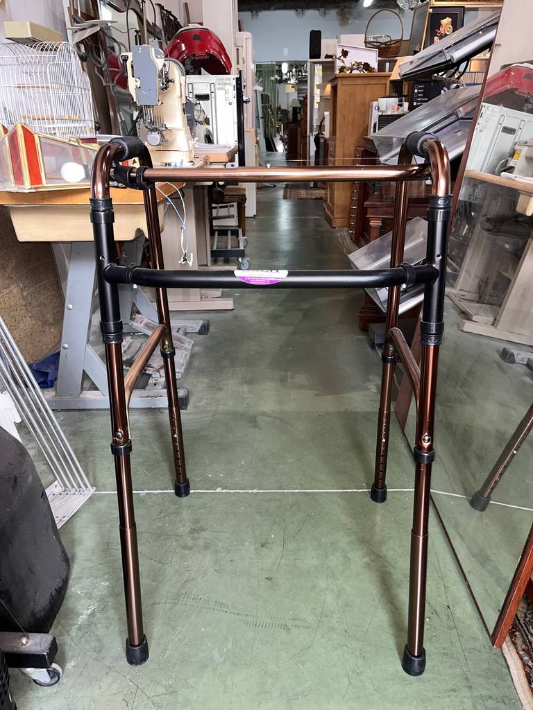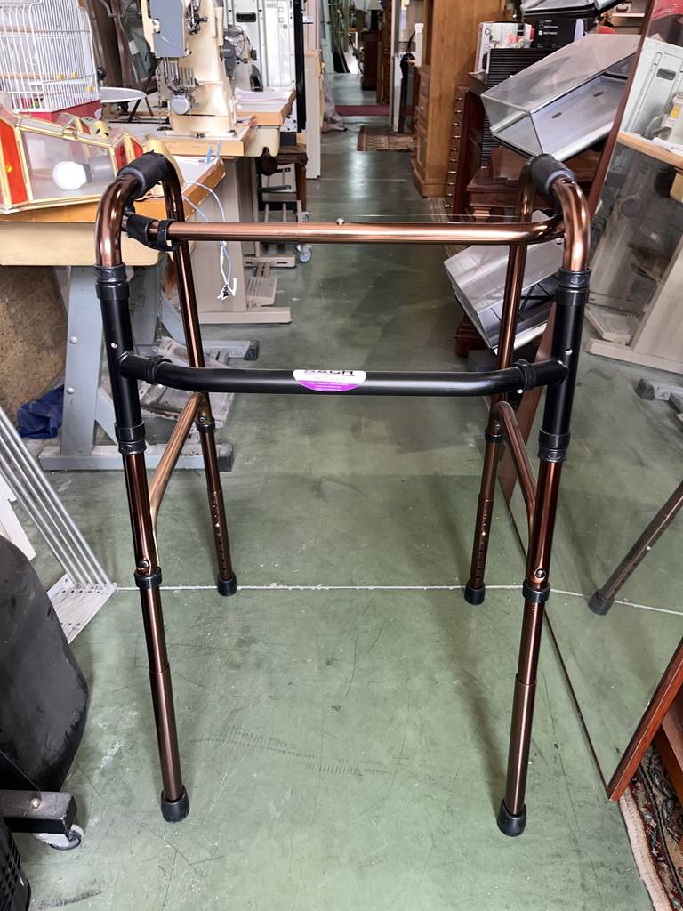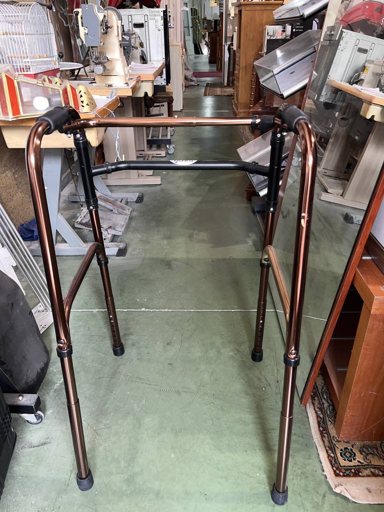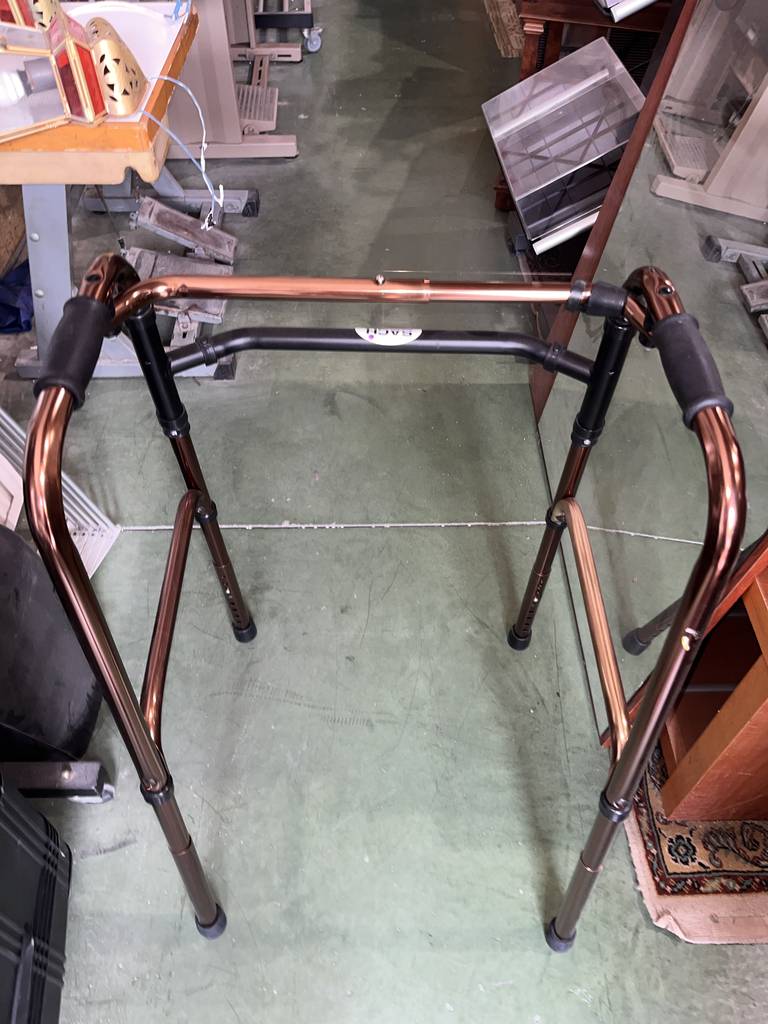 Andador fabricado con materiales de buena calidad de color cobre. Se trata de un andador que cuenta con cuatro patas y tiene una parte superior donde agarrarse para cogerlo con mayor facilidad. El andador es muy práctico para aquellas personas que tienen movilidad reducida o les cuesta andar. Como se puede observar en las fotografías se encuentra en buen estado.