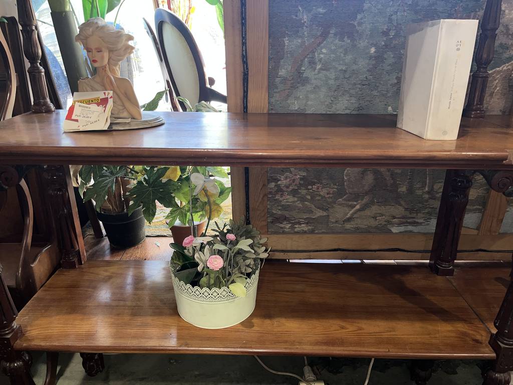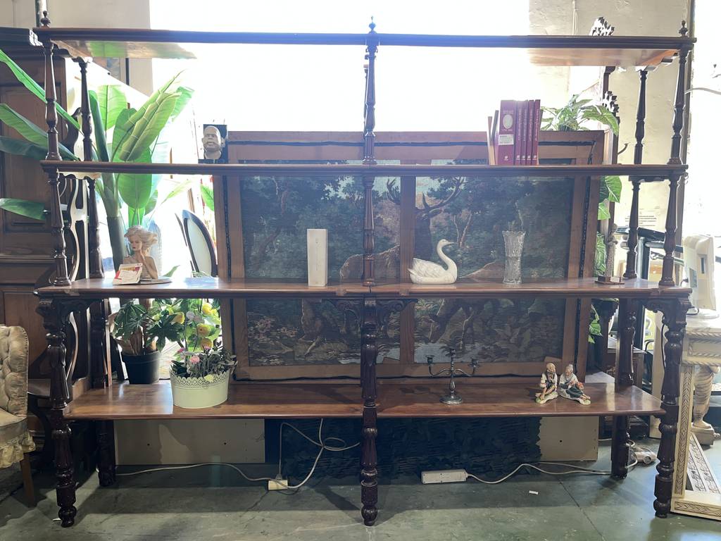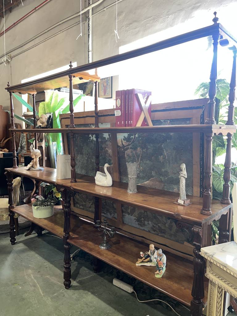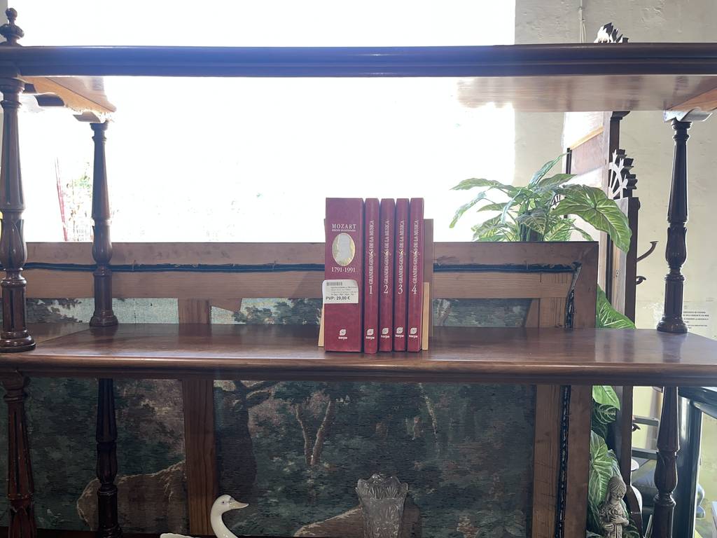 Estantería antigua fabricada en madera de buena calidad de color marrón oscuro. Se trata de una estantería de grandes dimensiones que cuenta con tres baldas largas y estrechas unidas por finos listones de madera verticales. Es una estantería ideal para ponerla en un salón comedor de estilo clásico. Como se puede observar en las fotografías se encuentra en buenas condiciones.