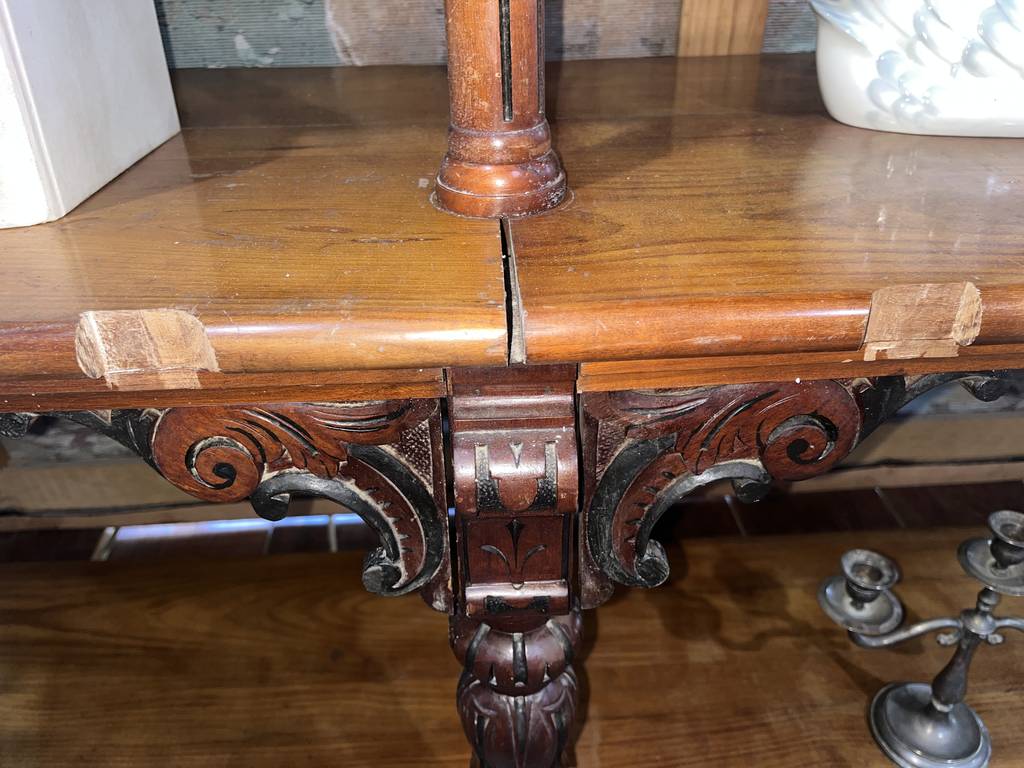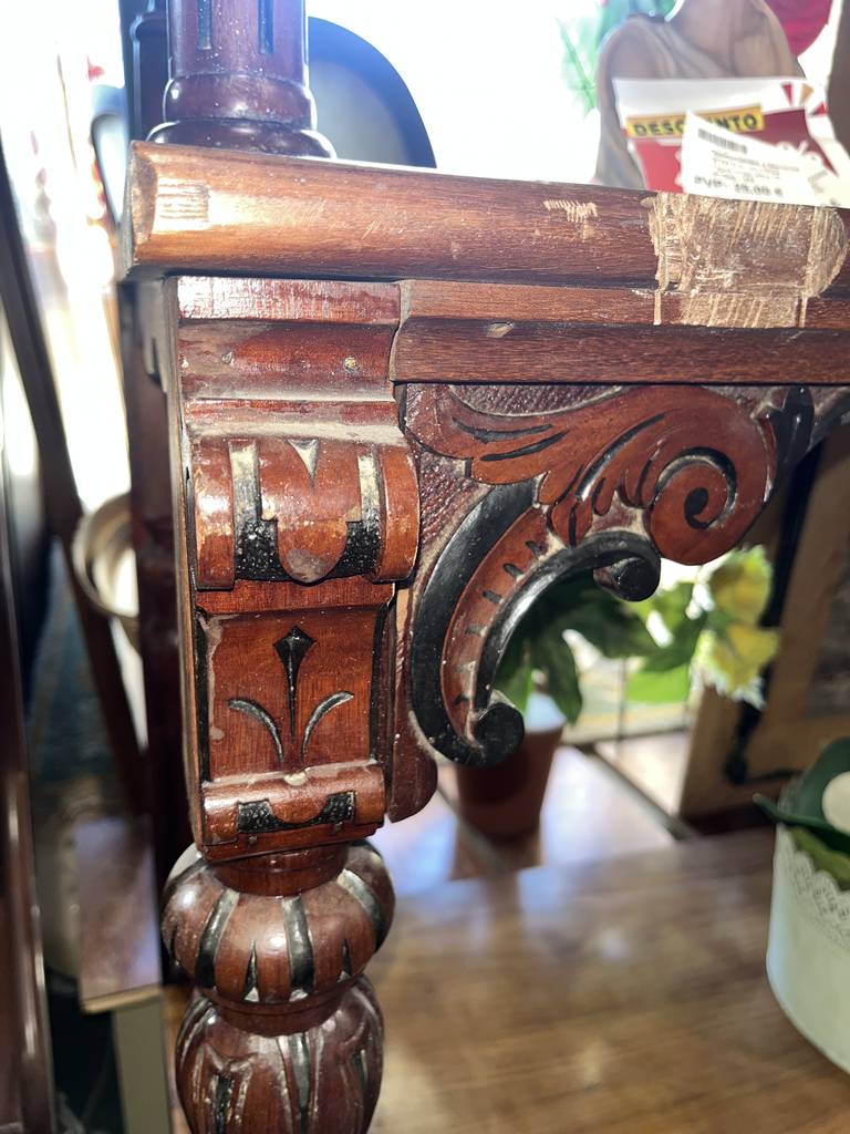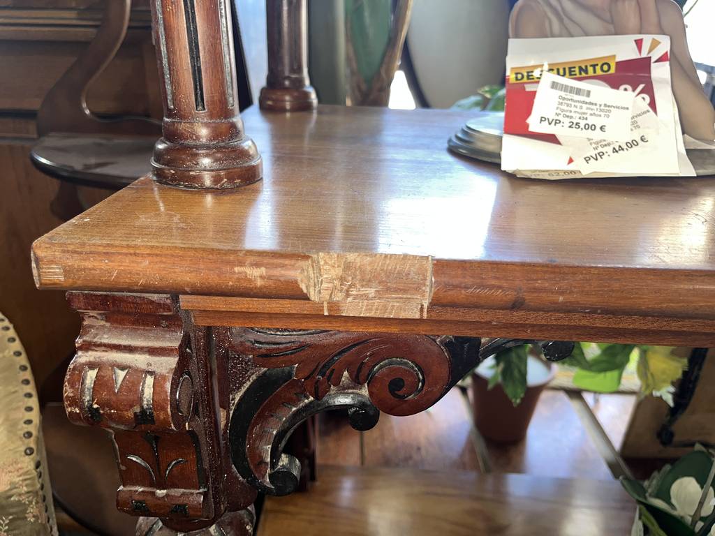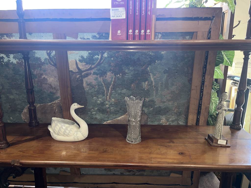Estantería antigua fabricada en madera de buena calidad de color marrón oscuro. Se trata de una estantería de grandes dimensiones que cuenta con tres baldas largas y estrechas unidas por finos listones de madera verticales. Es una estantería ideal para ponerla en un salón comedor de estilo clásico. Como se puede observar en las fotografías se encuentra en buenas condiciones.