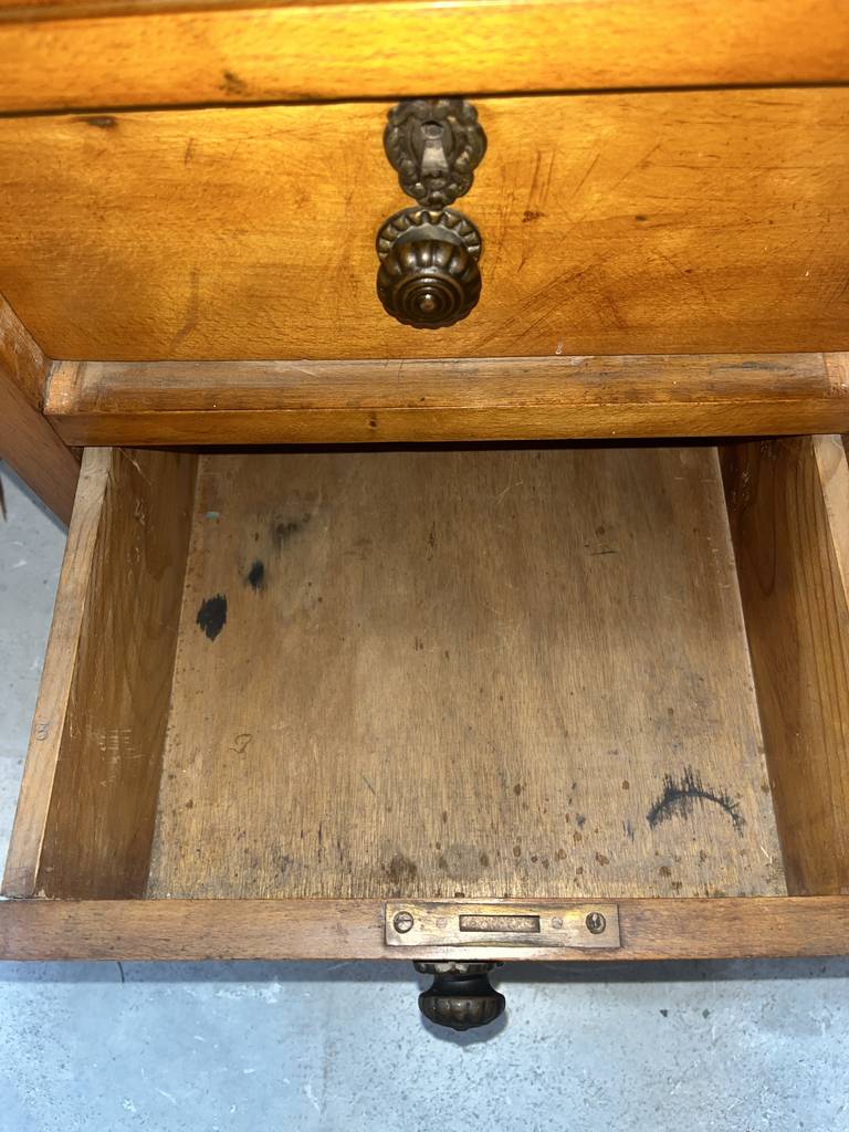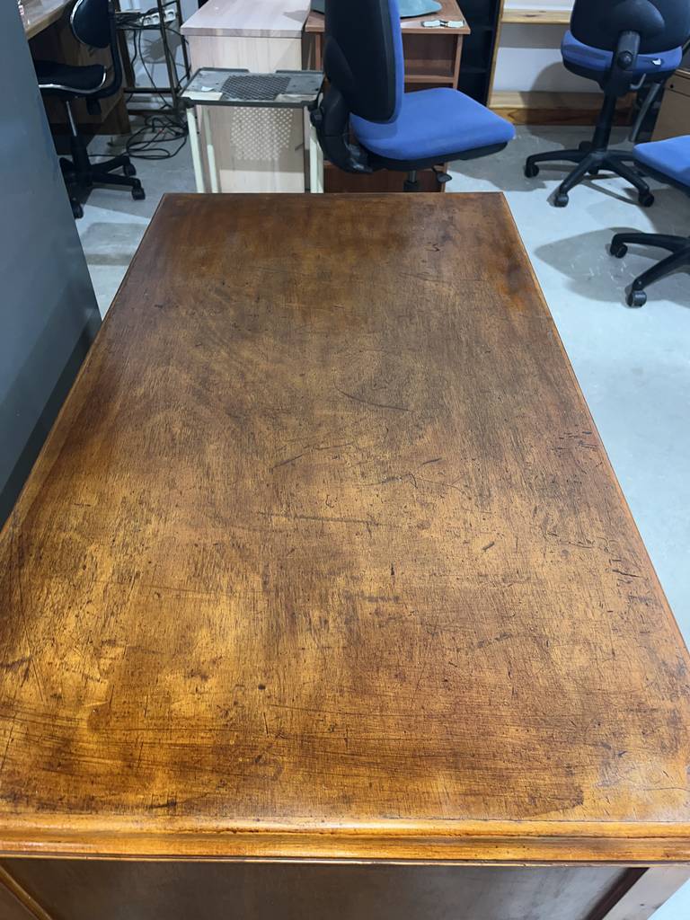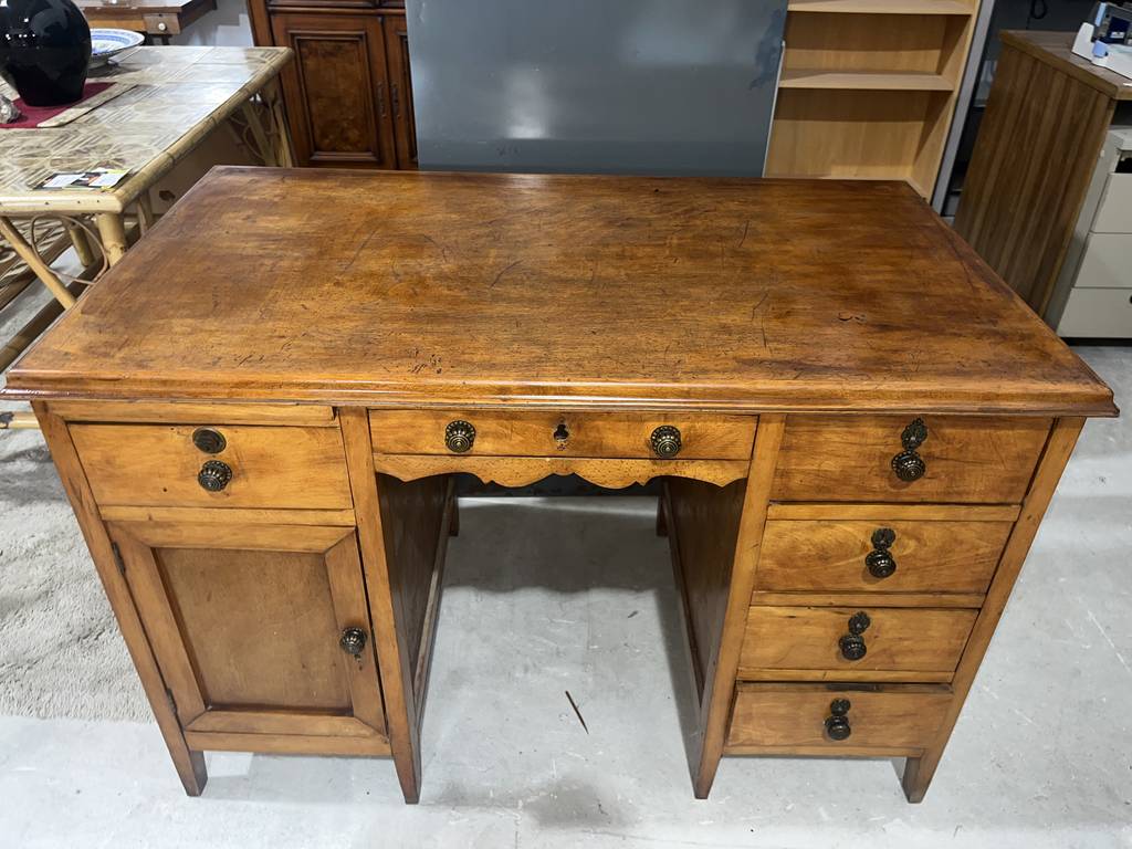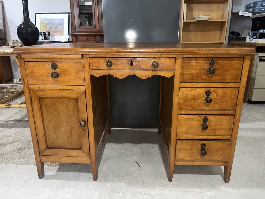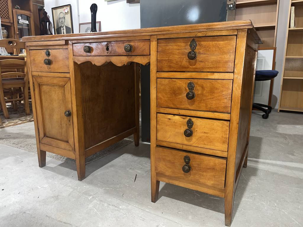 Antiguo escritorio fabricado en madera de buena calidad de color marrón claro. Se trata de un antiguo escritorio que cuenta con cuatro cajones en un lateral y una puerta con otro cajón en el otro lateral, además en la zona central cuenta con otro cajón. Es un escritorio ideal para colocarlo en un estudio del hogar para estudiar o trabajar en él. Como se puede observar en las fotografías se encuentra en buenas condiciones.