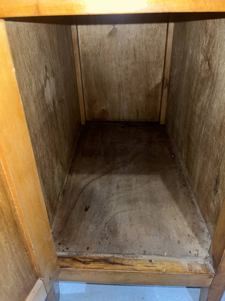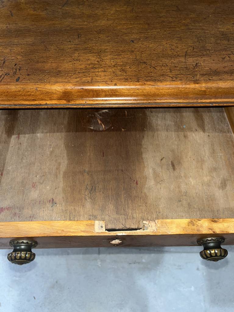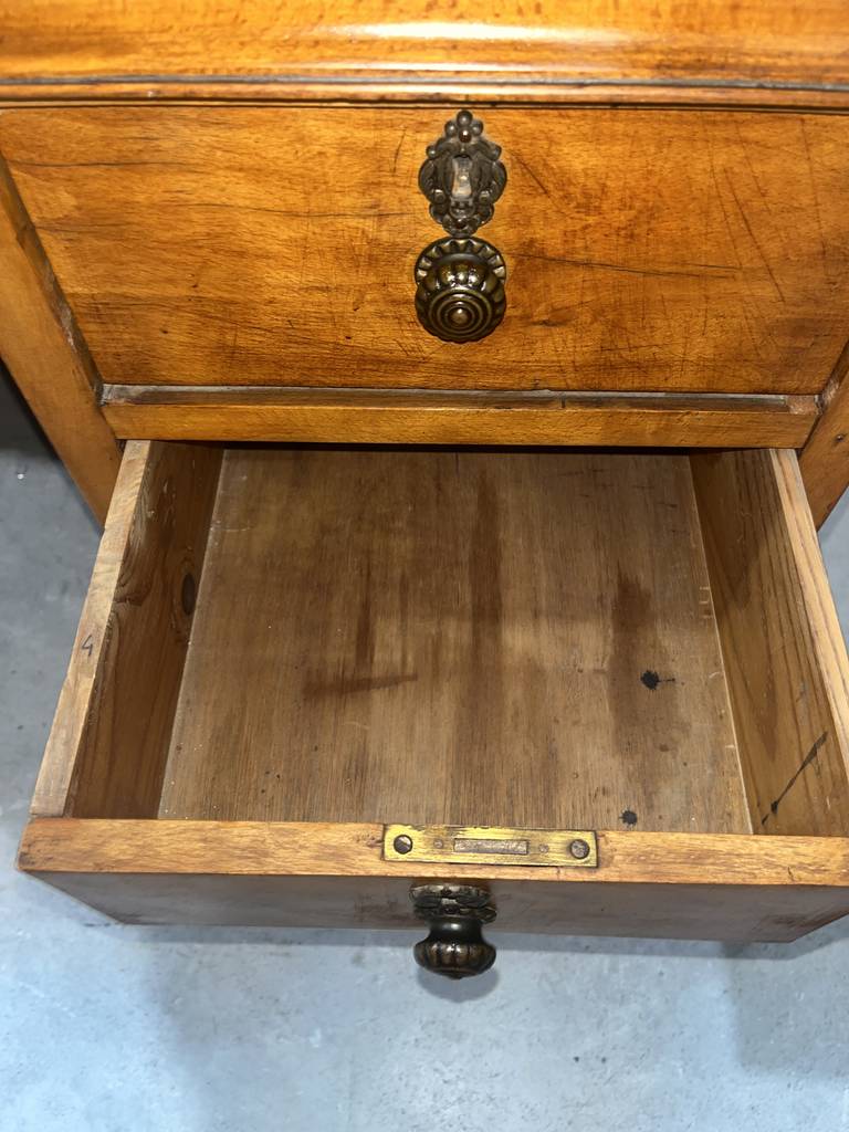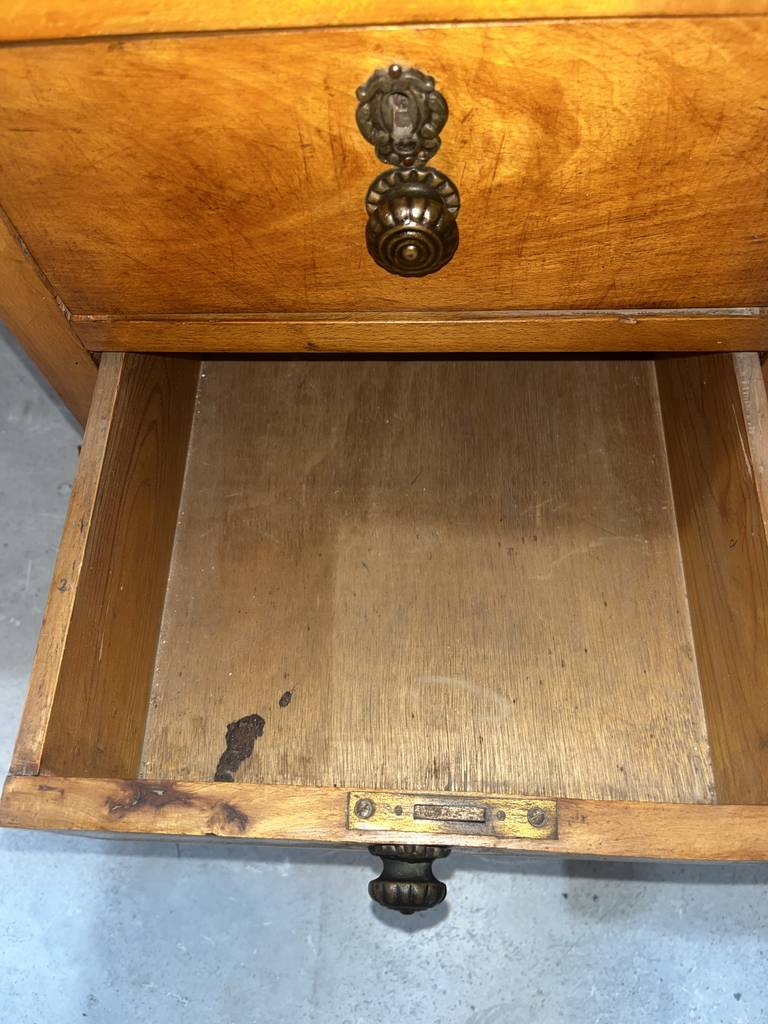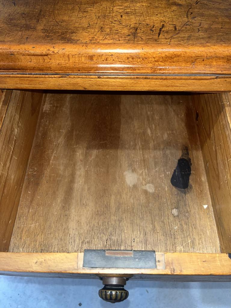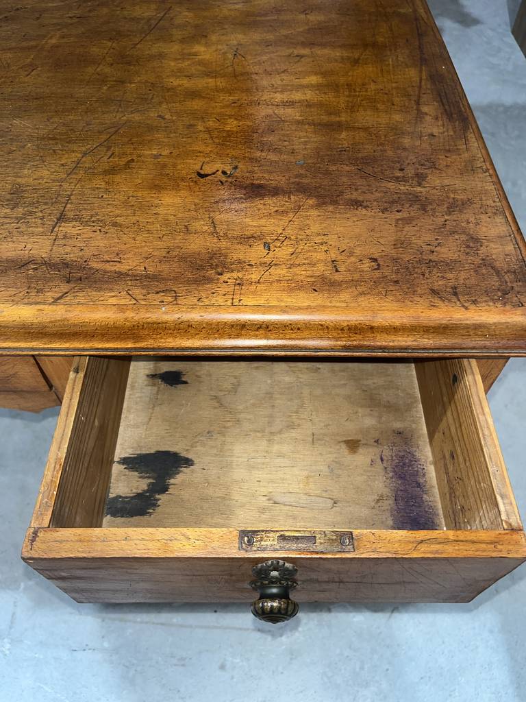 Antiguo escritorio fabricado en madera de buena calidad de color marrón claro. Se trata de un antiguo escritorio que cuenta con cuatro cajones en un lateral y una puerta con otro cajón en el otro lateral, además en la zona central cuenta con otro cajón. Es un escritorio ideal para colocarlo en un estudio del hogar para estudiar o trabajar en él. Como se puede observar en las fotografías se encuentra en buenas condiciones.