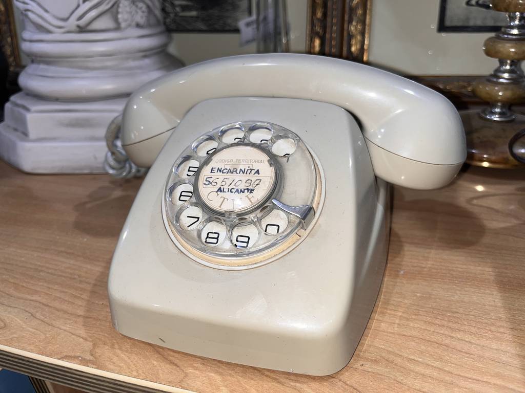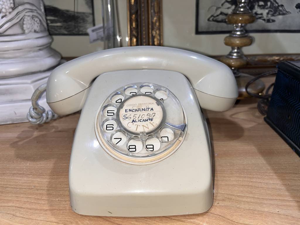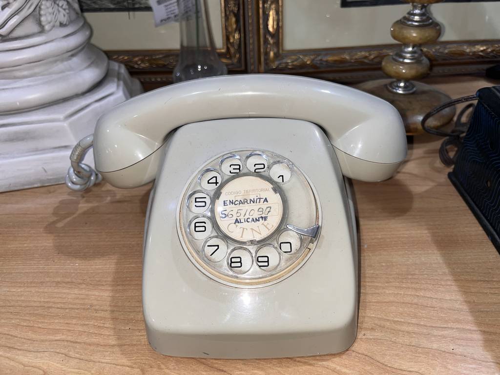 Teléfono de estilo clásico de color gris claro. Se trata de un teléfono clásico formado por un auricular y la base que tiene una rueda en la que aparecen los números para poder marcar. Es un teléfono perfecto para tenerlo en el hogar si eres un nostálgico de este tipo de objetos vintage. Como se puede observar en las fotografías se encuentra en buenas condiciones.
