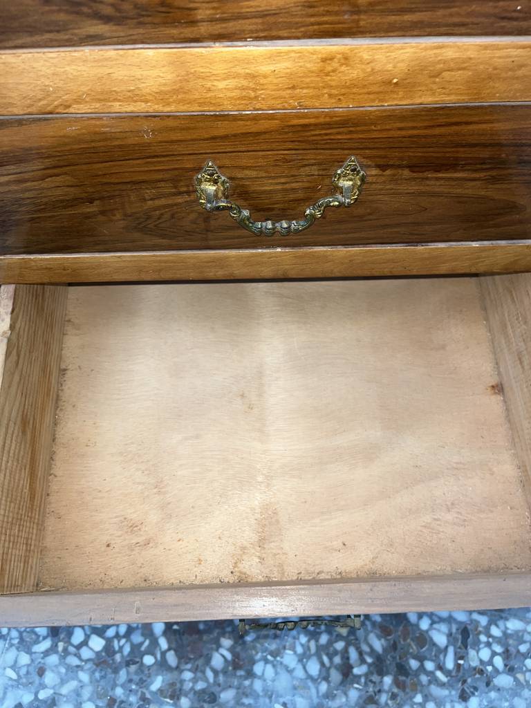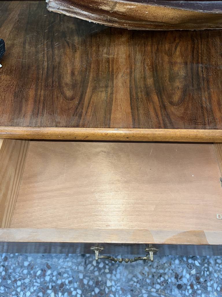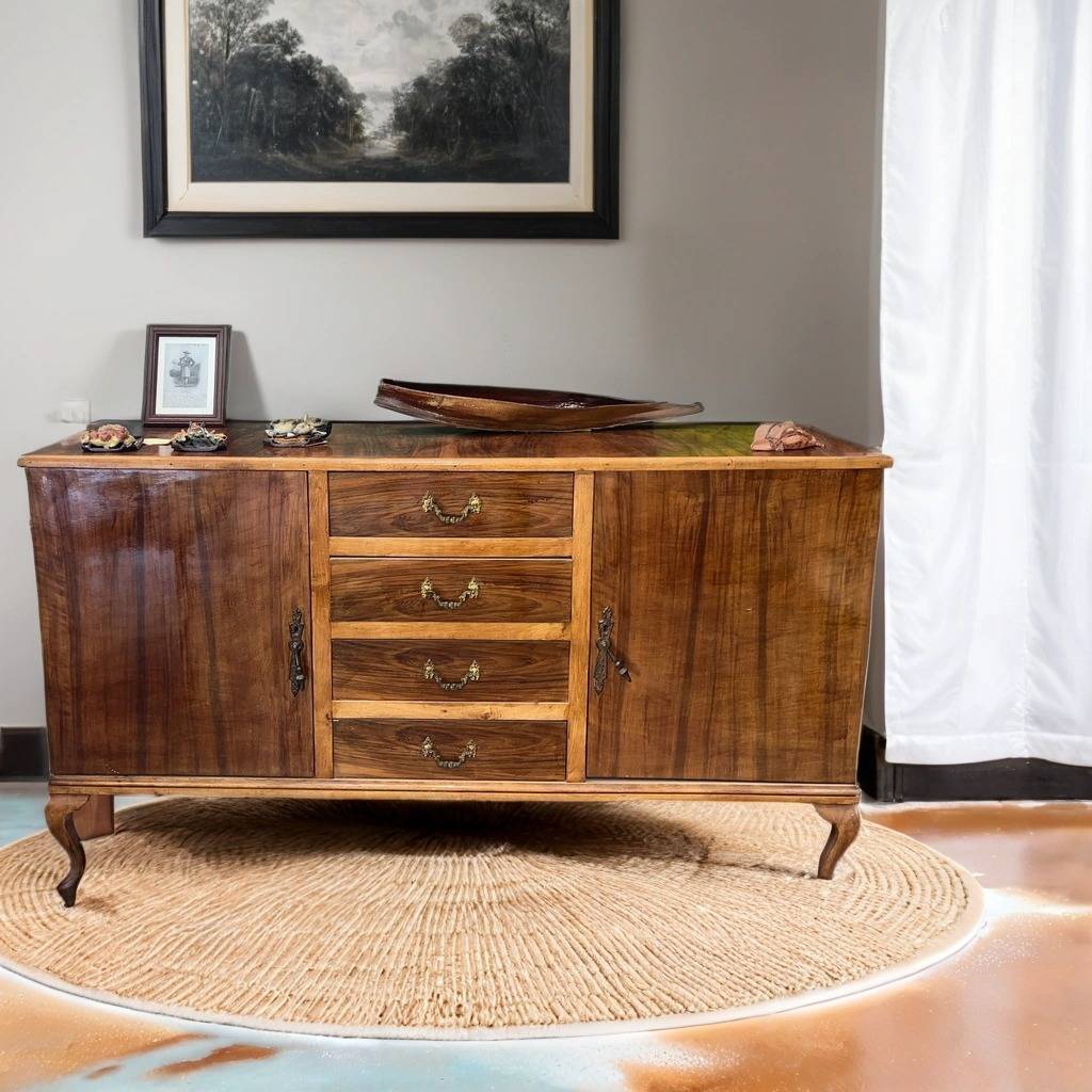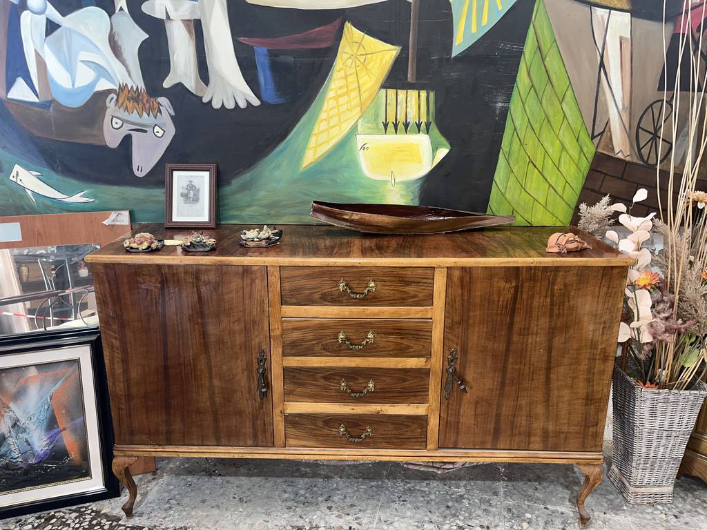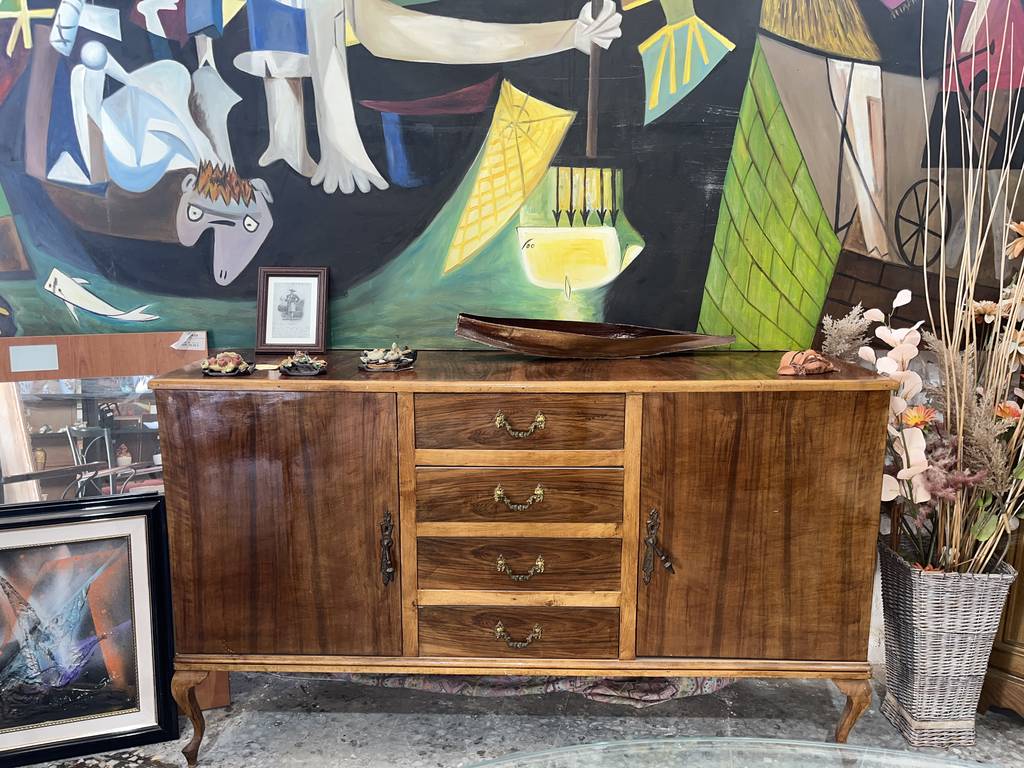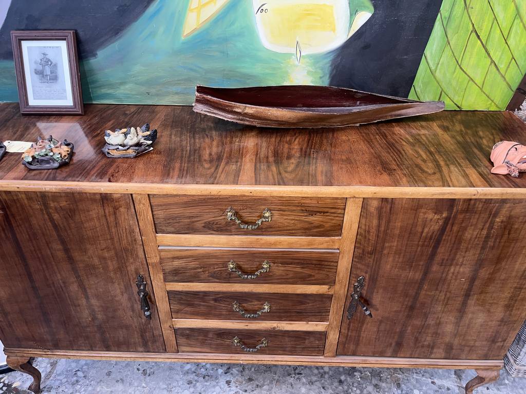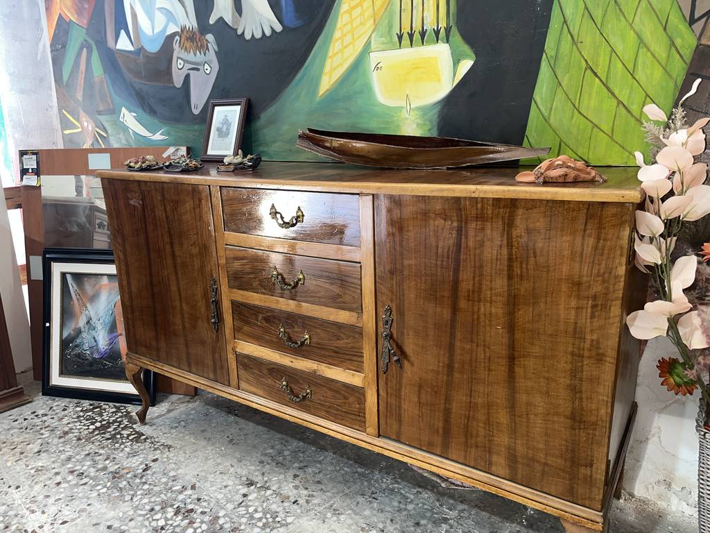 Aparador de estilo clásico que ha sido fabricado con madera de buena calidad y robusta. Se compone de una parte frontal con cuatro cajones centrales y dos puertas laterales con compartimentos en su interior. Todos incorporan tiradores metálicos para abrirlos fácilmente. Es un aparador ideal para colocar en un salón comedor. Como podemos observar en las fotografías se encuentra para restaurar.