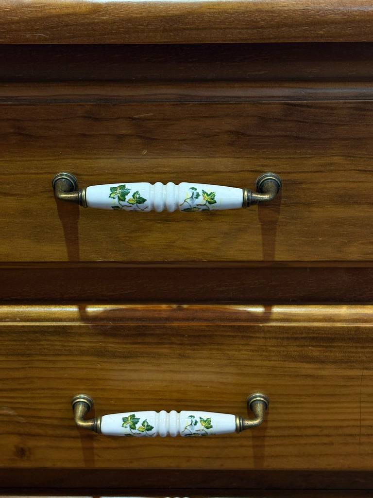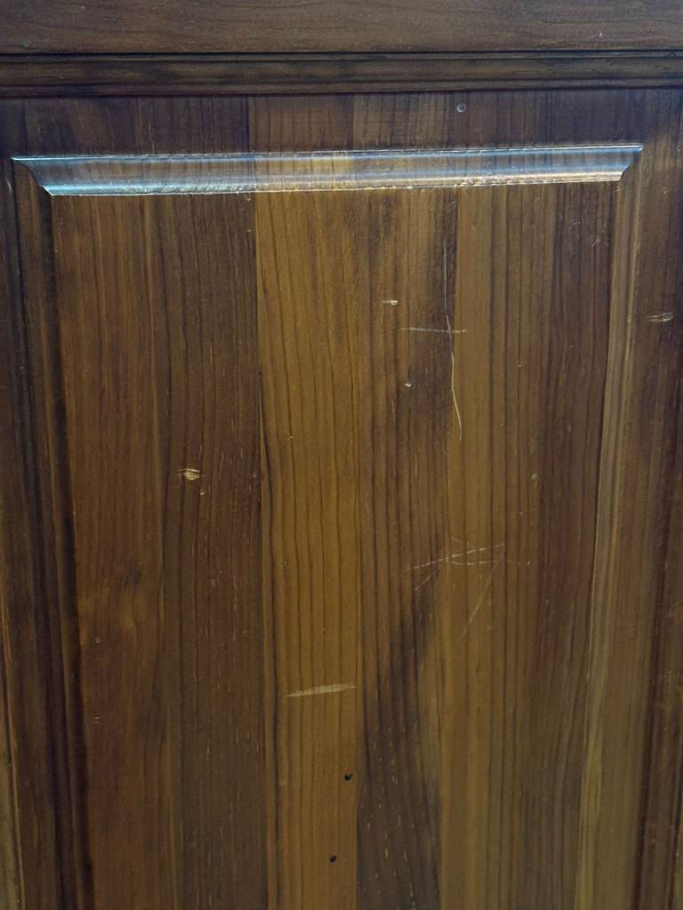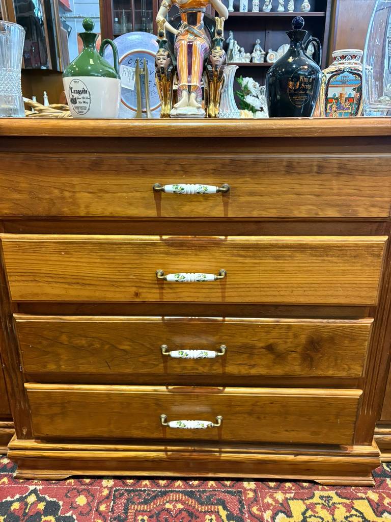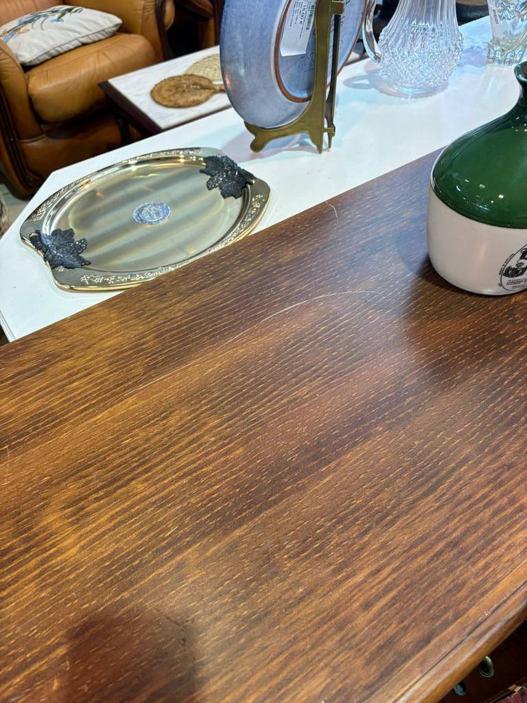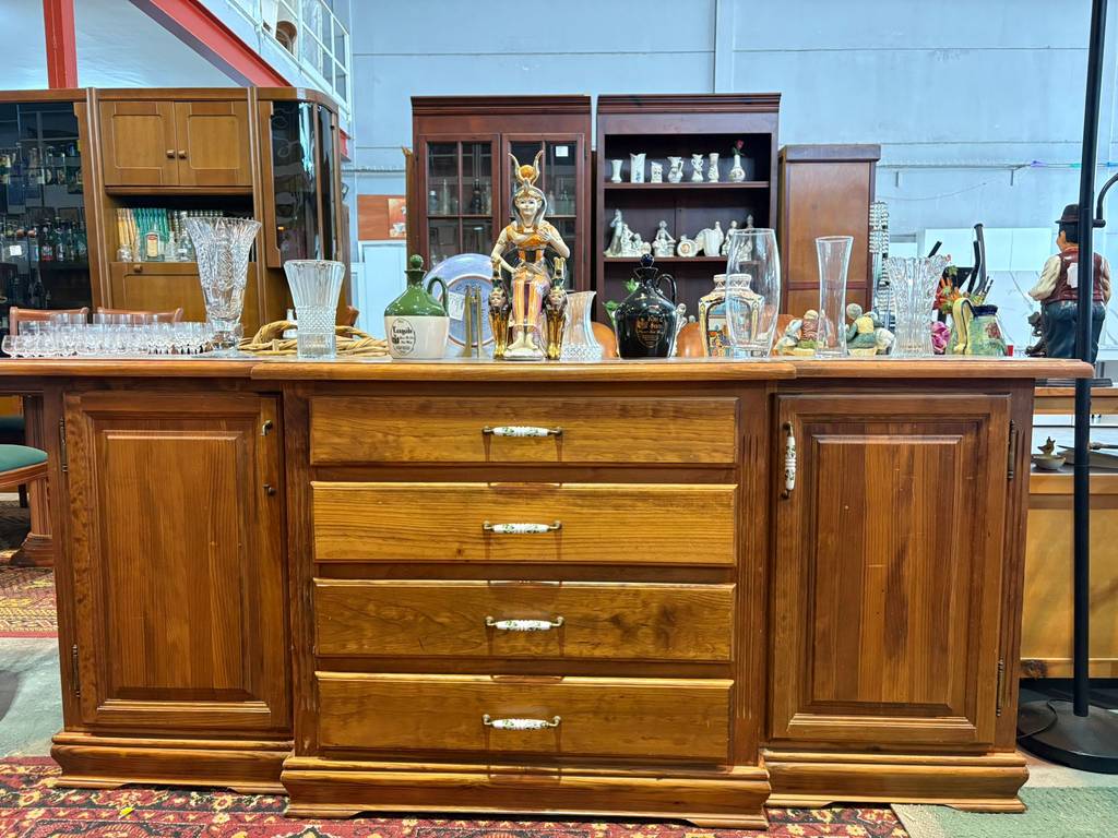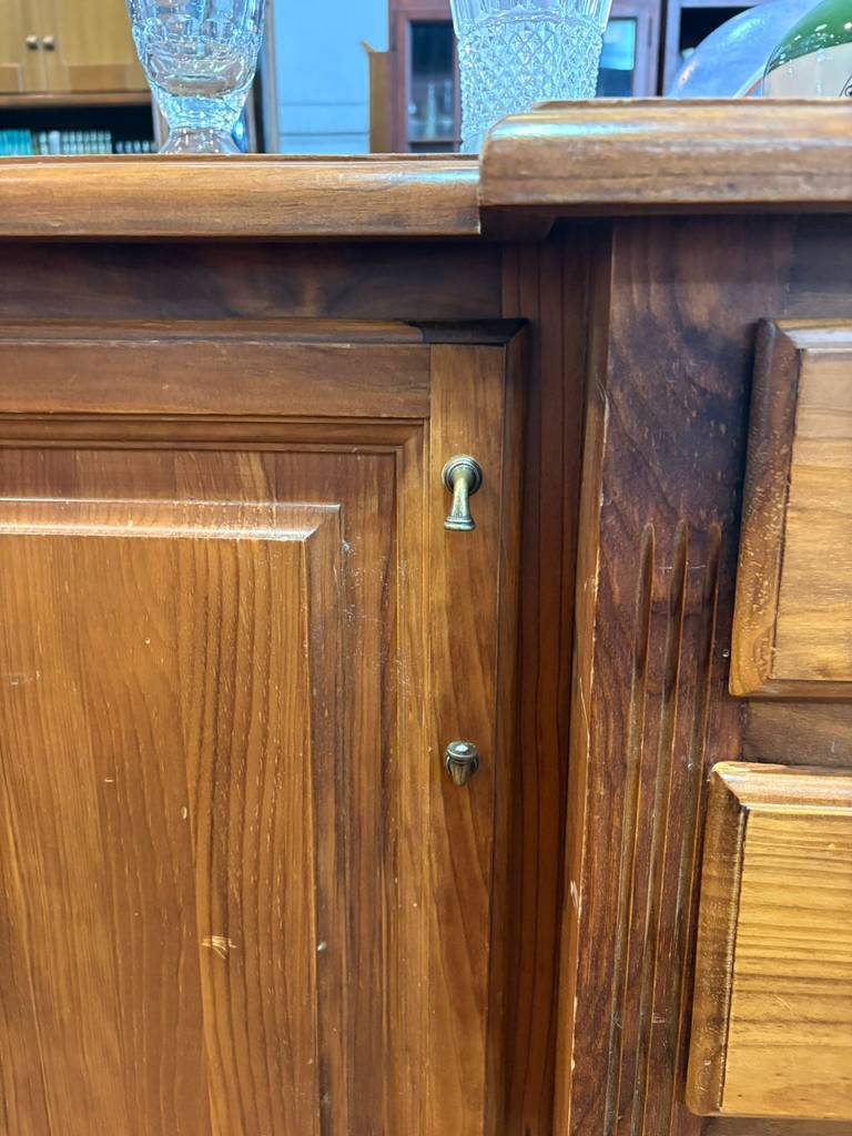 Aparador clásico fabricado en madera maciza de buena calidad de color marrón claro. Se trata de un mueble aparador que cuenta con cuatro cajones alargados en la parte central y tiene dos puertas amplias en ambos laterales. Es un mueble muy práctico perfecto para colocarlo en un salón comedor. Como se puede observar en las fotografías se encuentra ligeramente deteriorado por el uso.