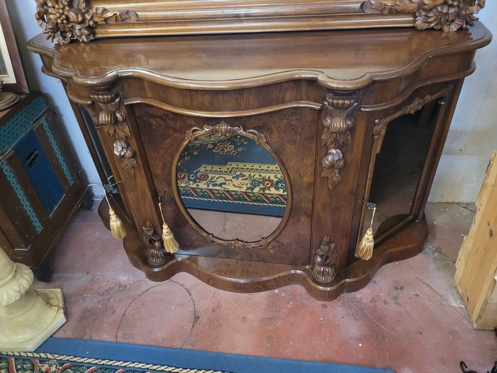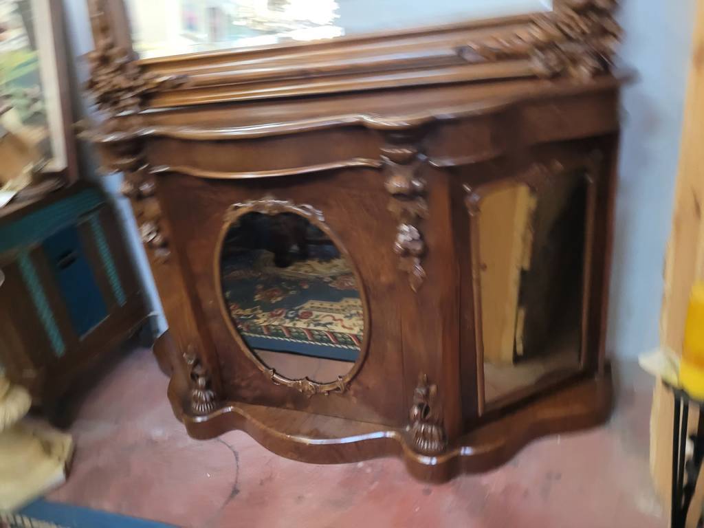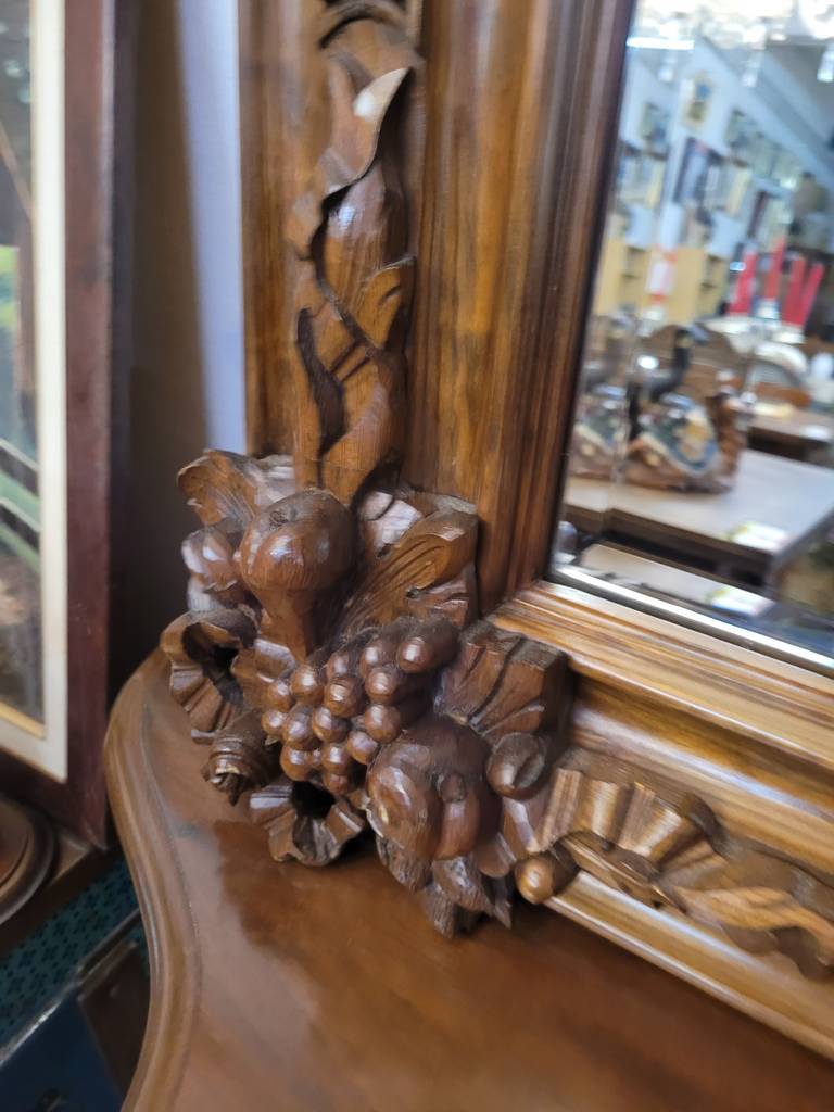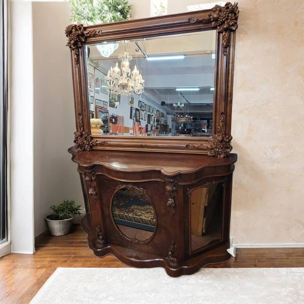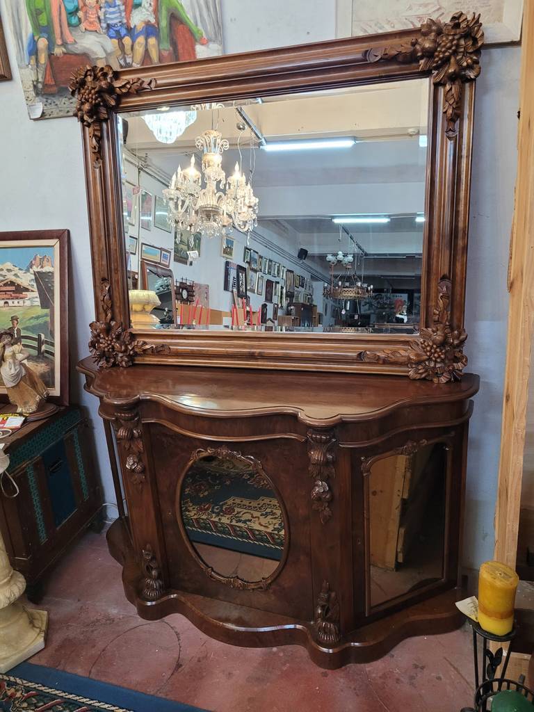 Aparador con espejo con un estilo clásico muy bonito y elegante. El espejo dispone de un marco de madera con detalles tallados en las esquinas que lo hacen resaltar. El aparador contiene en la parte frontal tres puertas con espejos con compartimentos en su interior con llave incluida. Es ideal para colocar en un salón comedor. Como podemos observar en las fotografías se encuentra en buenas condiciones.