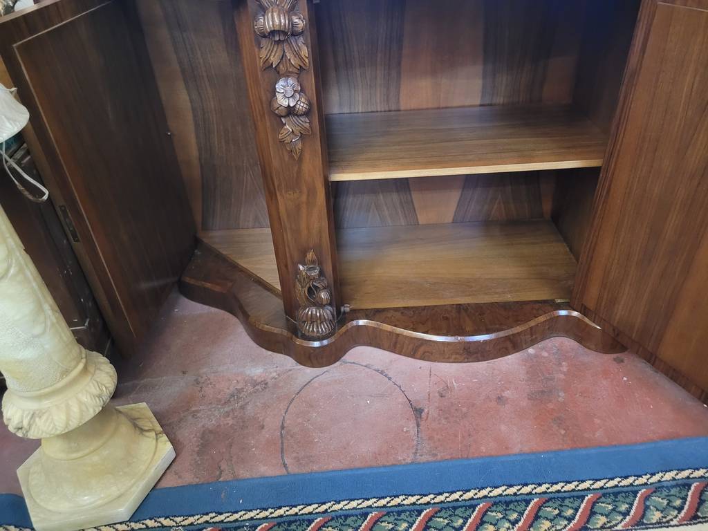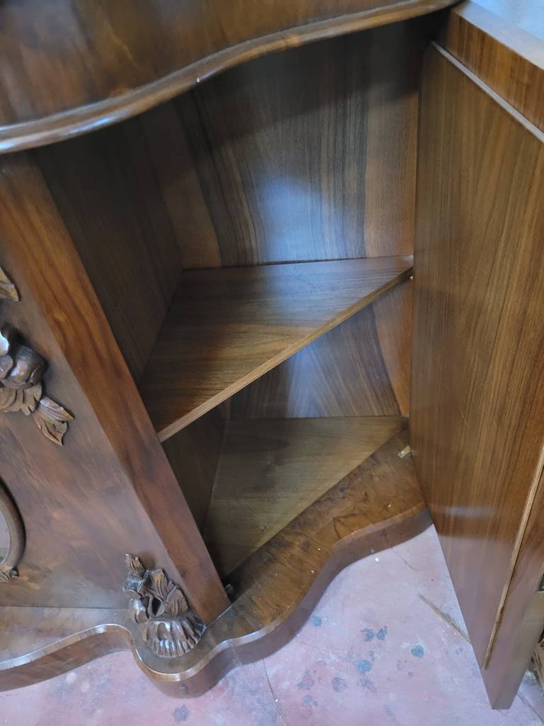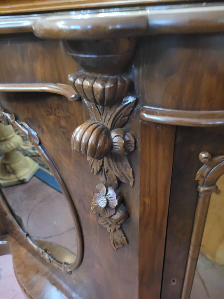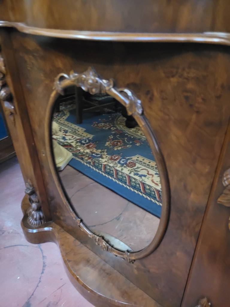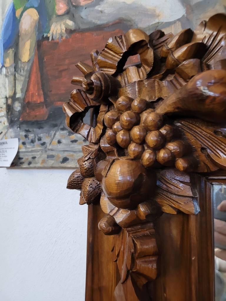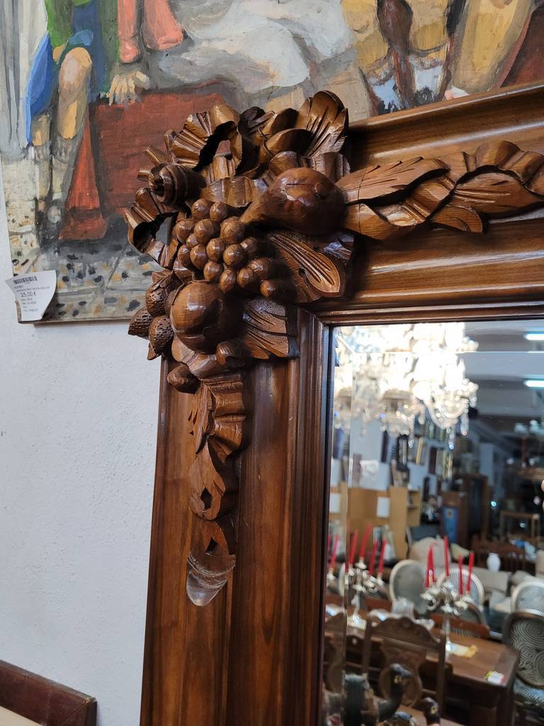 Aparador con espejo con un estilo clásico muy bonito y elegante. El espejo dispone de un marco de madera con detalles tallados en las esquinas que lo hacen resaltar. El aparador contiene en la parte frontal tres puertas con espejos con compartimentos en su interior con llave incluida. Es ideal para colocar en un salón comedor. Como podemos observar en las fotografías se encuentra en buenas condiciones.