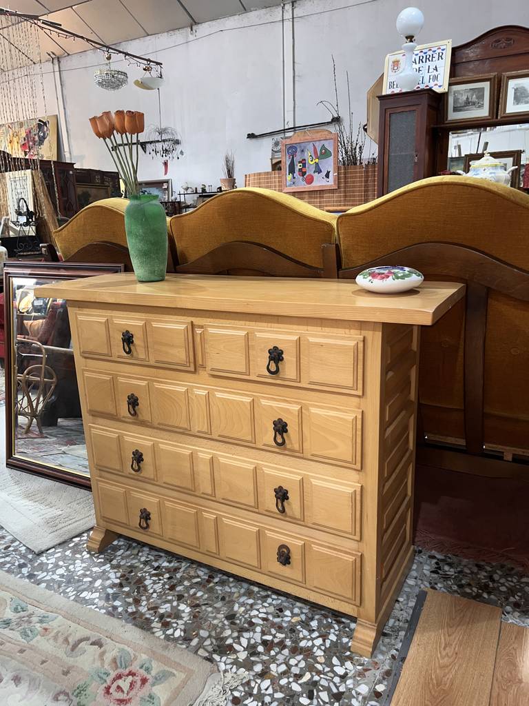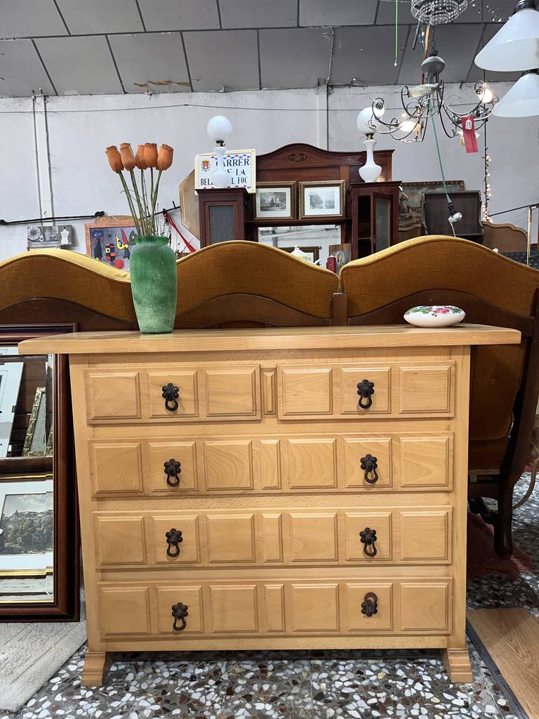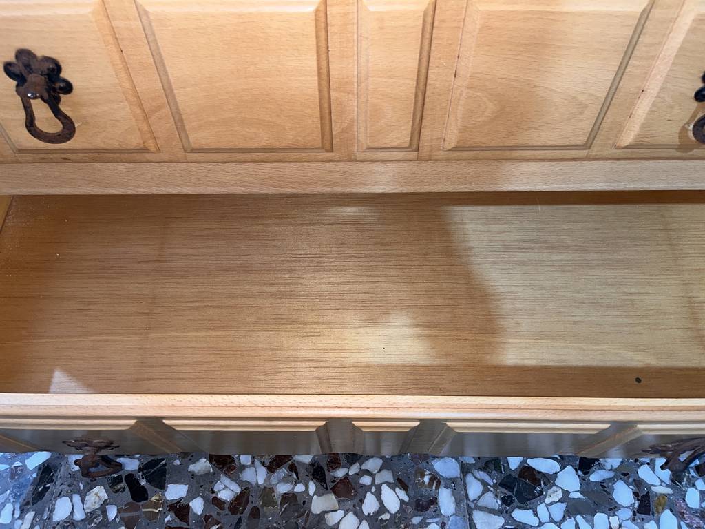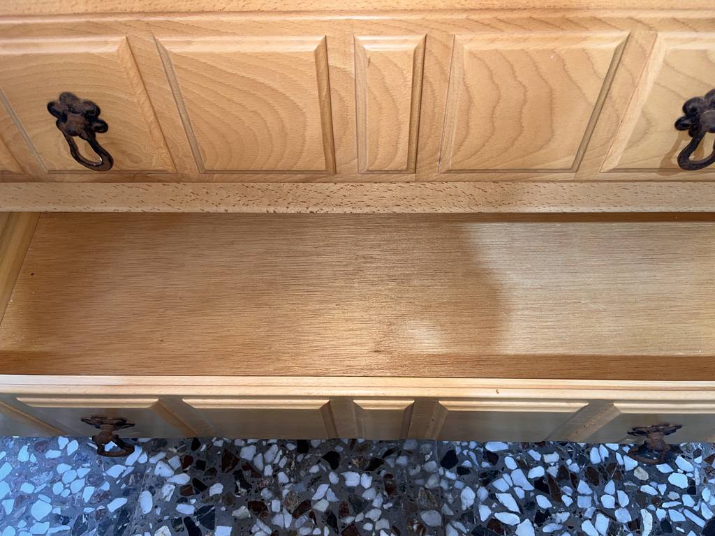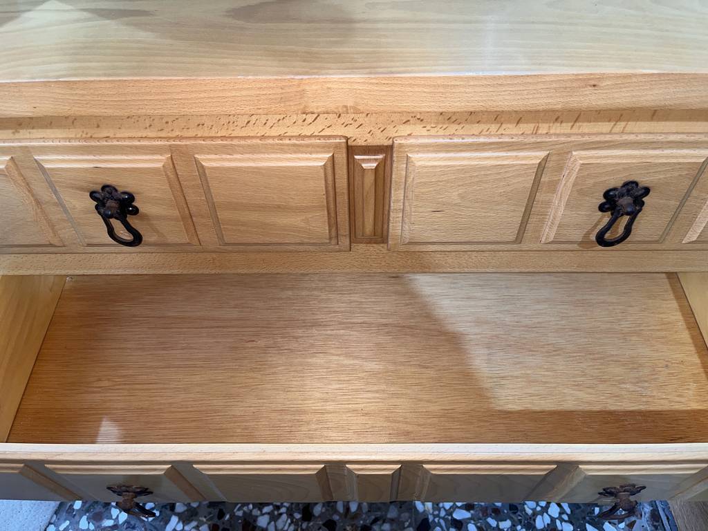 Aparador de color marrón claro que ha sido fabricado con madera de buena calidad y robusta. Se trata de un aparador compuesto por un tablón rectangular en la parte superior y en la parte frontal con dos cajones pequeños y tres grandes con tiradores en el centro para ser abiertos fácilmente. Es ideal para colocar como recibidor, por ejemplo. Como podemos observar en las fotografías se encuentra en buenas condiciones.
