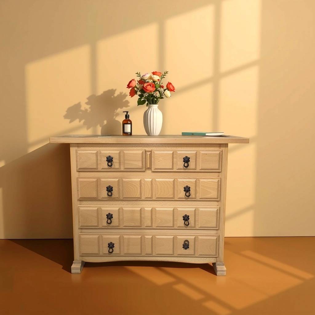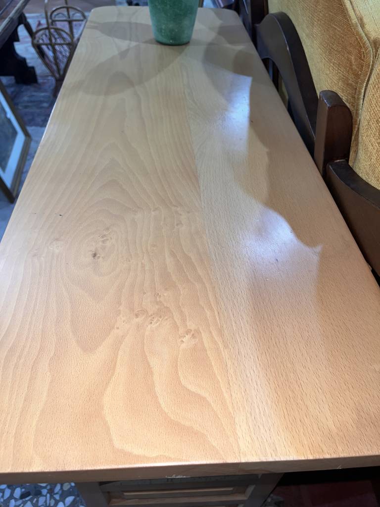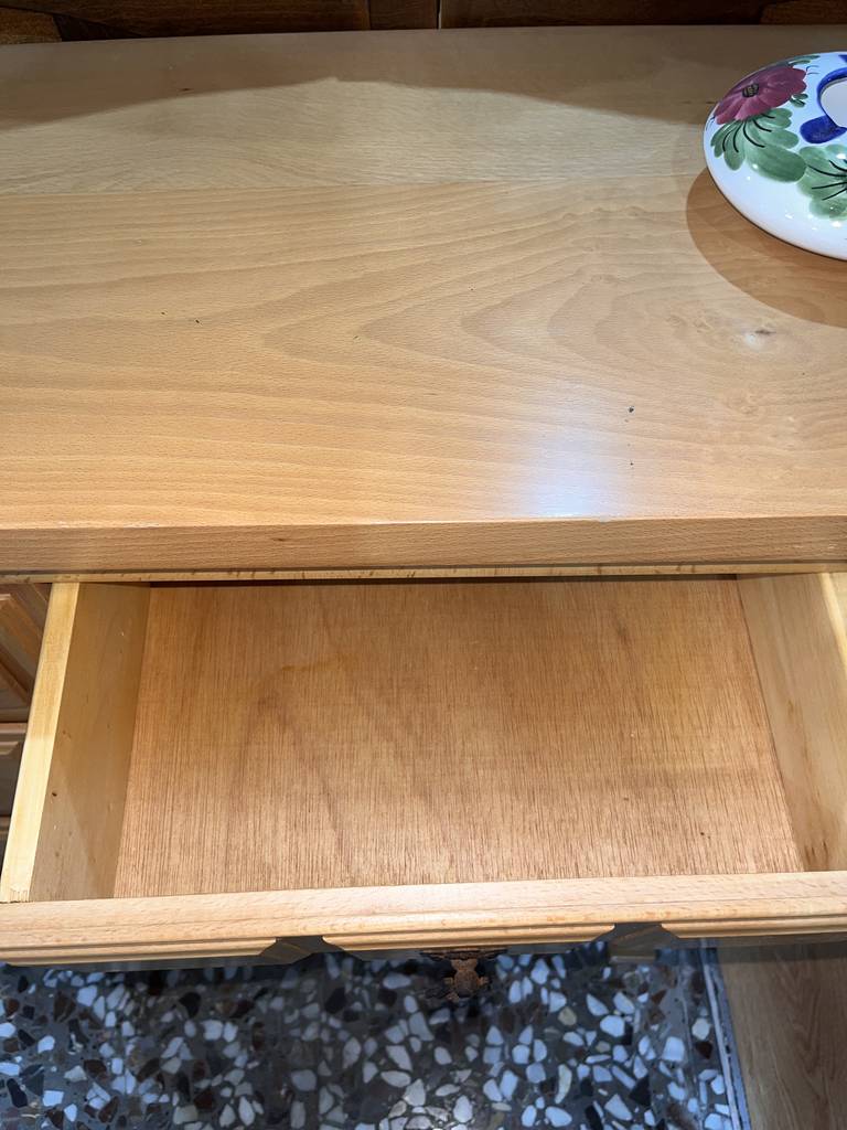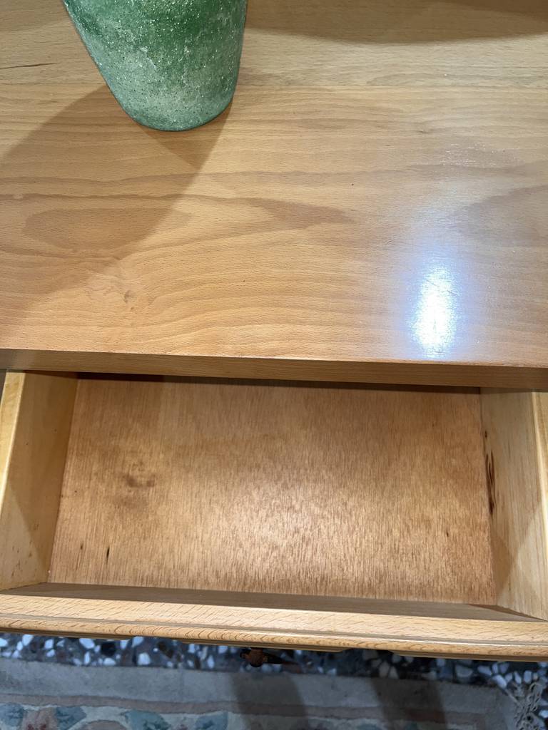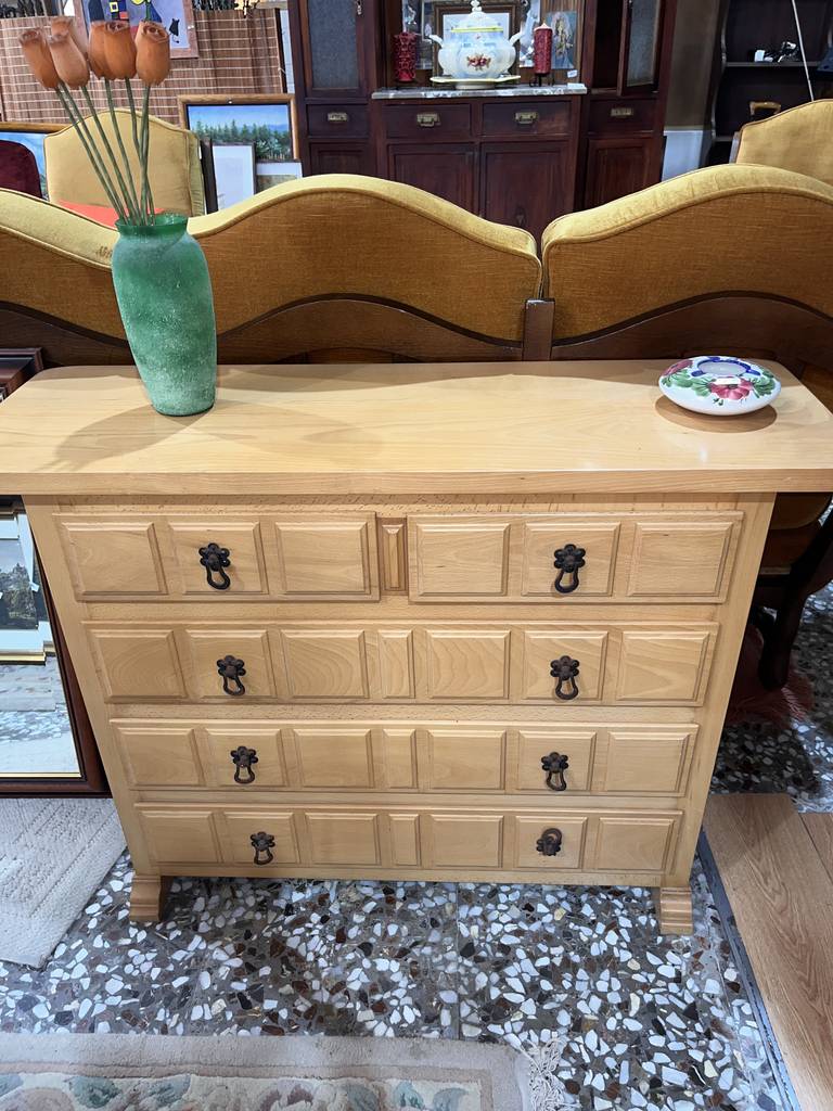 Aparador de color marrón claro que ha sido fabricado con madera de buena calidad y robusta. Se trata de un aparador compuesto por un tablón rectangular en la parte superior y en la parte frontal con dos cajones pequeños y tres grandes con tiradores en el centro para ser abiertos fácilmente. Es ideal para colocar como recibidor, por ejemplo. Como podemos observar en las fotografías se encuentra en buenas condiciones.