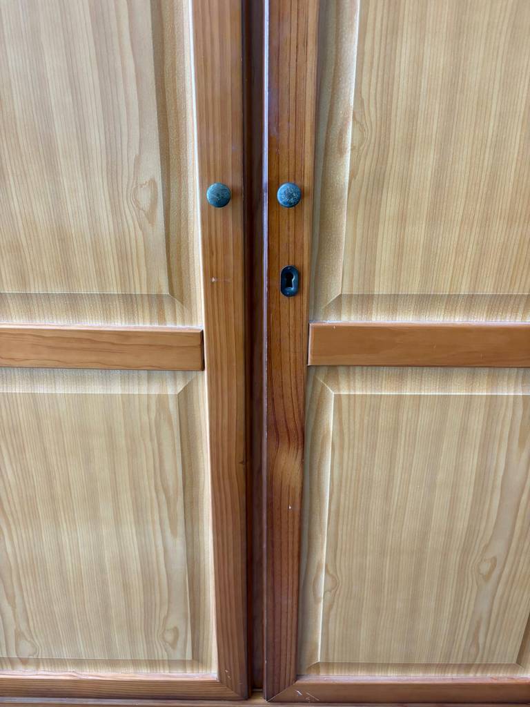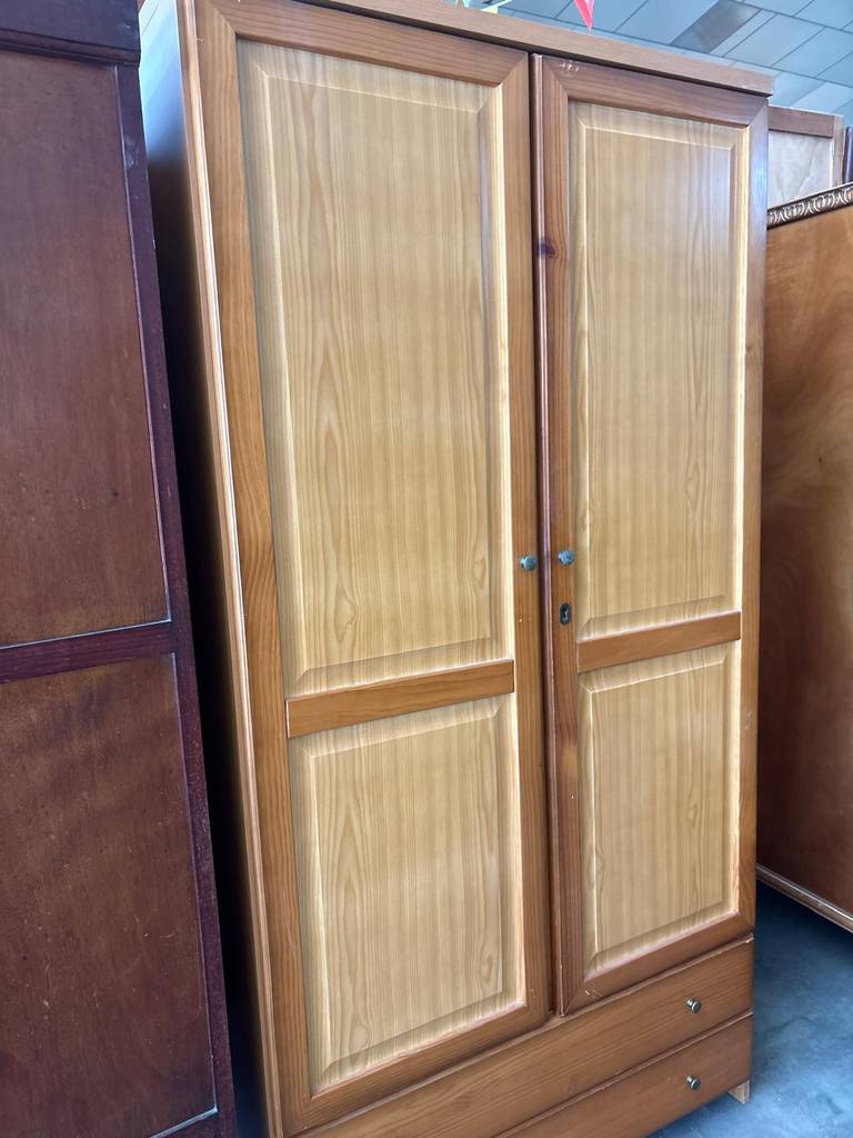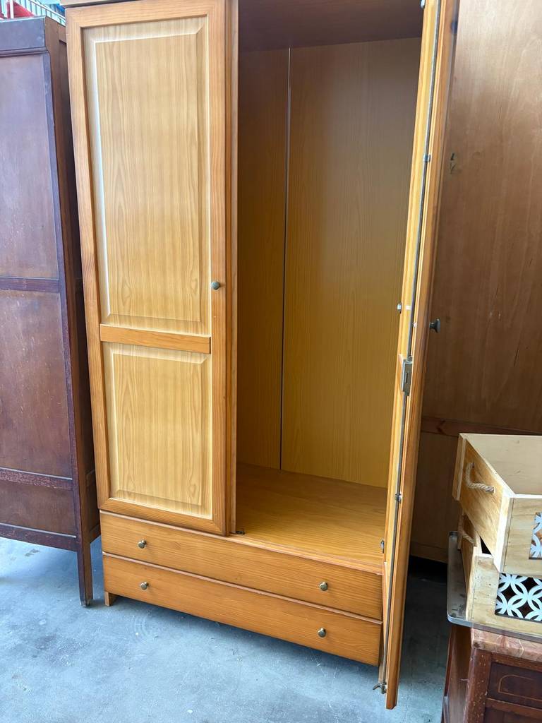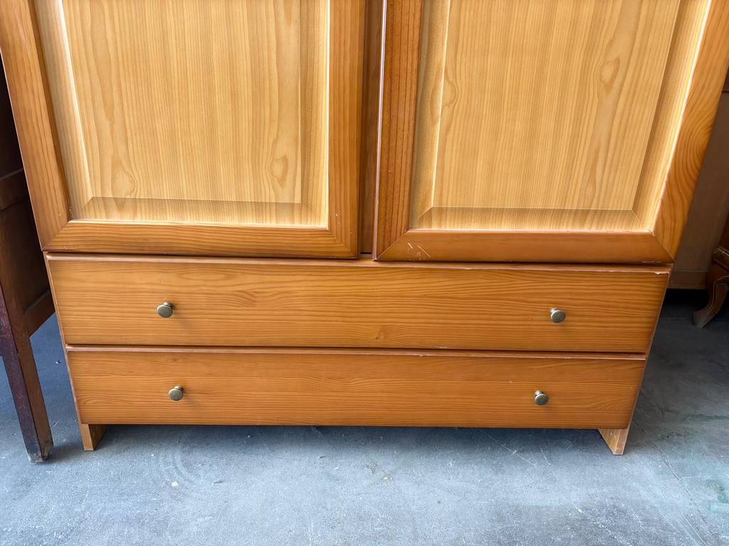 Armario que ha sido fabricado con madera de buena calidad y robusta. Se compone de dos puertas superiores y de dos cajones amplios en la parte inferior. En su interior dispone de gran espacio de almacenamiento haciéndolo ideal para guardar ropa o sábanas. Queda perfecto en un vestidor o dormitorio. Como podemos observar en las fotografías se encuentra con rasguños.