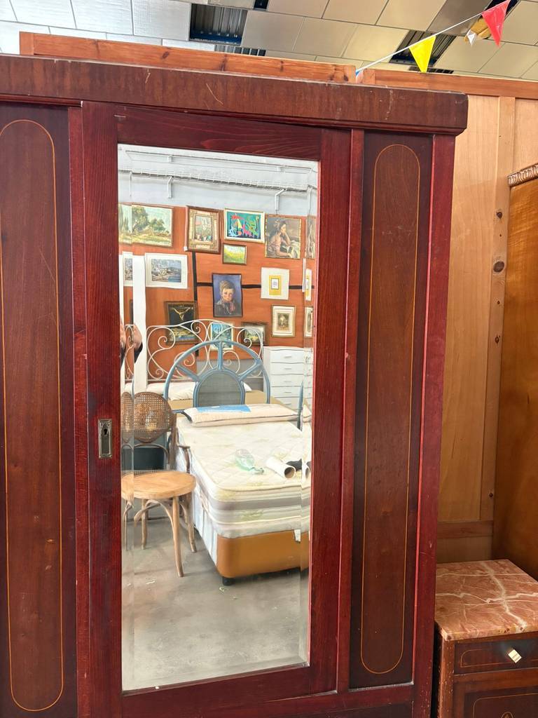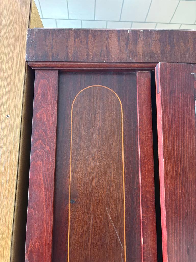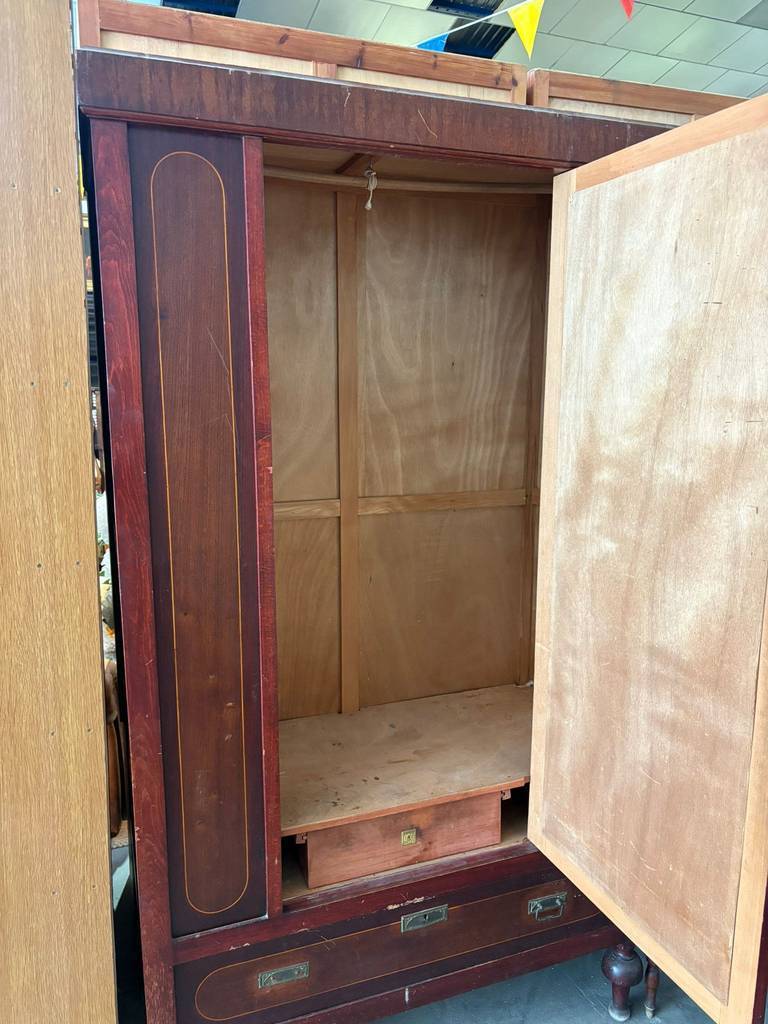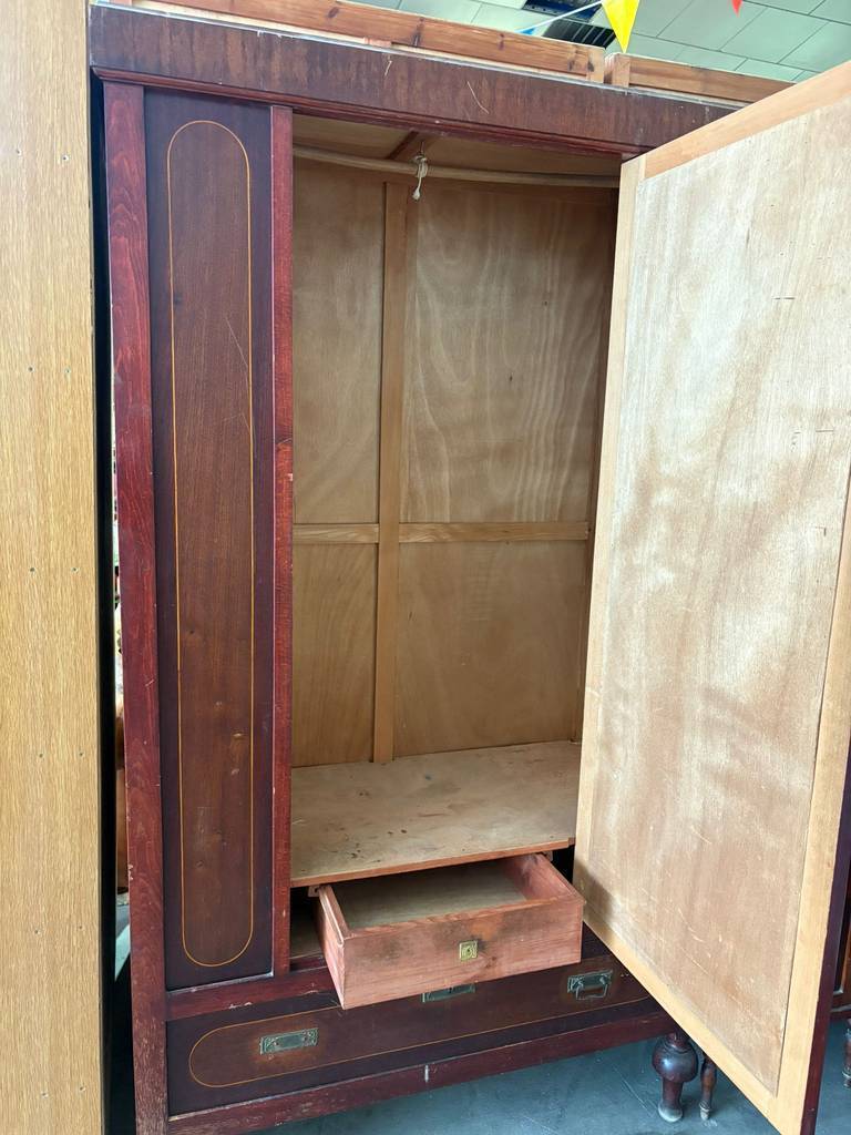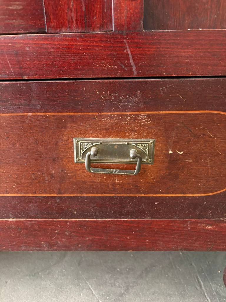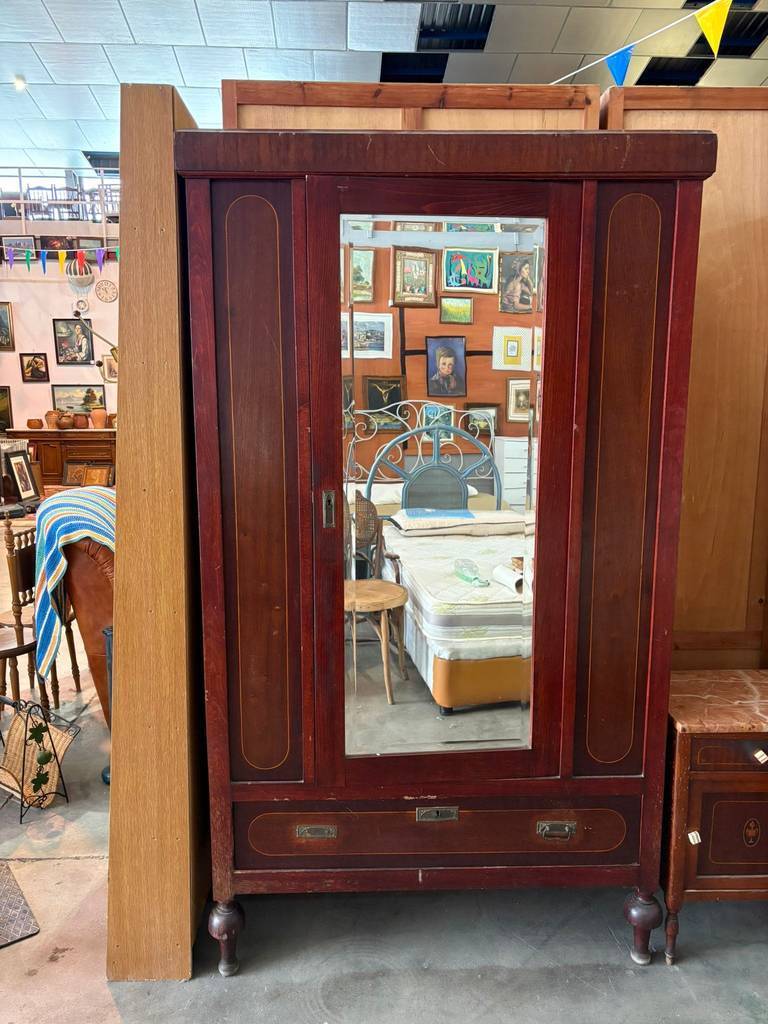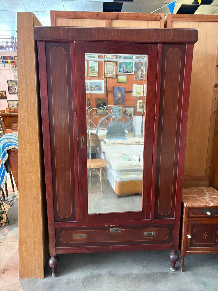 Armario antiguo fabricado en madera de buena calidad de color granate. Se trata de un armario de gran tamaño que cuenta con un cajón en la parte inferior y una puerta con un cristal externo en la parte superior. Es un armario ideal para colocarlo en un dormitorio individual de estilo clásico. Como se puede observar en las fotografías se encuentra en buenas condiciones.