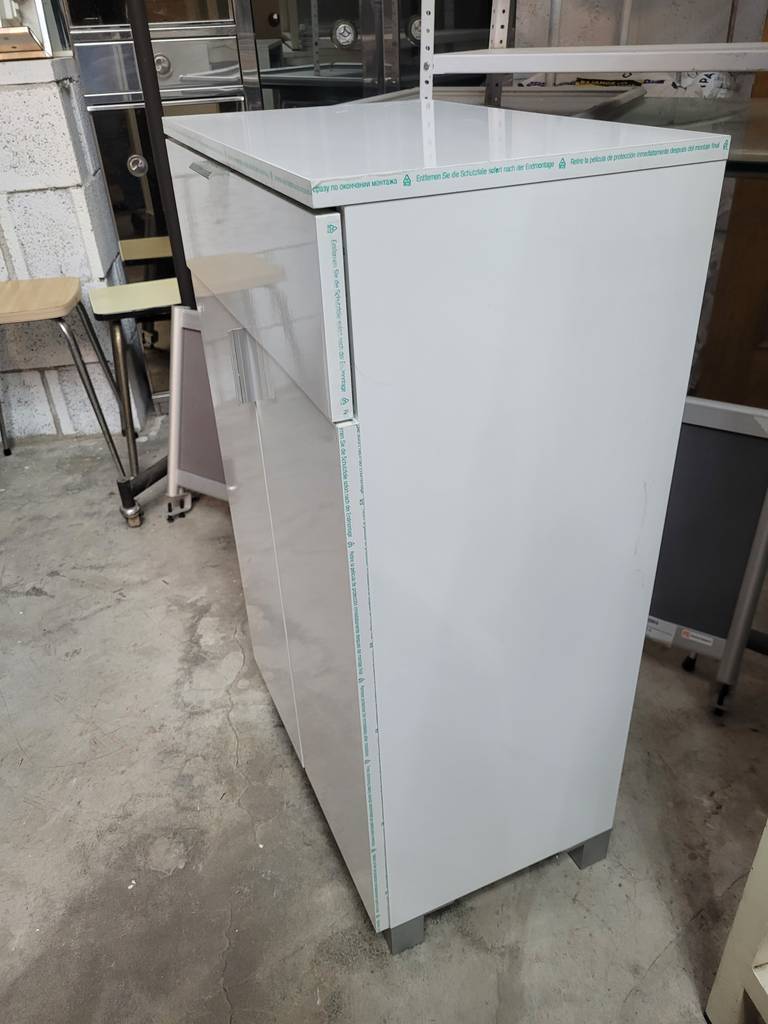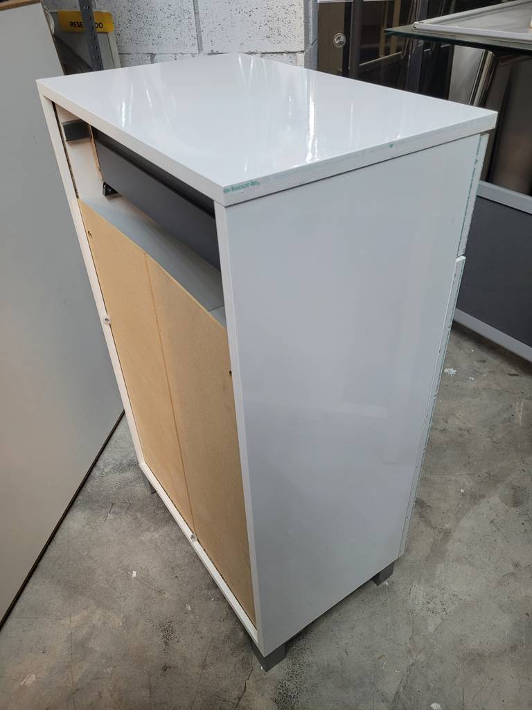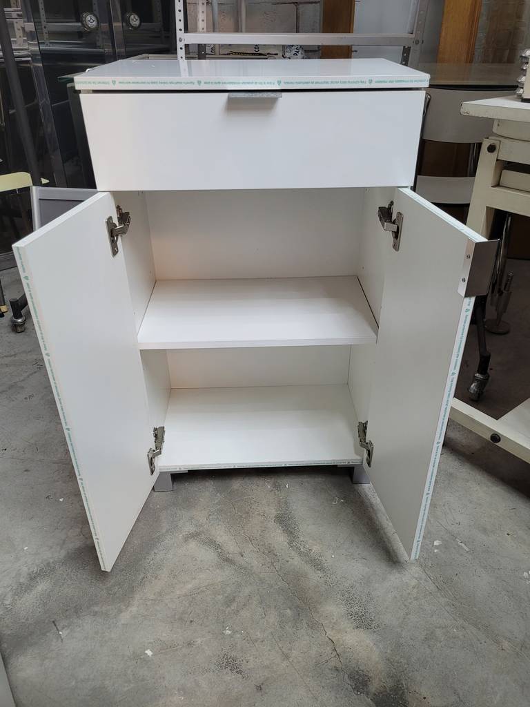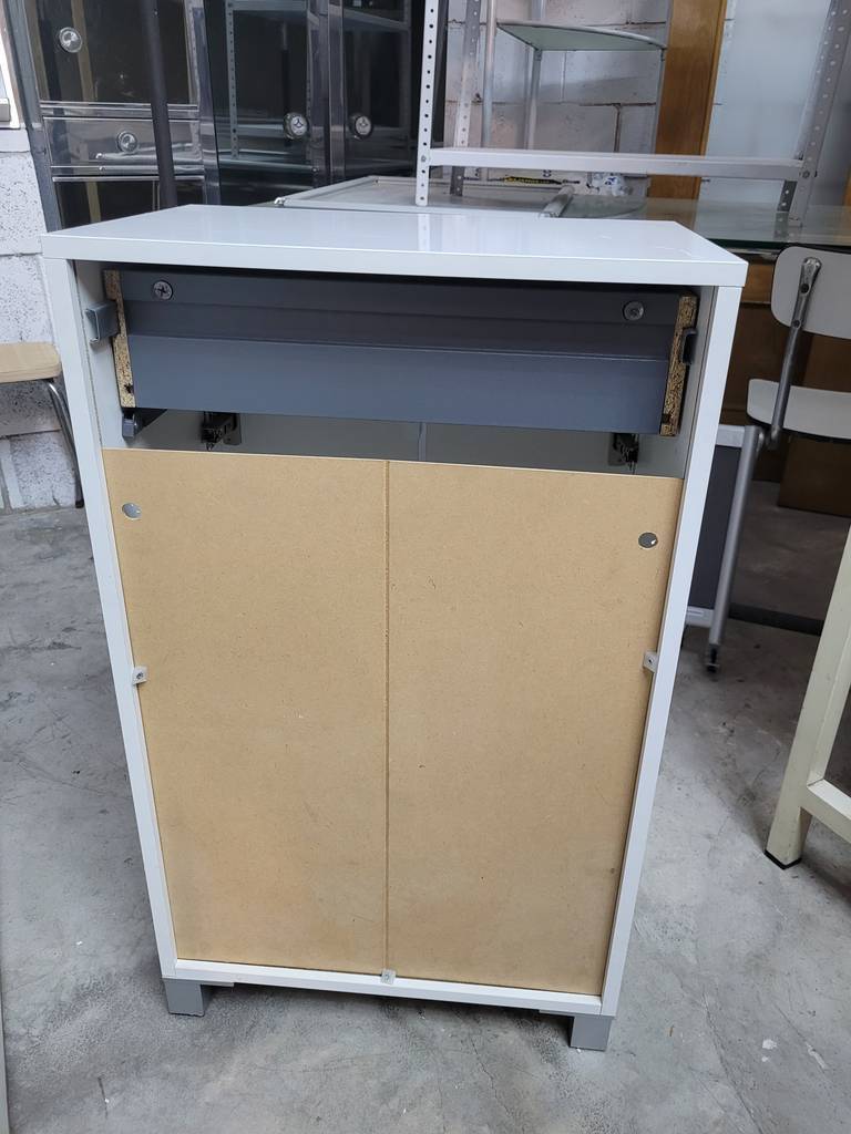 Armario auxiliar para baño de estilo bajo en color blanco que ha sido fabricado con madera de buena calidad y robusta. Se compone de un cajón superior extraíble y en la parte inferior dos puertas con un compartimento bajo de dos habitáculos abiertos separados por una leja. Es ideal para almacenar enseres de aseo y toallas. Como podemos observar en las fotografías se encuentra en buenas condiciones.