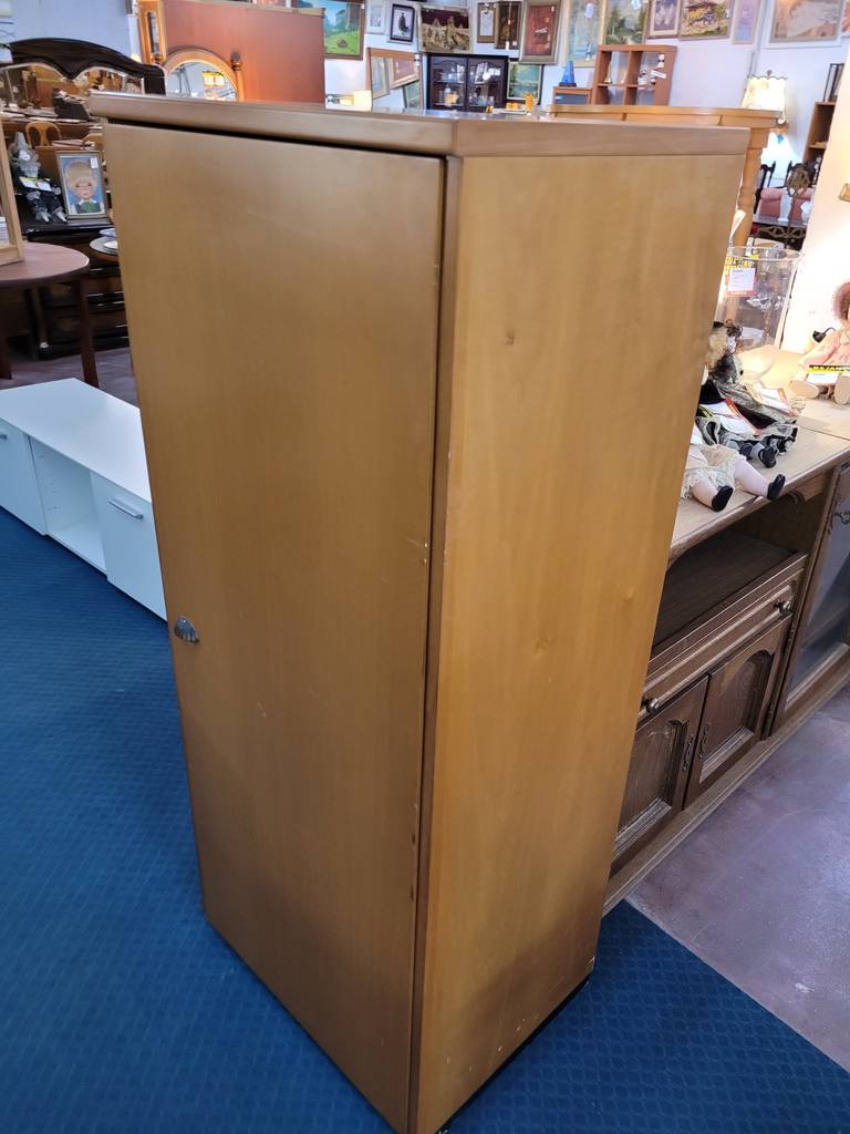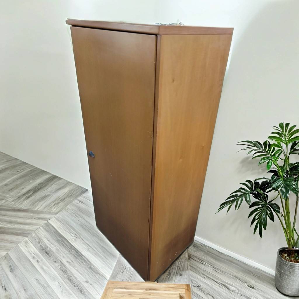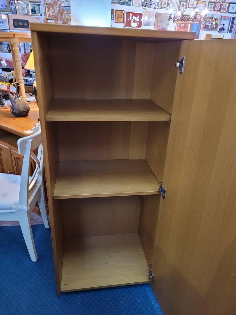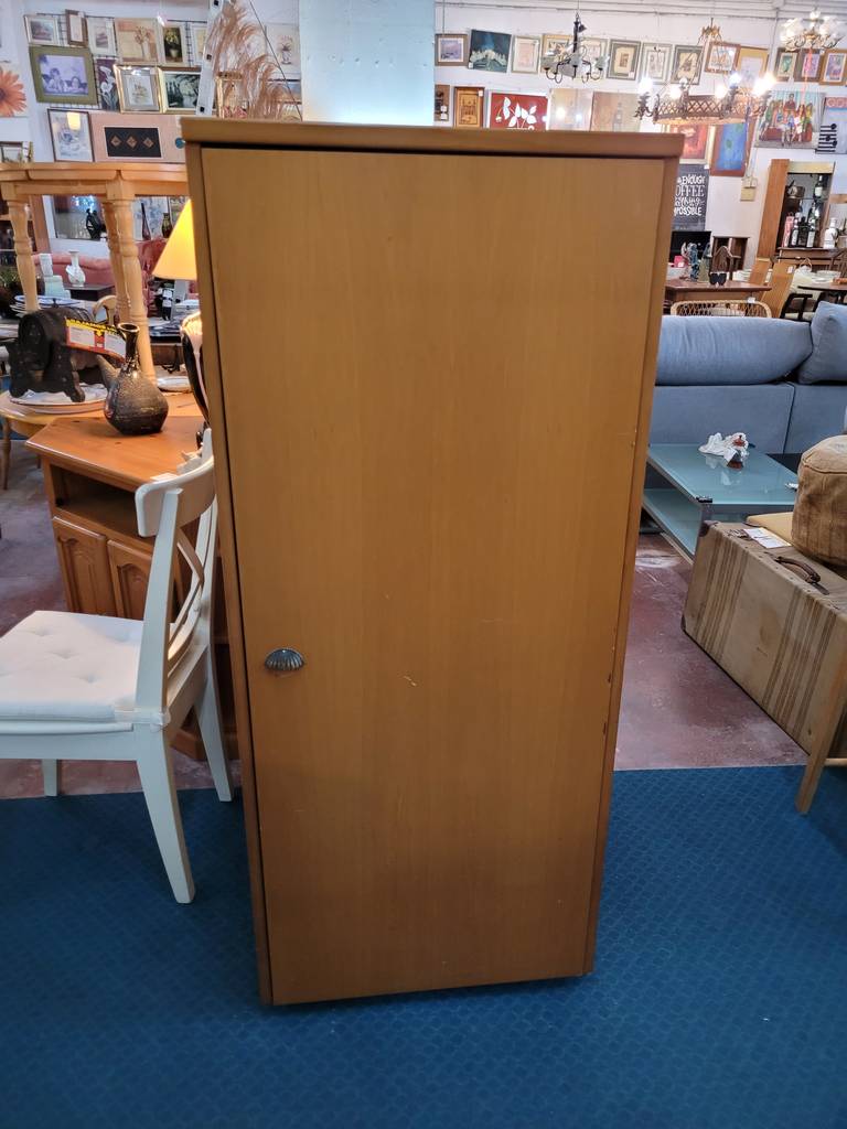 Armario bajo que ha sido fabricado con madera de buena calidad y robusta. Se compone de una puerta frontal con un bonito tirador en forma de media concha. En su interior dispone de tres habitáculos abiertos altos separados por lejas. Como podemos observar en las fotografías presenta ligeros rasguños, pero en general se encuentra en buenas condiciones.